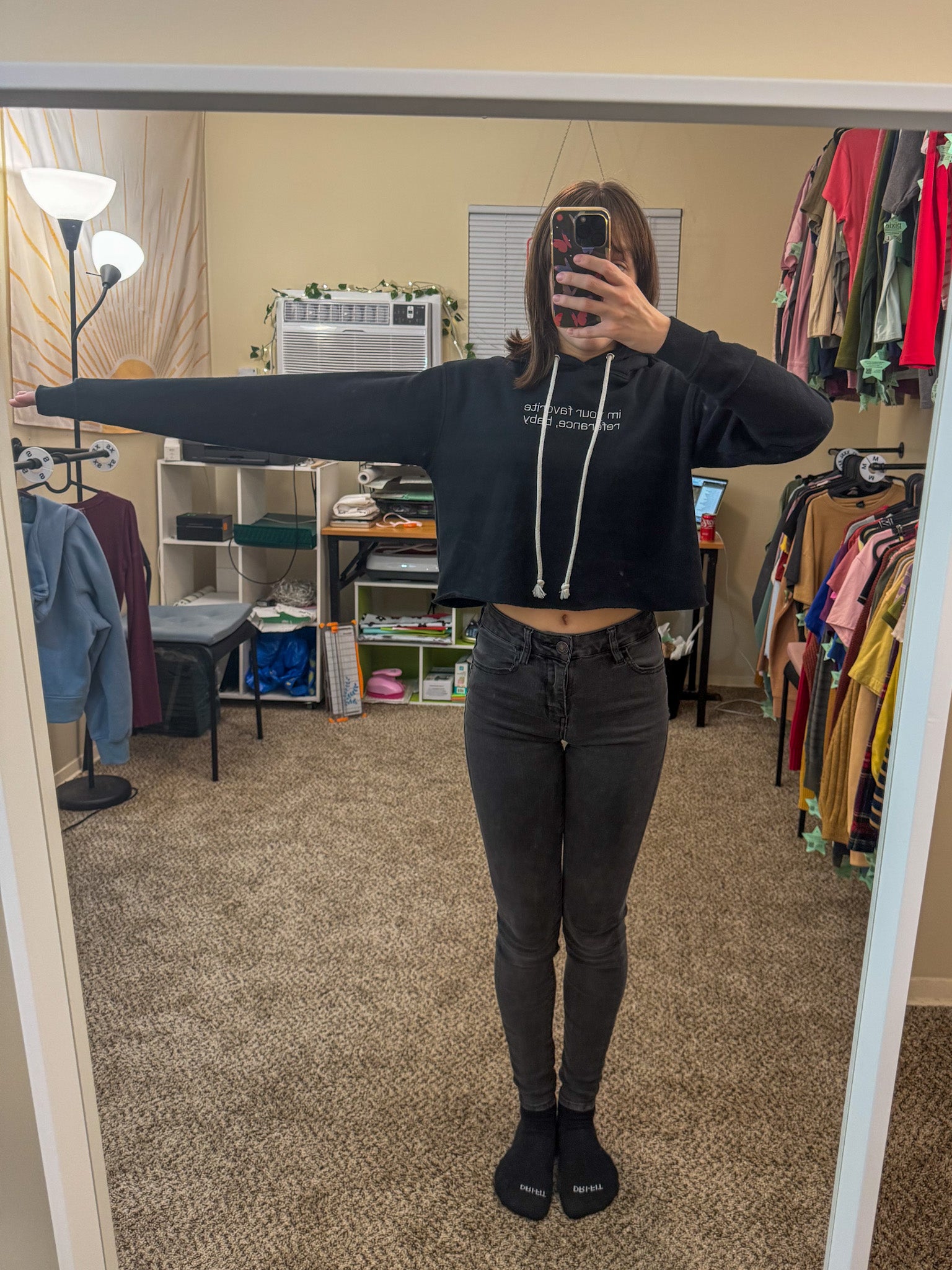 This 360 Black Cropped Hoodie is not your average hoodie! Embroidered by us and upcycled from a discarded secondhand garment, it's a sustainable and stylish choice. Plus, you'll be supporting our small biz and embracing slow fashion!