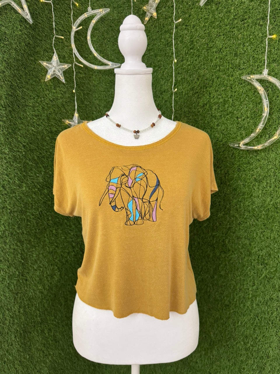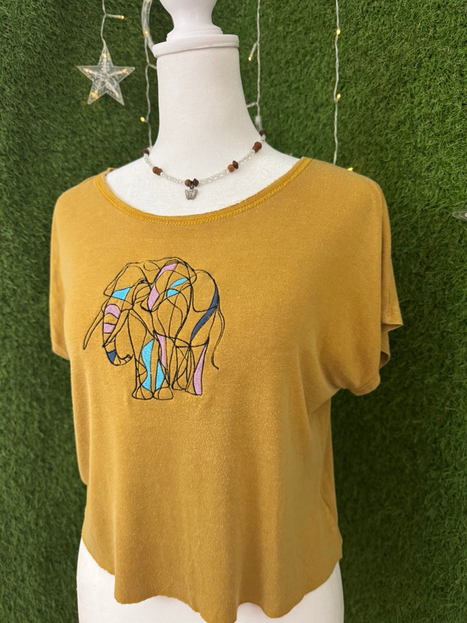 The Abstract Elephant Cropped Tee is a playful blend of style and sustainability. With delightful embroidered details and crafted from a pre-loved garment, this slow fashion gem adds a unique, eco-friendly touch to your casual look. Perfect for anyone wanting to express personality while caring for the planet!