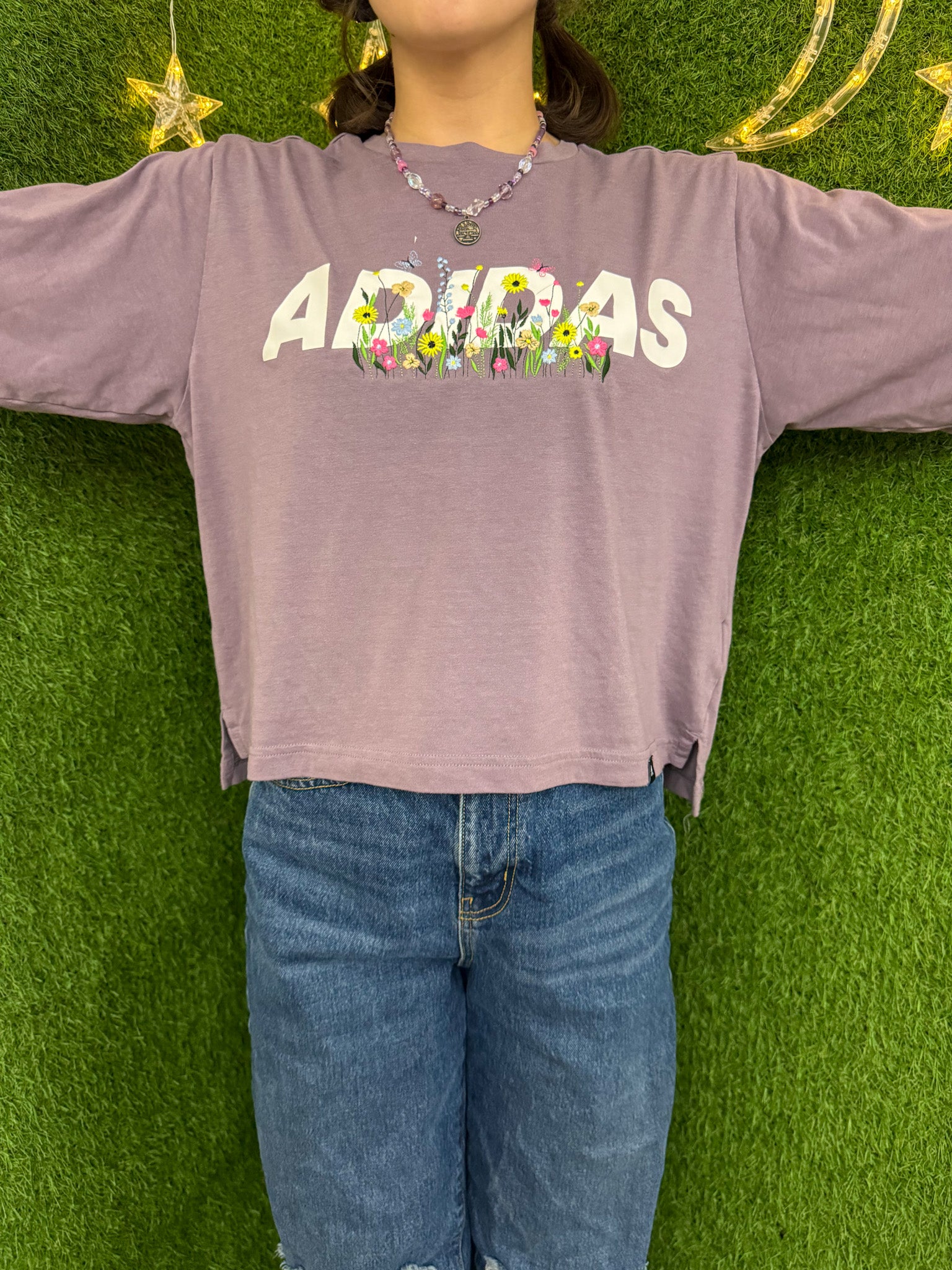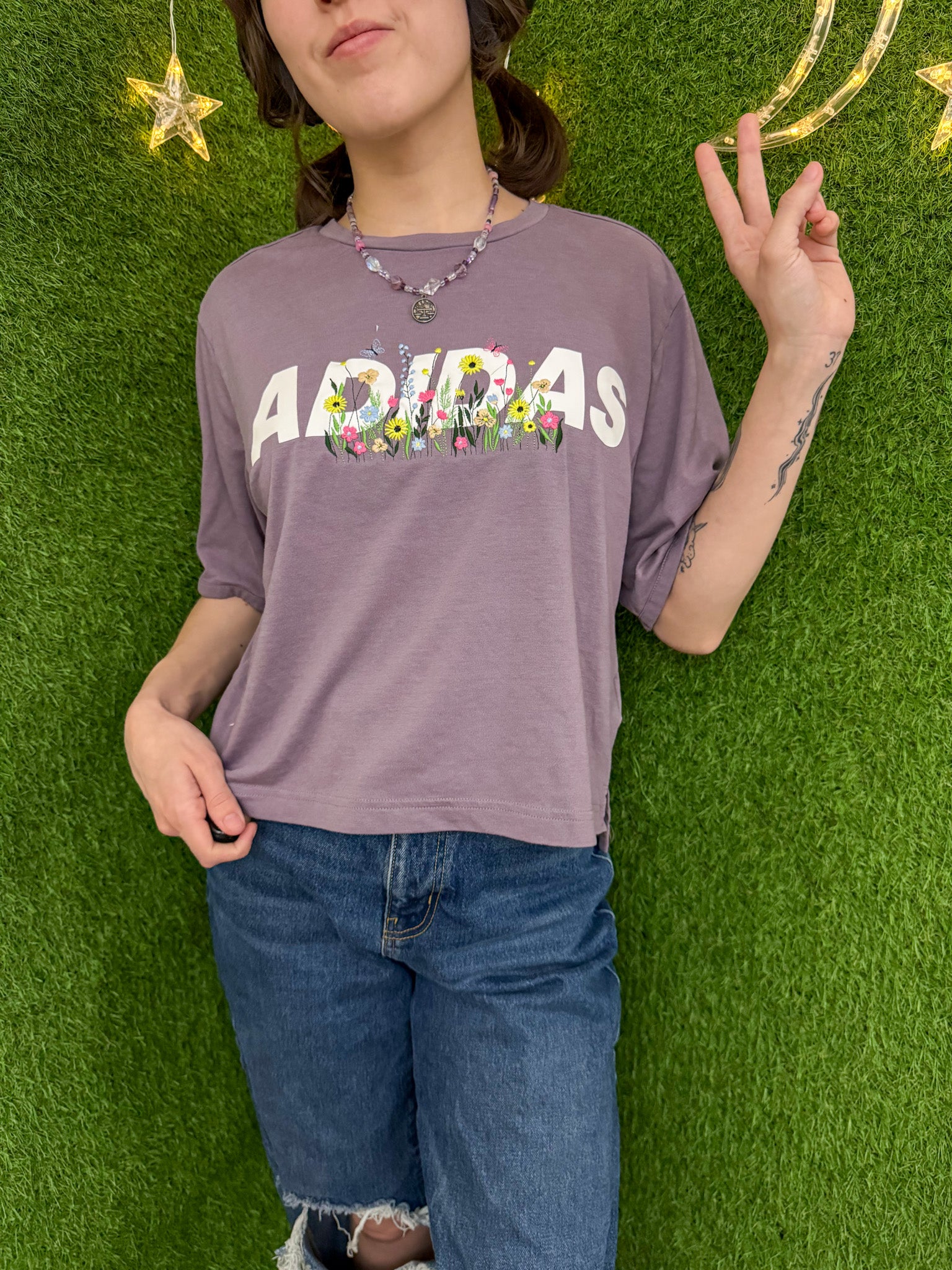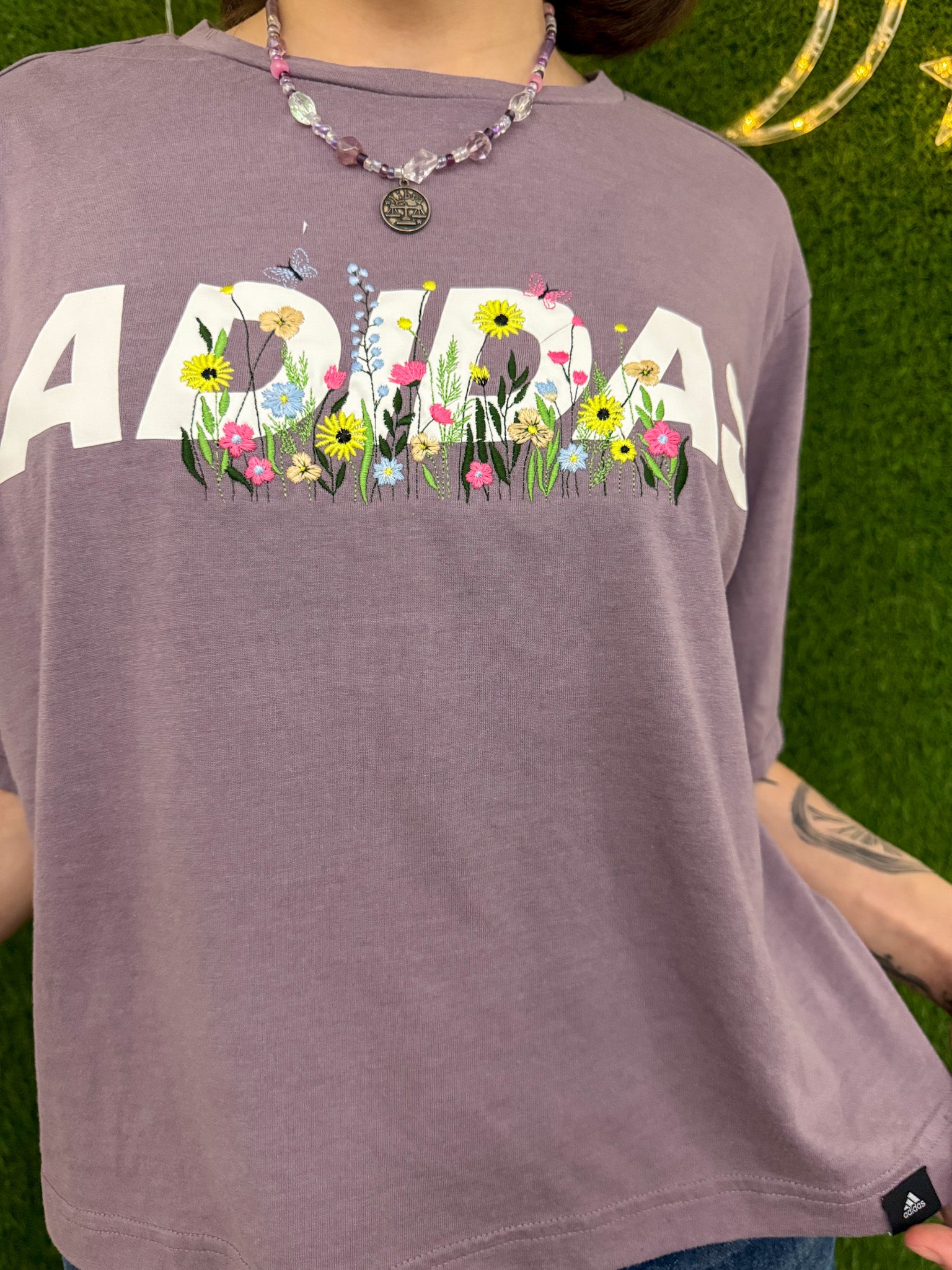 Support sustainable slow fashion with Adidas Floral Cropped Jersey Tee. This upcycled secondhand garment features an embroidered design that adds a unique touch to your wardrobe while supporting our small business and the planet<3