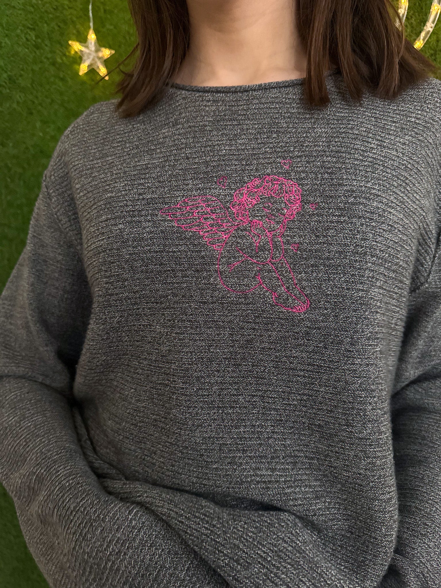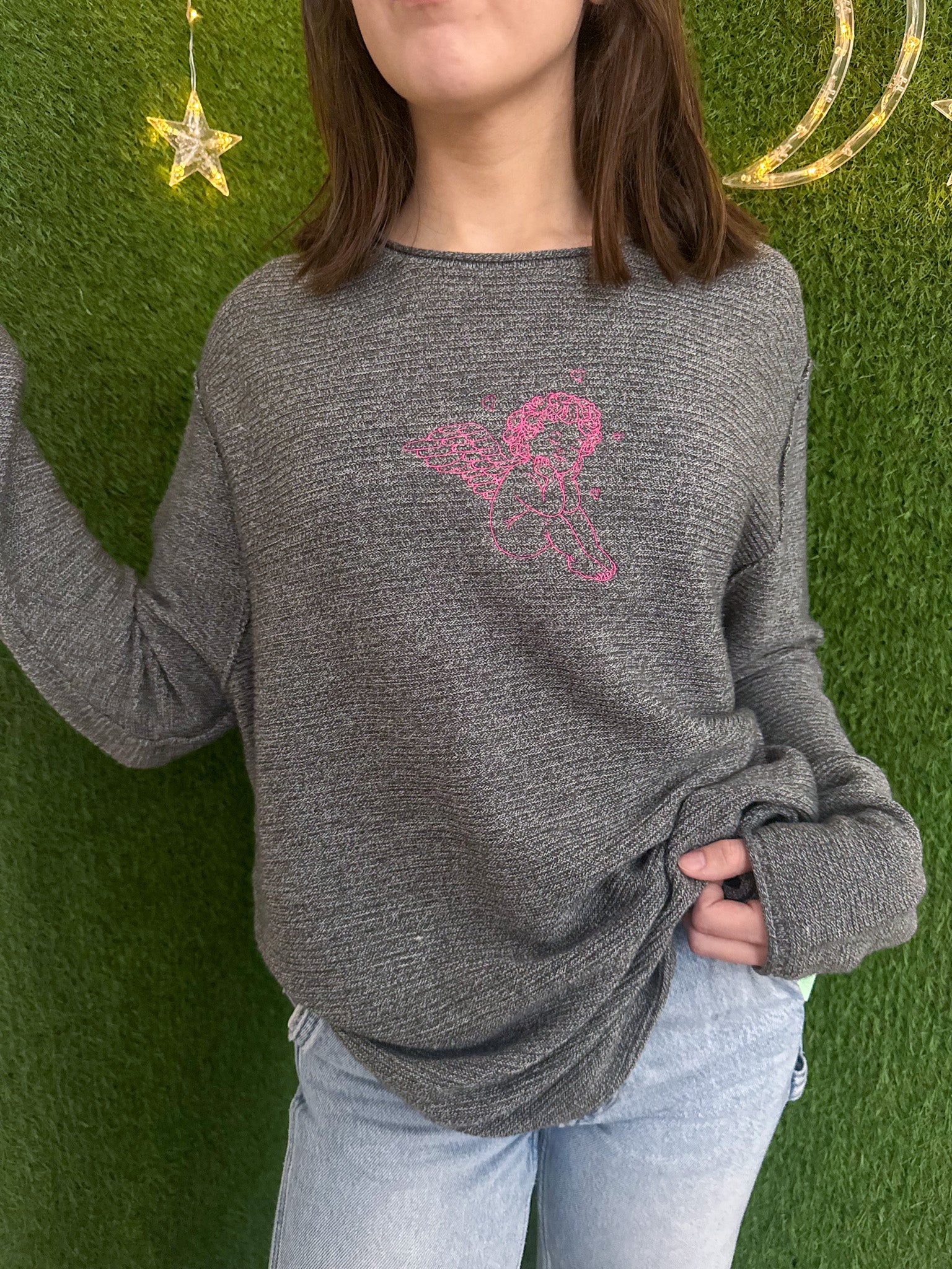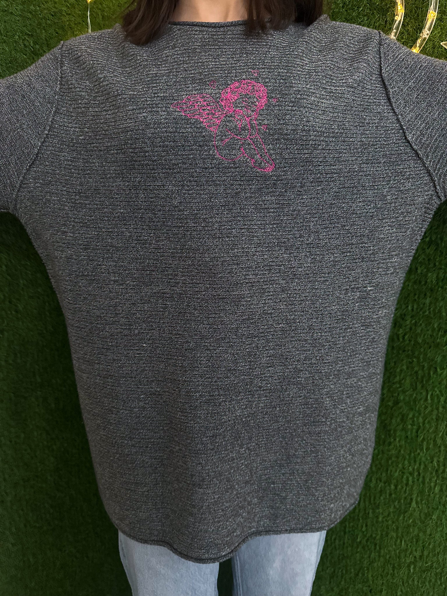 Elevate your style with the Angel Baby Grey Sweater. This embroidered, upcycled secondhand garment supports our small biz while promoting sustainability and slow fashion. Look good and feel good about this cute new sweater!