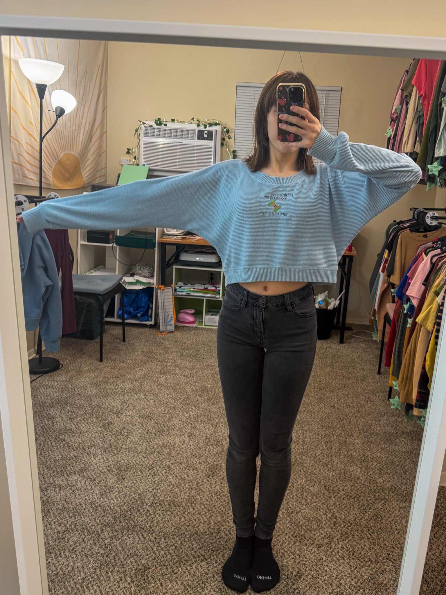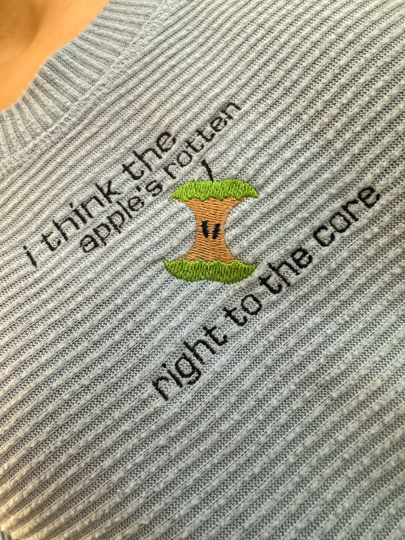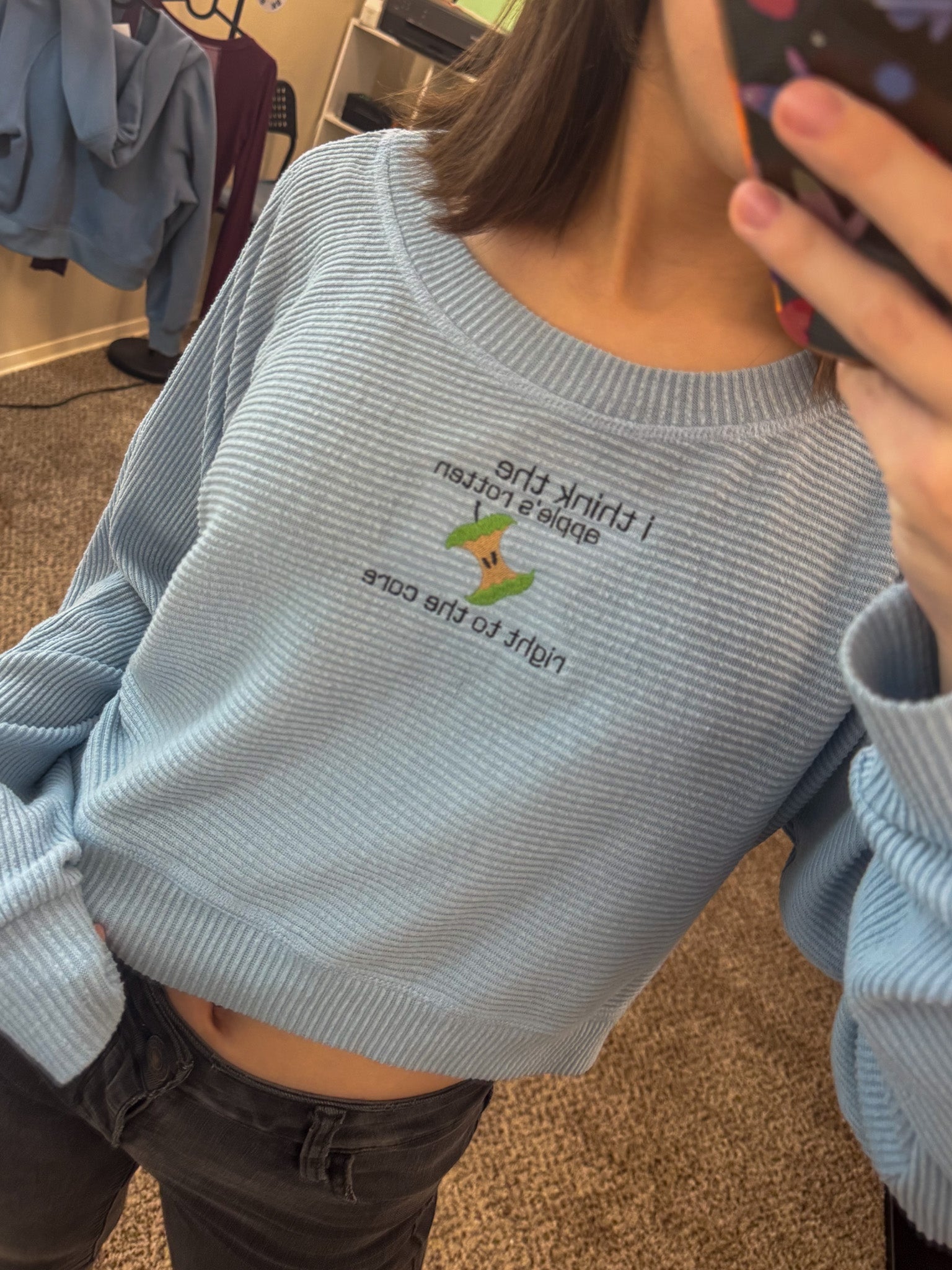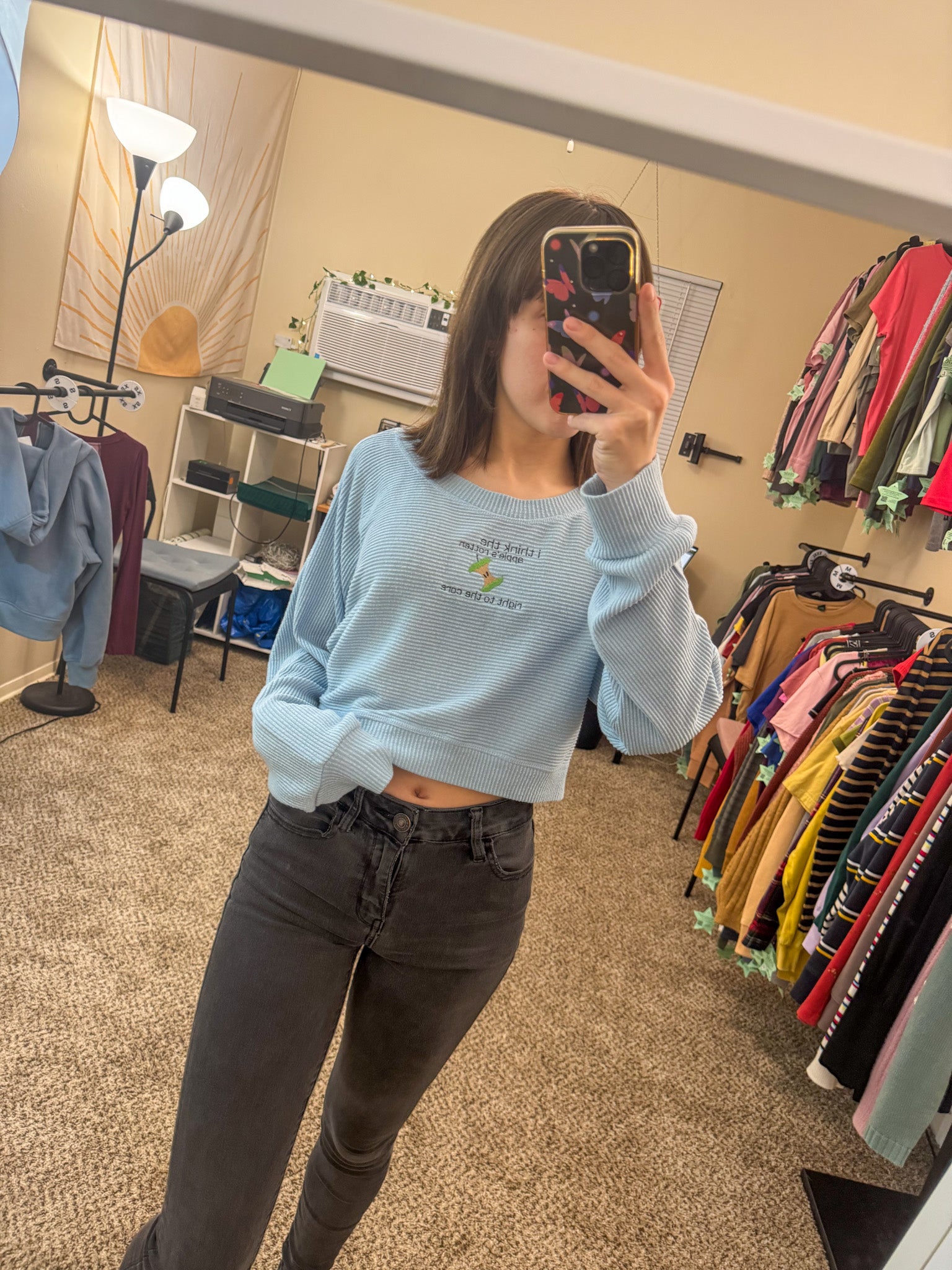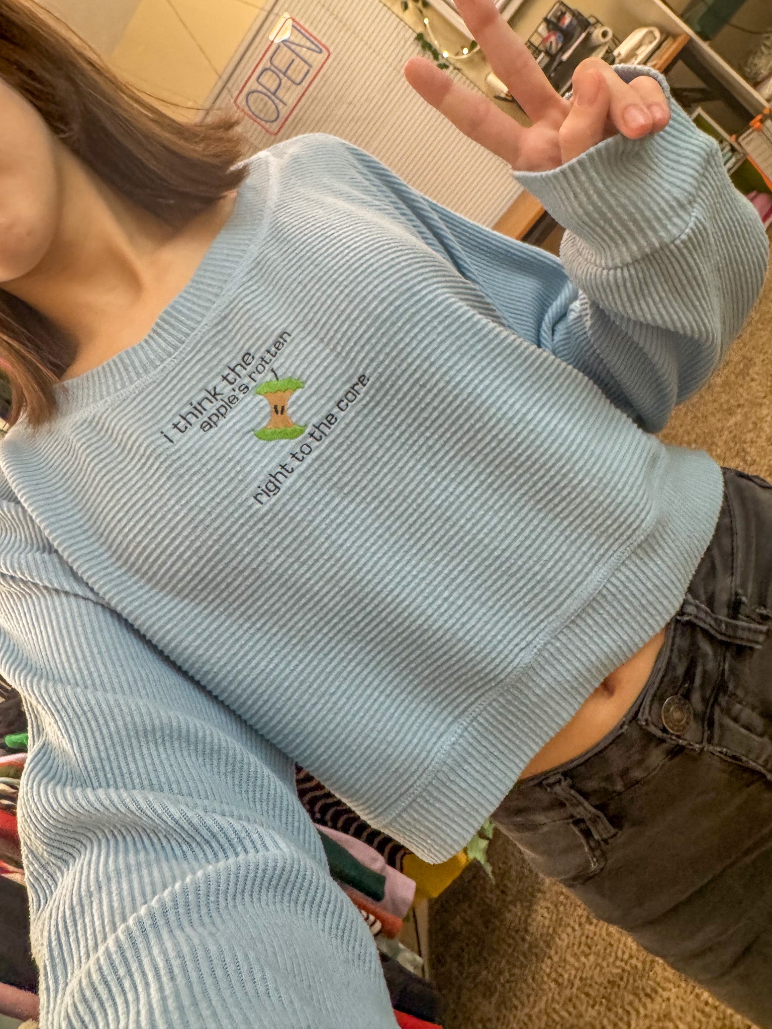 Rock our cozy Apple Blue Cropped Long Sleeve - embroidered & upcycled by our small biz - and show off your unique style. This sustainable and slow fashion piece was lovingly created from a discarded secondhand garment. Support us and the planet in one stylish move!
