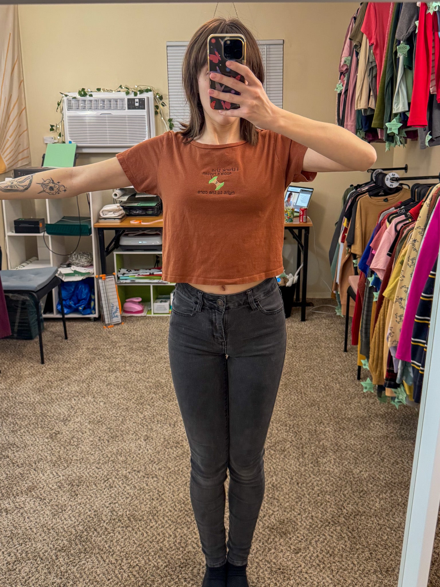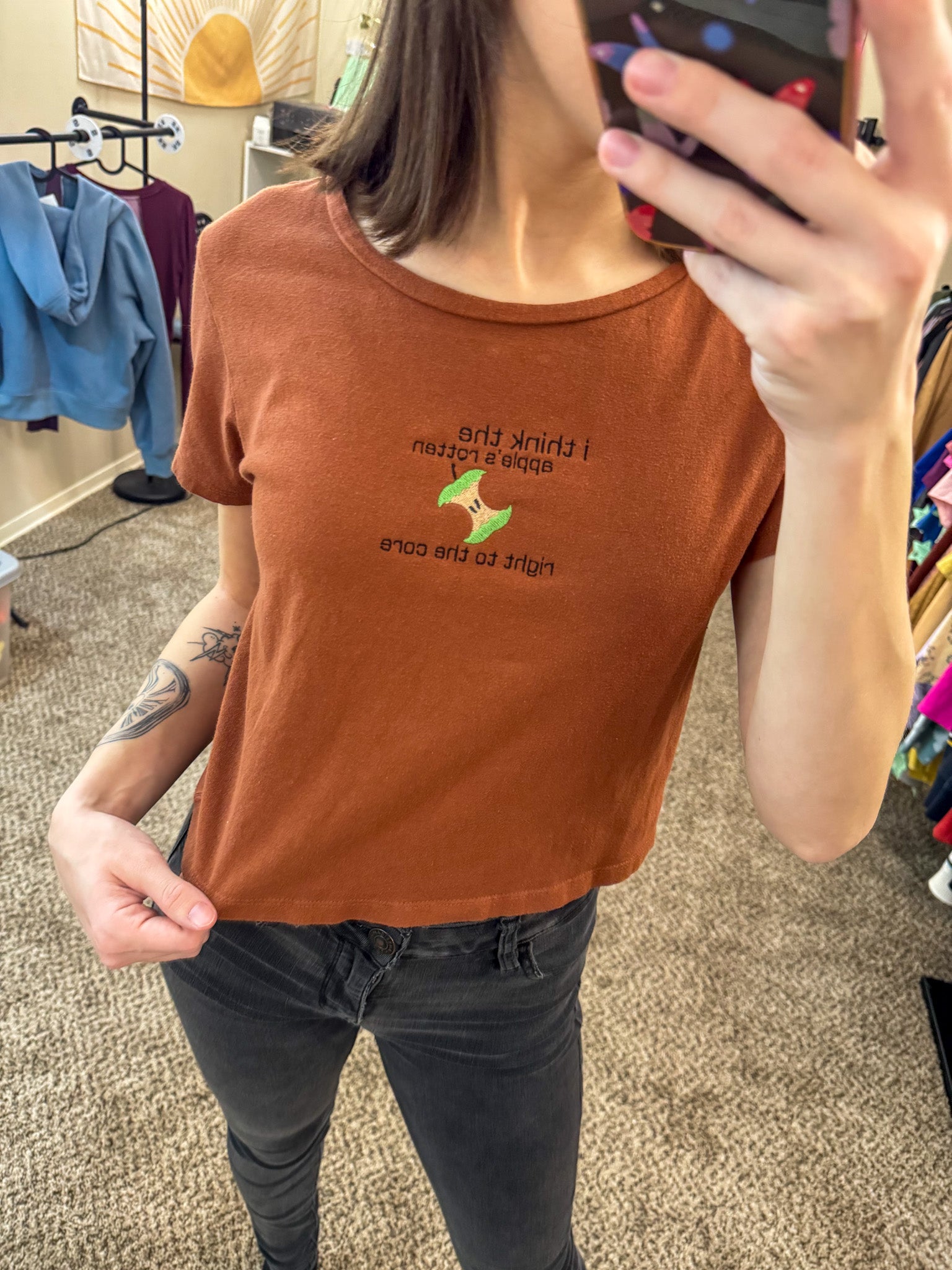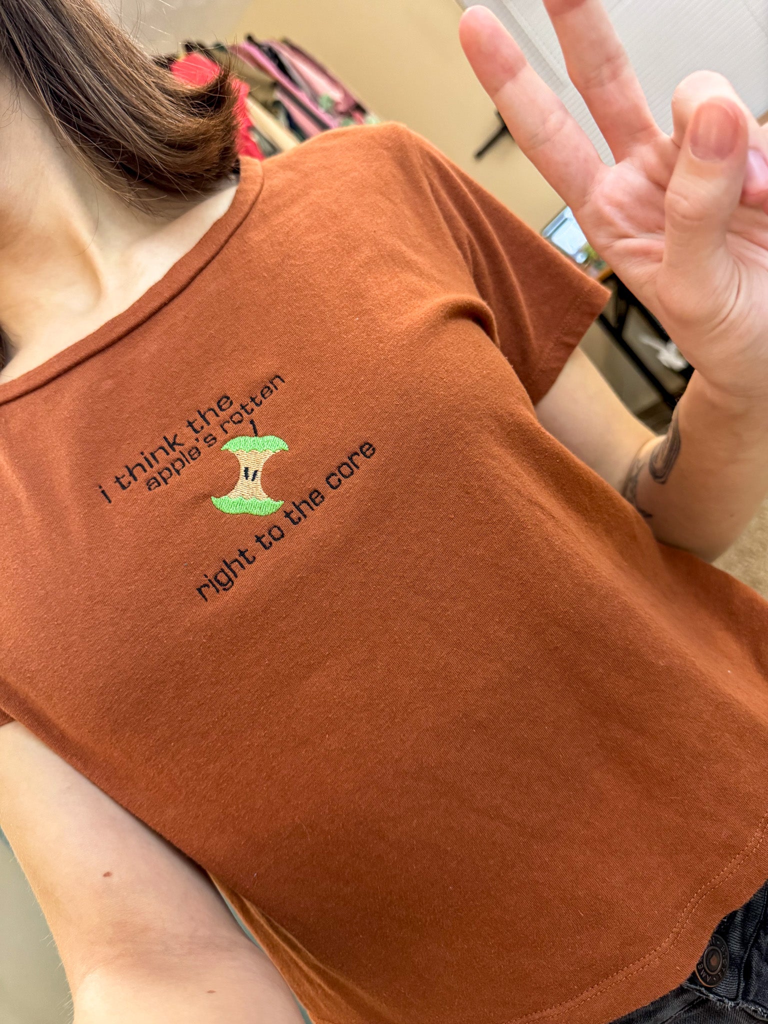 Rock an apple brown baby tee from our small biz. This upcycled and sustainable tee was embroidered and made with love by us. Join the slow fashion movement and support our mission - to turn discarded secondhand garments into stylish, one-of-a-kind pieces!