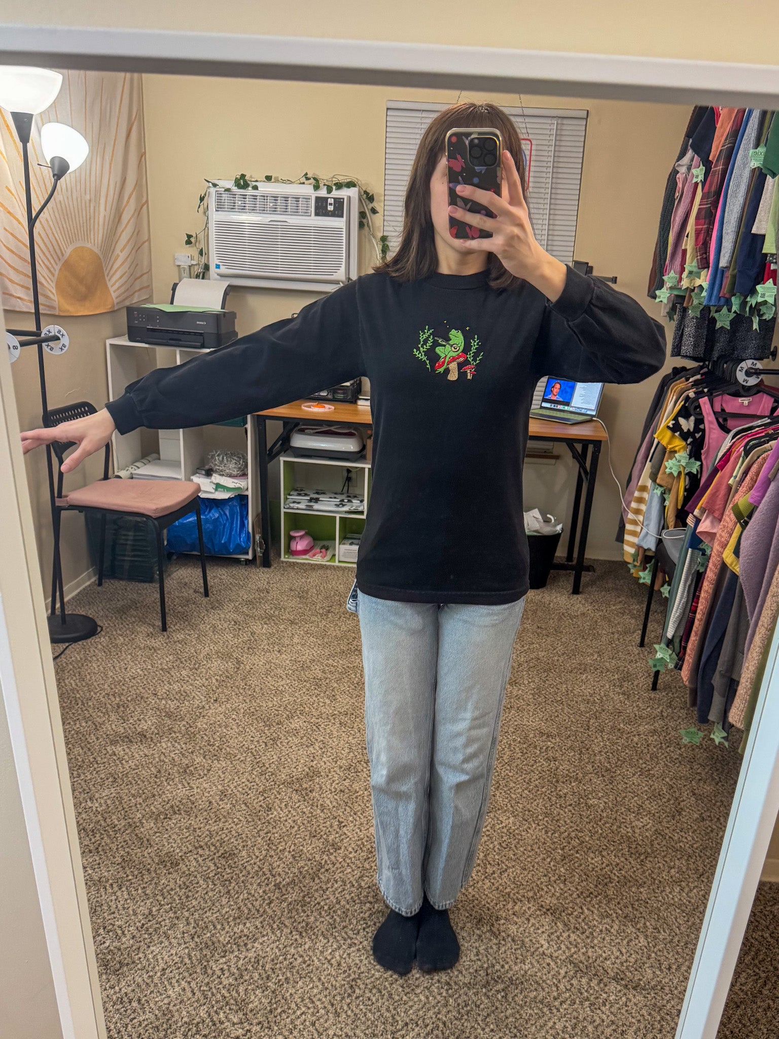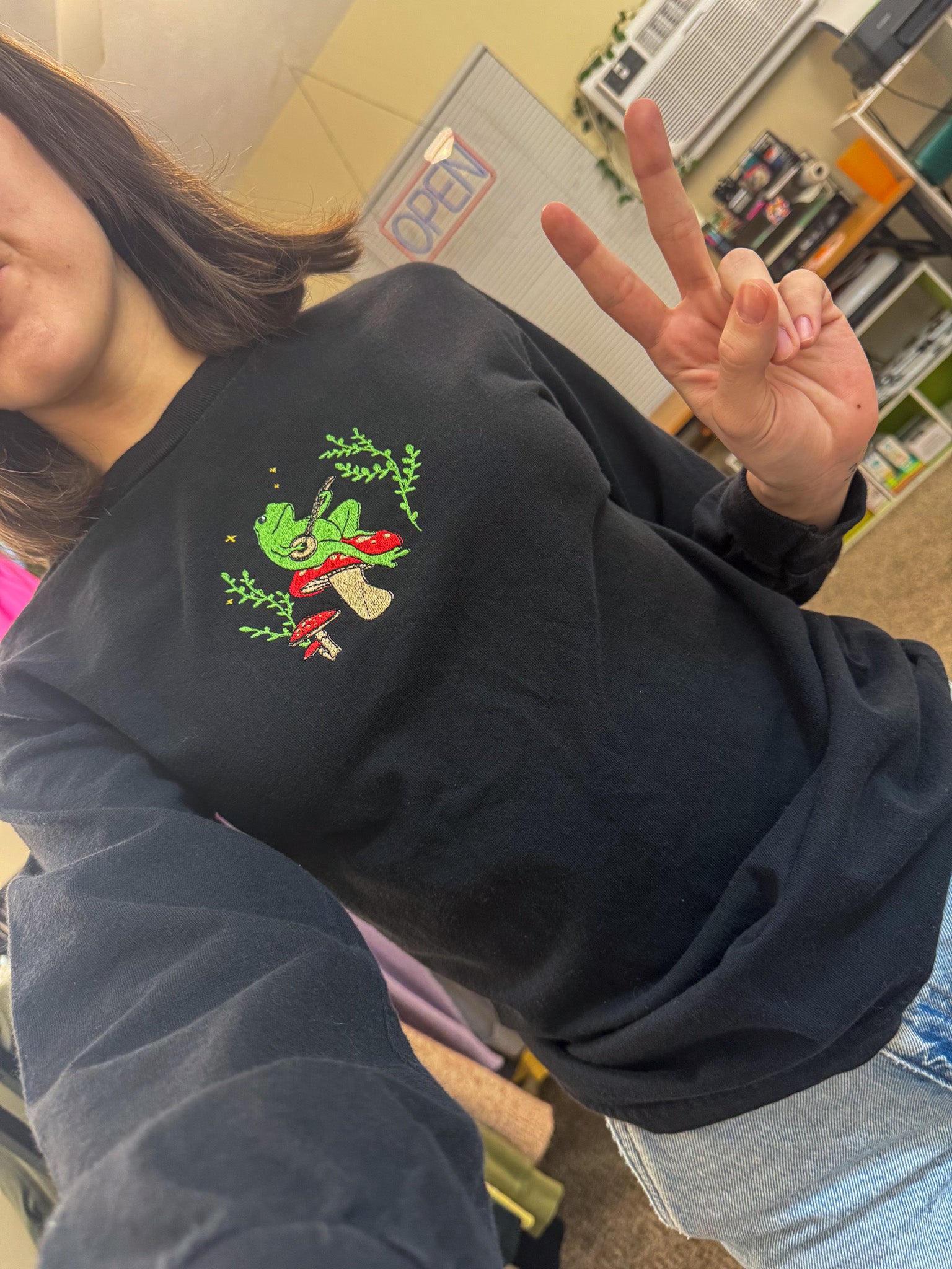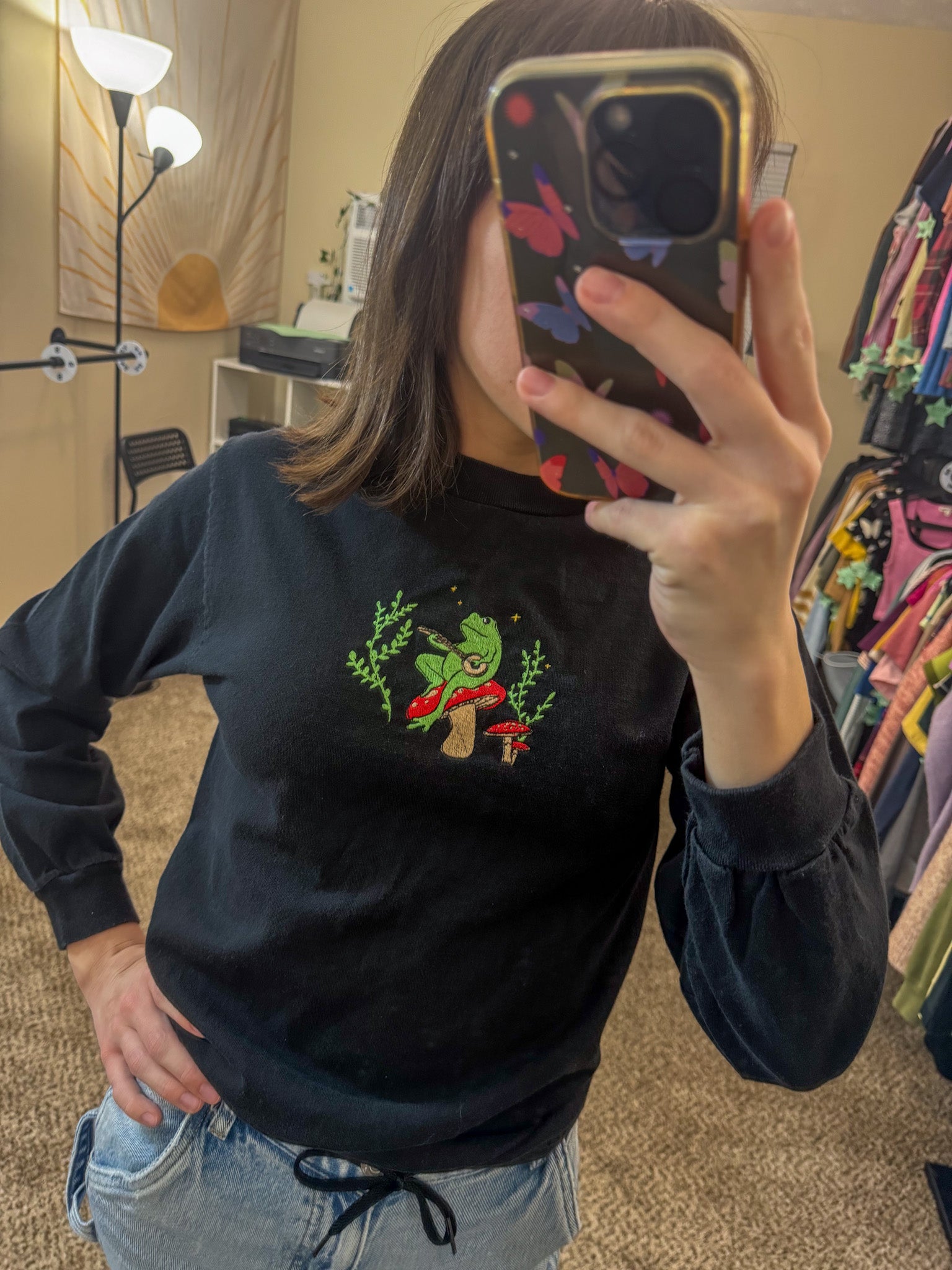 Rock out in our Banjo Frog Black Long Sleeve, embroidered by us and upcycled from a discarded secondhand garment. Not only are you supporting our small biz, but you're also choosing a sustainable and slow fashion option. Now that's music to our ears!