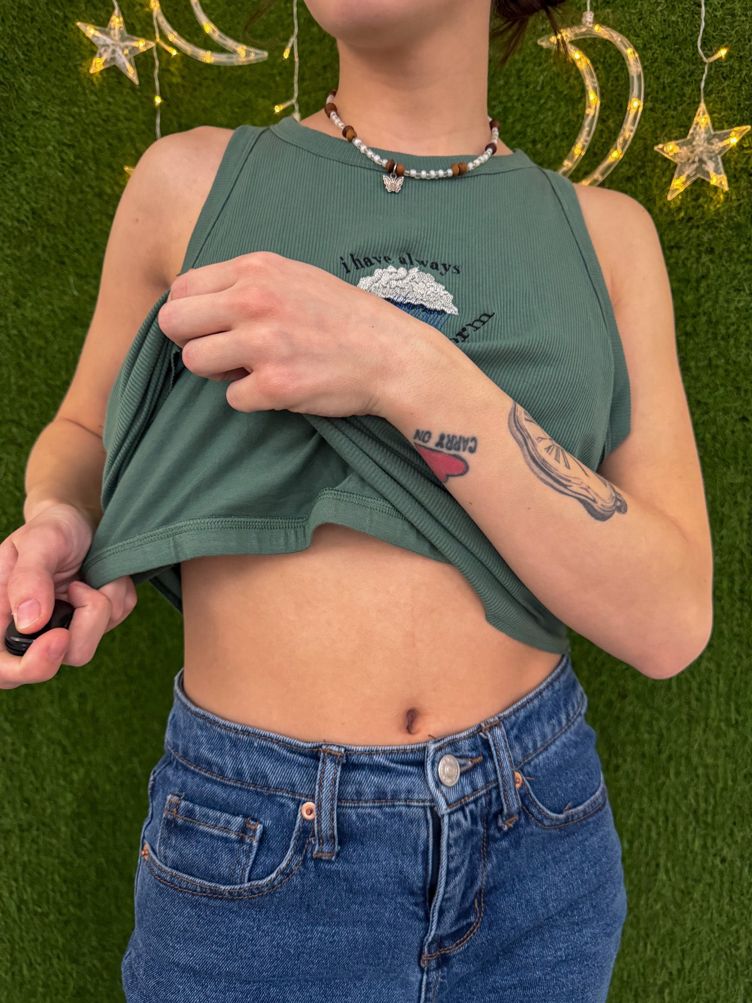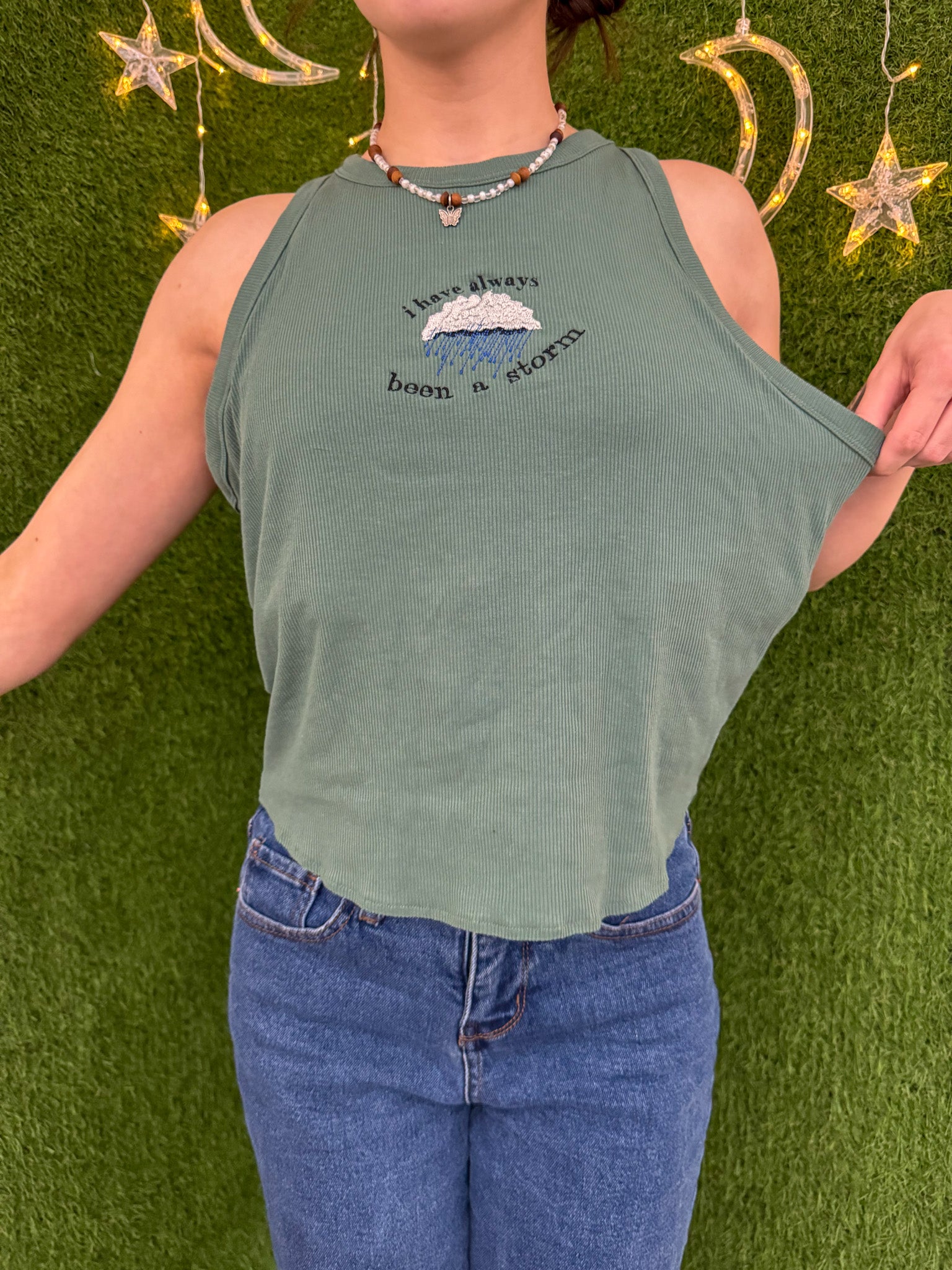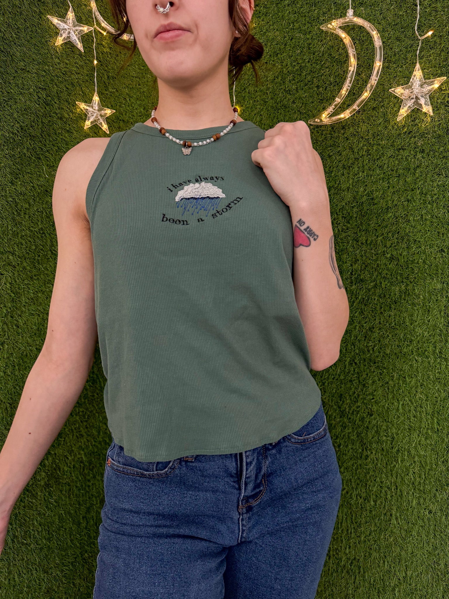Upgrade your wardrobe with our Been a Storm Green Halter Tank. This embroidered tank not only adds a pop of color to any outfit, but it also supports our small business. Made from upcycled and secondhand materials, this sustainable piece embodies the ethos of slow fashion!