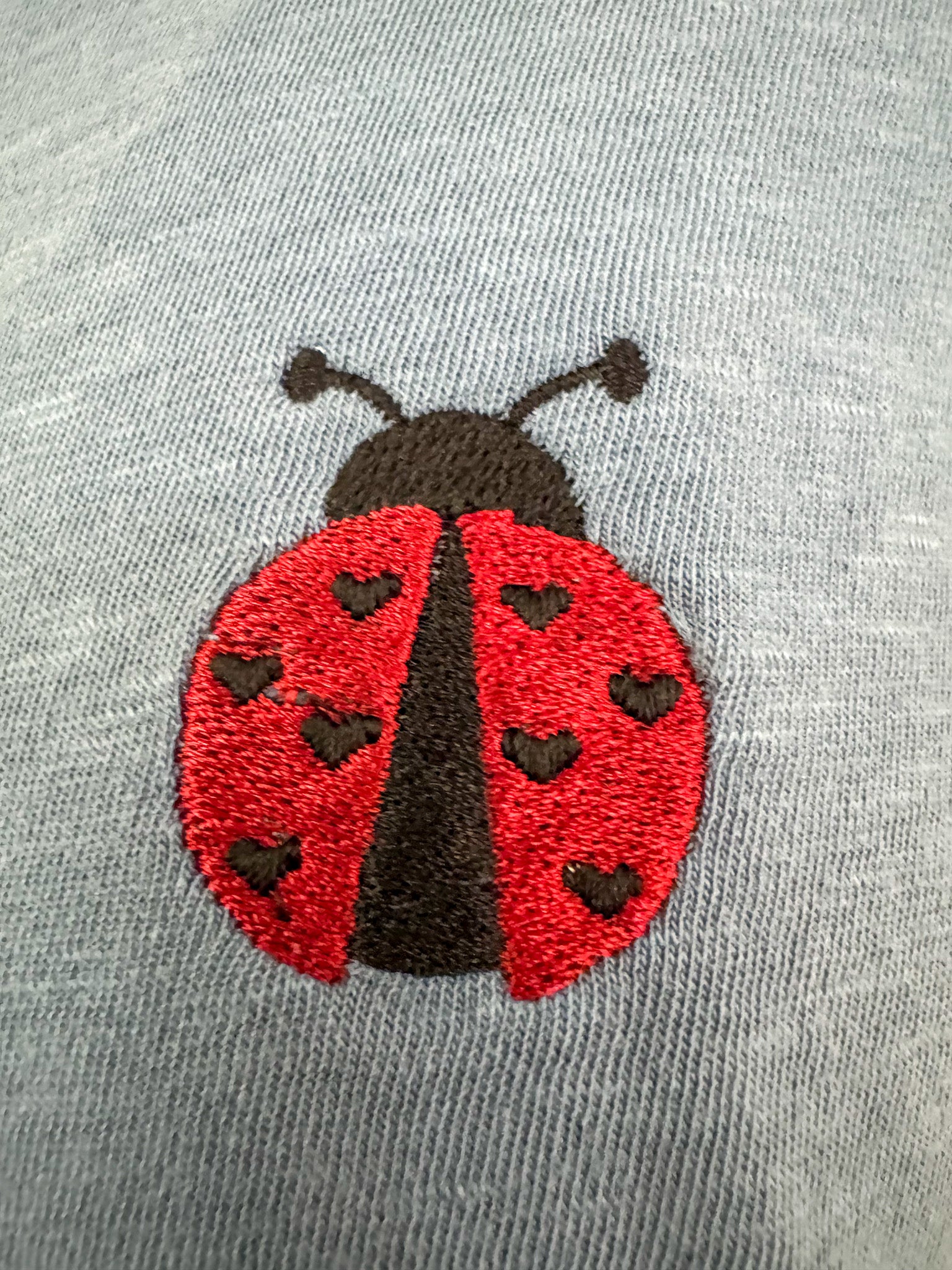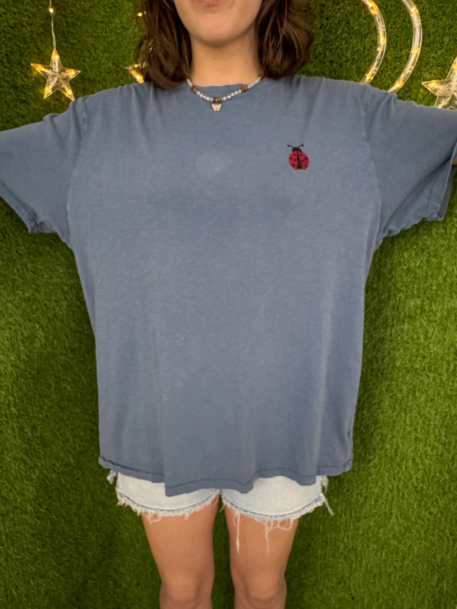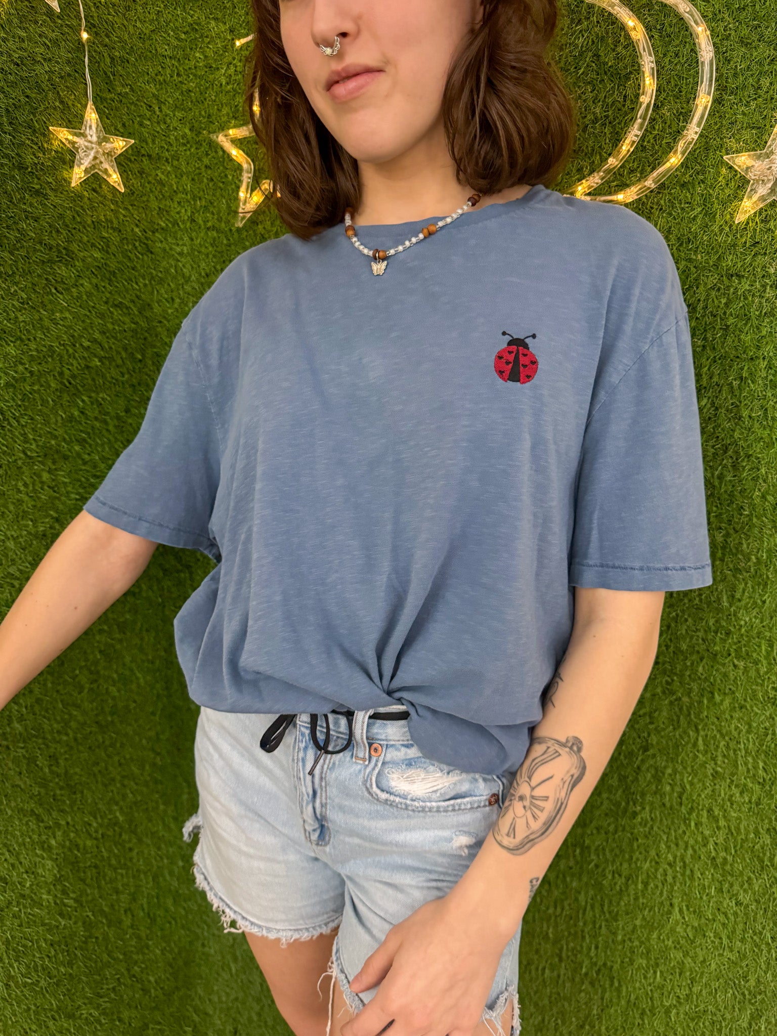 This Blue Ladybug T-Shirt is sustainably upcycled from a secondhand garment and embroidered with eco-friendly materials. Support our small biz and embrace slow fashion with this unique and environmentally conscious piece!