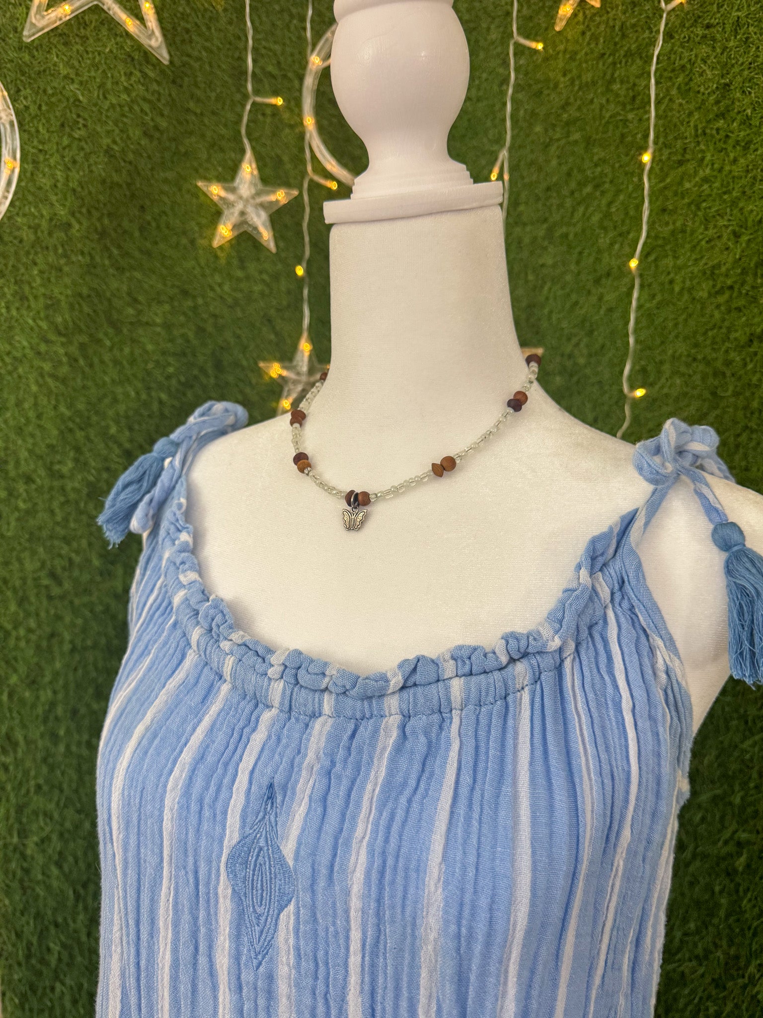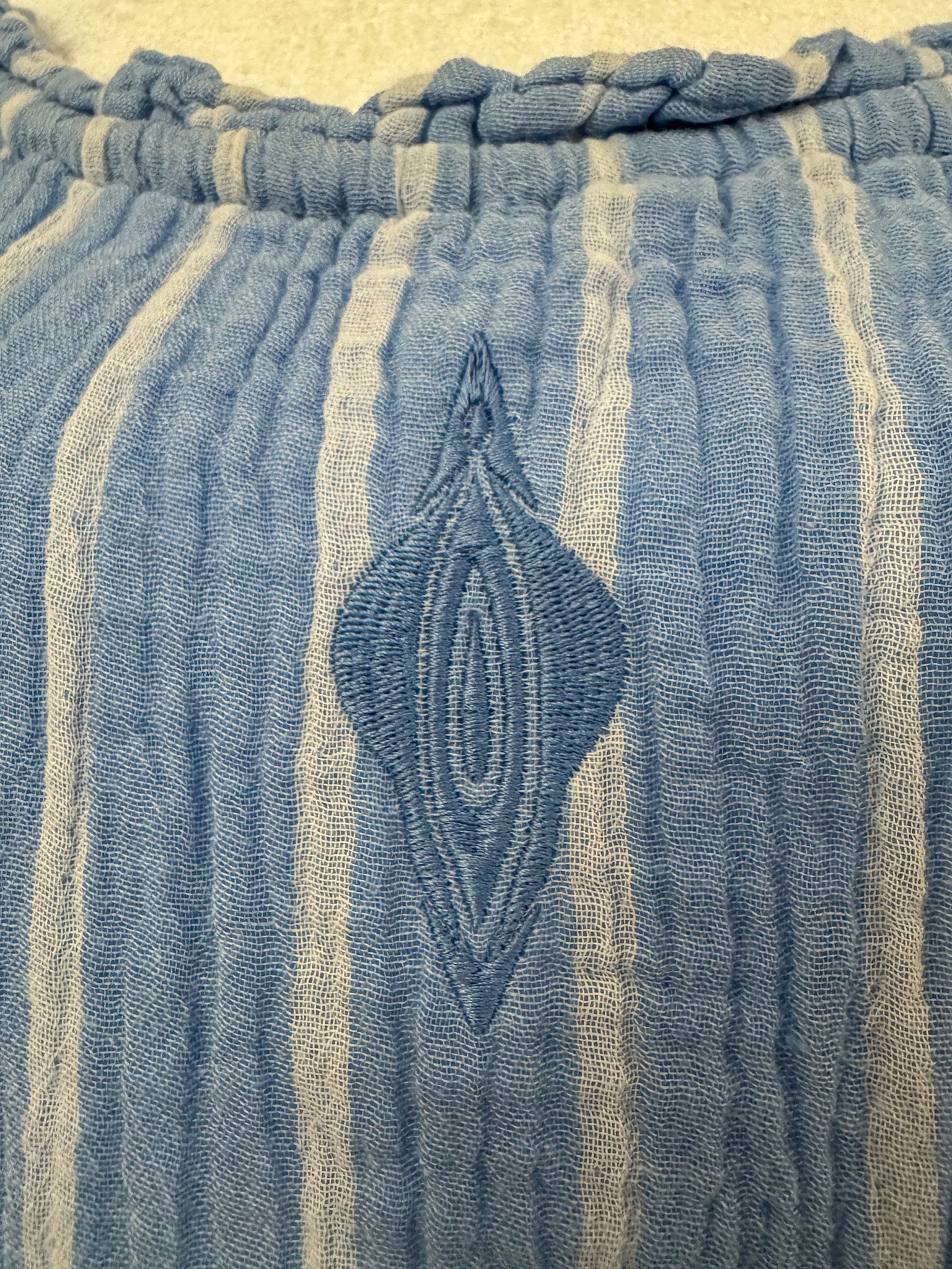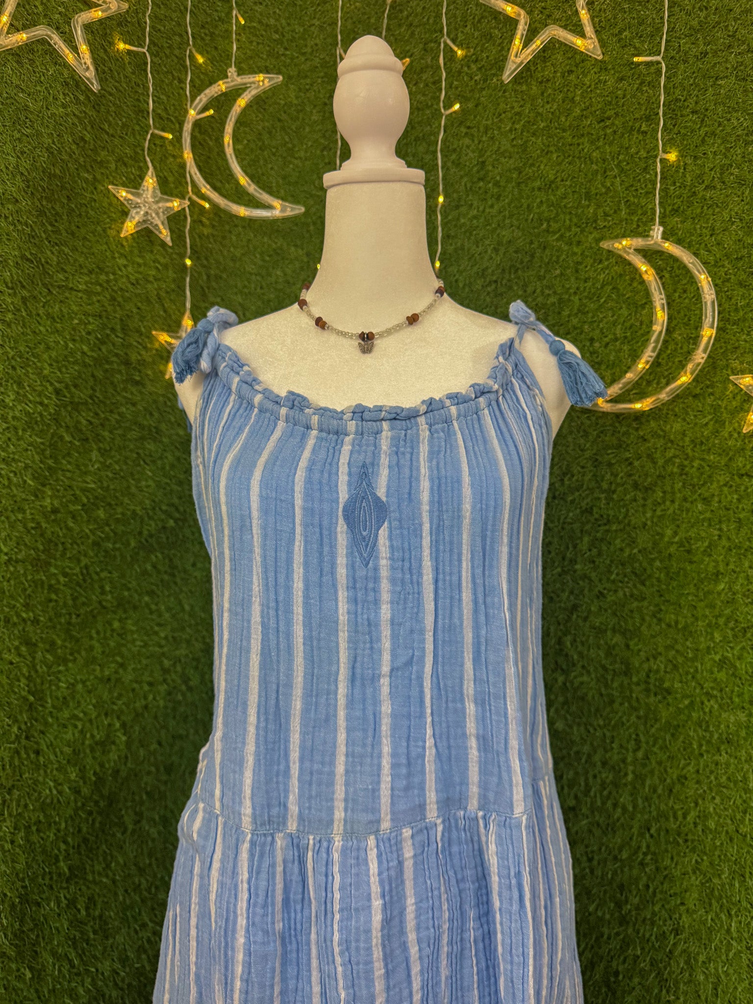 This Blue Vulva Striped Dress is a unique, upcycled piece crafted from a secondhand garment. Featuring delicate embroidery, it supports small businesses and embraces sustainable, slow fashion values. Perfect for those who care about style with a conscience!
