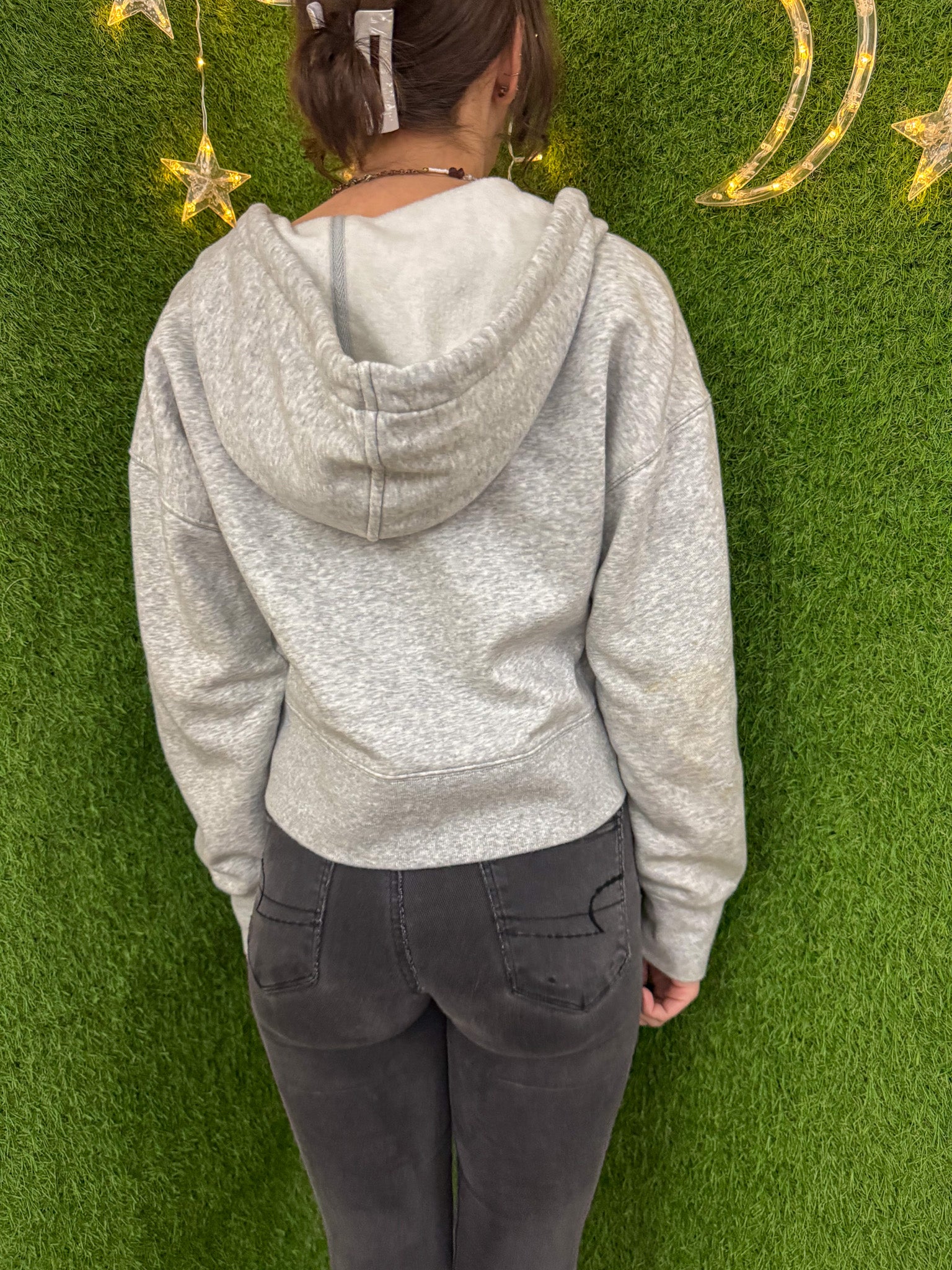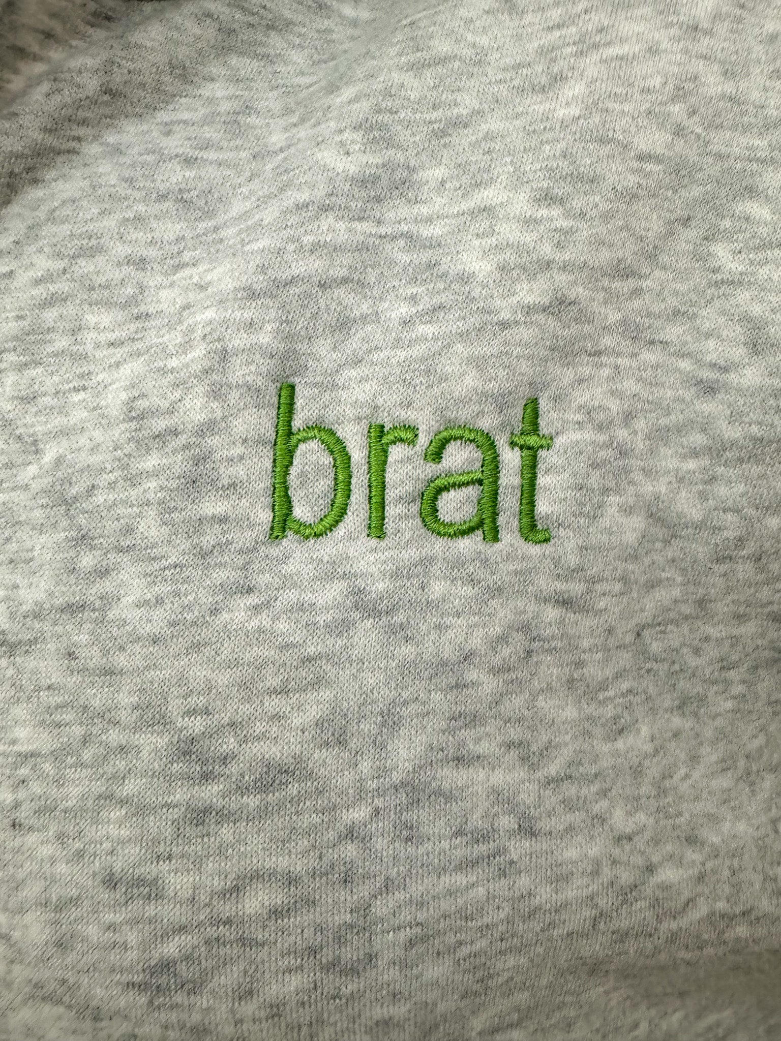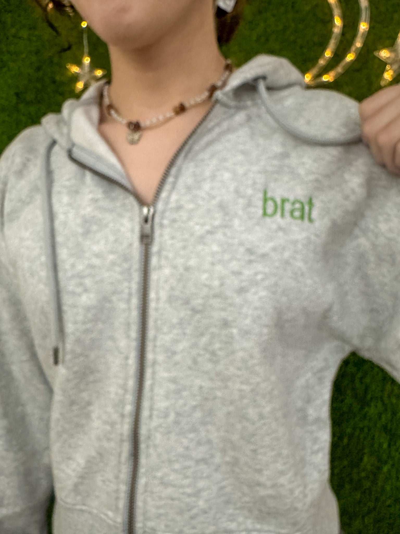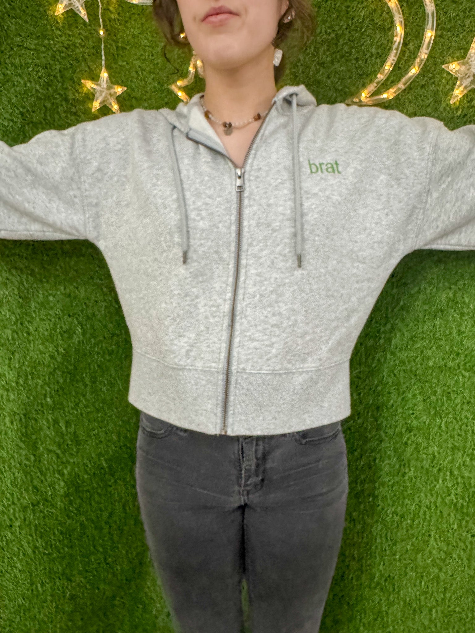 Step up your fashion game with our Brat Grey Zip Up Hoodie. This hoodie is more than just a stylish addition to your wardrobe. Embroidered with love, this upcycled, secondhand garment supports our small biz and promotes sustainable, slow fashion!