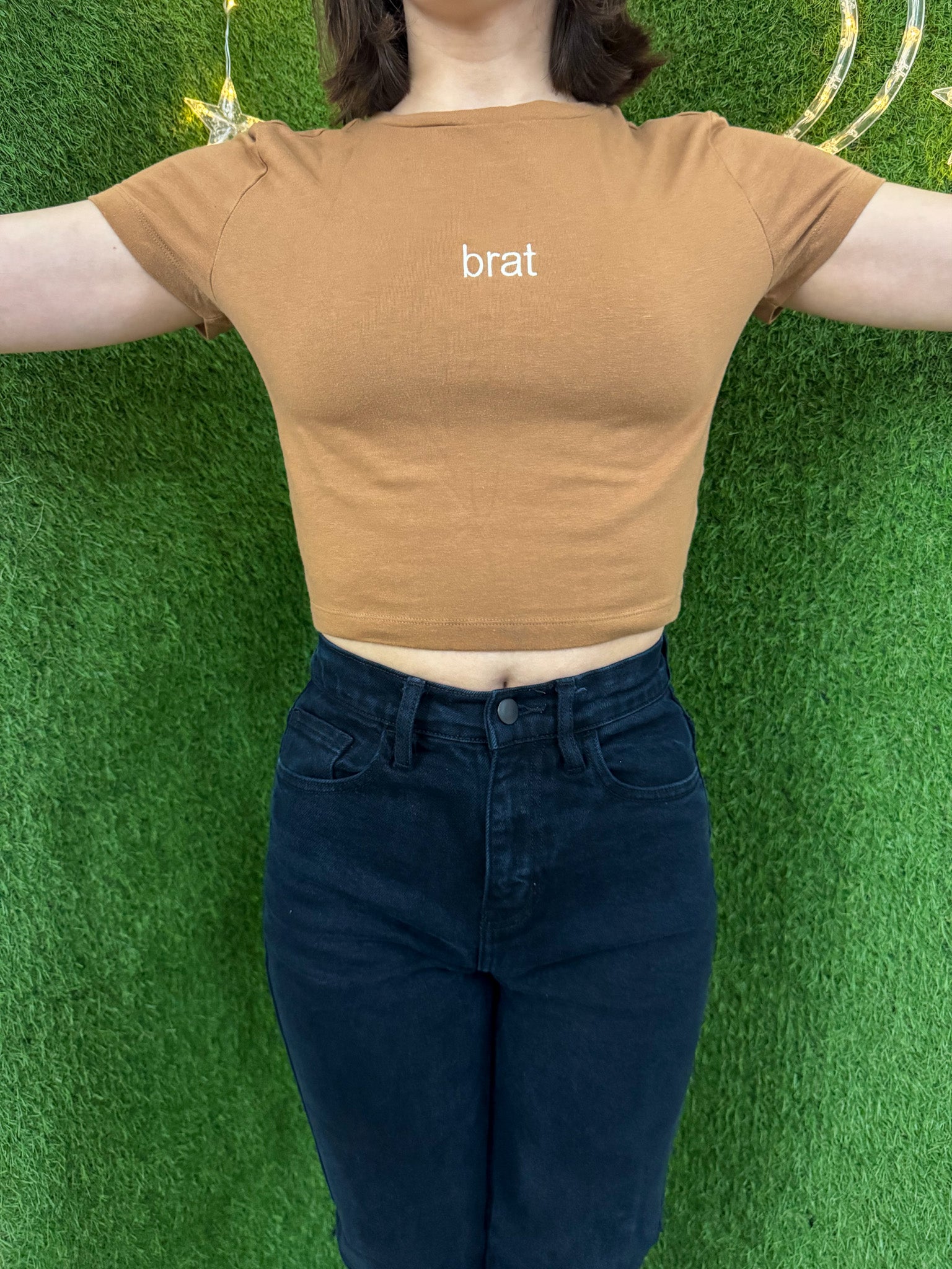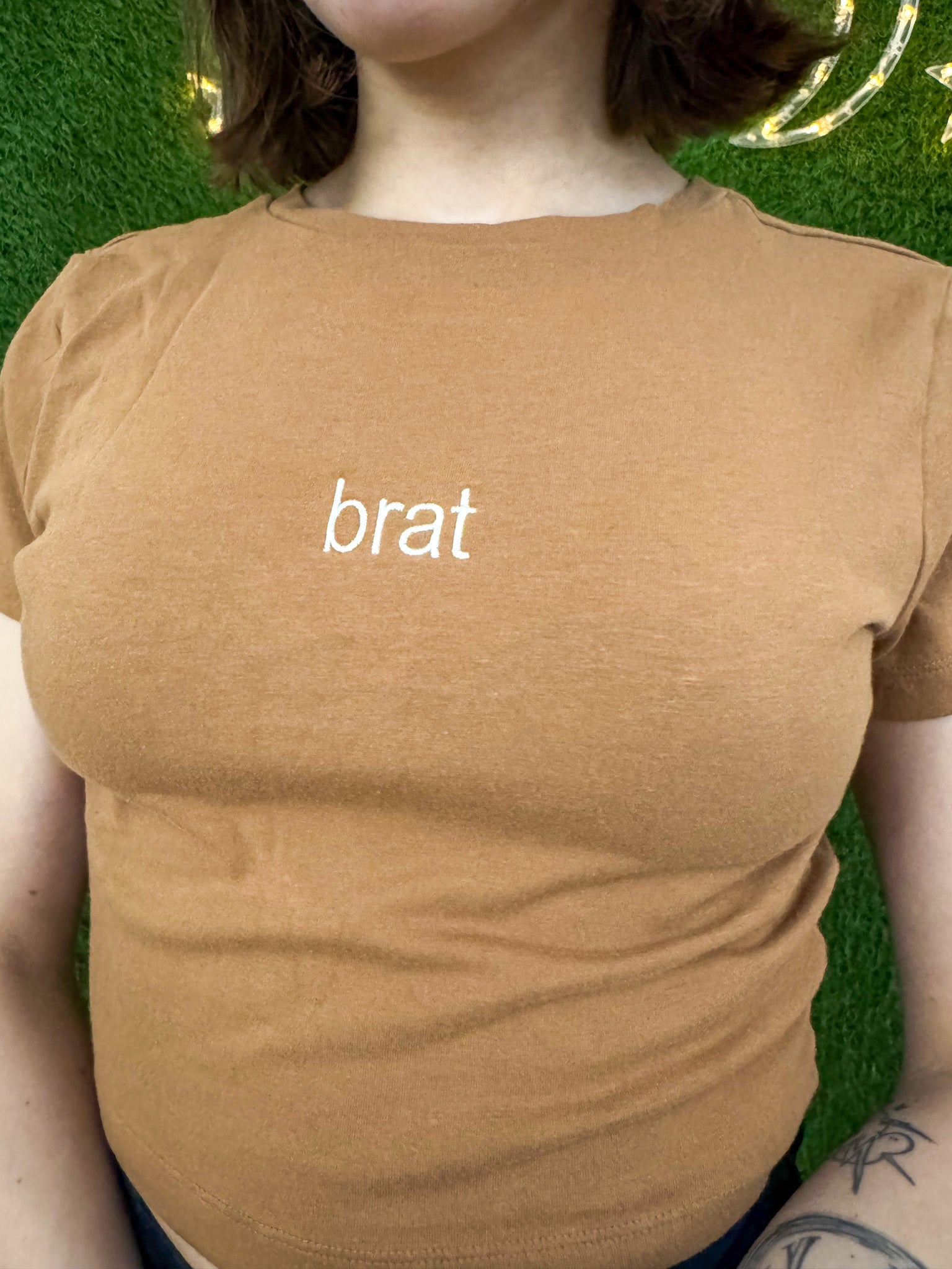 Support sustainable fashion with our Brat Khaki Baby Tee! Made from upcycled materials, this embroidered tee not only reduces waste, but also supports small businesses and promotes slow fashion. Look good while doing good<3