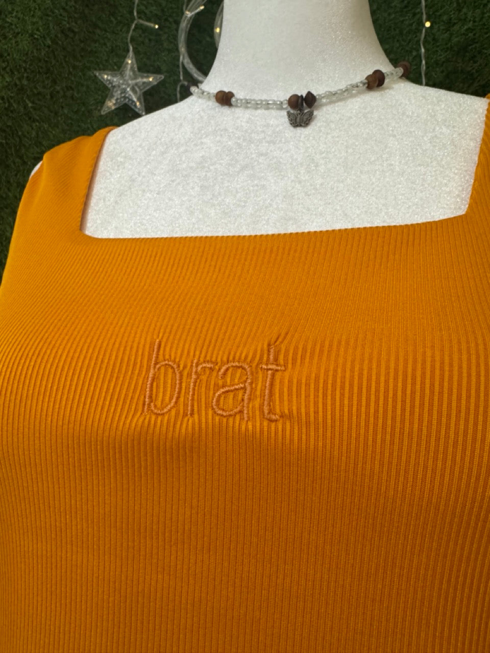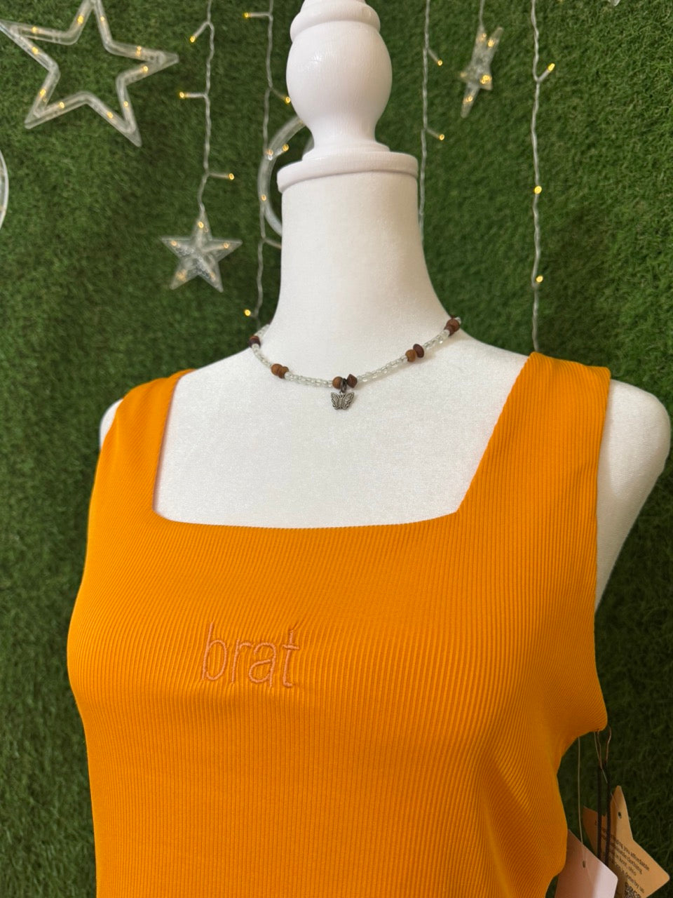 Add a splash of fun to your wardrobe with the Brat Orange Cropped Tank! This playful piece is lovingly upcycled from a secondhand garment and features unique embroidered details, making this tank one-of-a-kind. Embrace slow fashion with a vibrant, eco-friendly look that’s as bold as you are. Perfect for sunny days and good vibes!