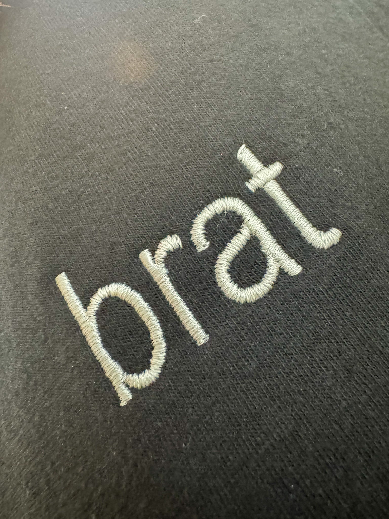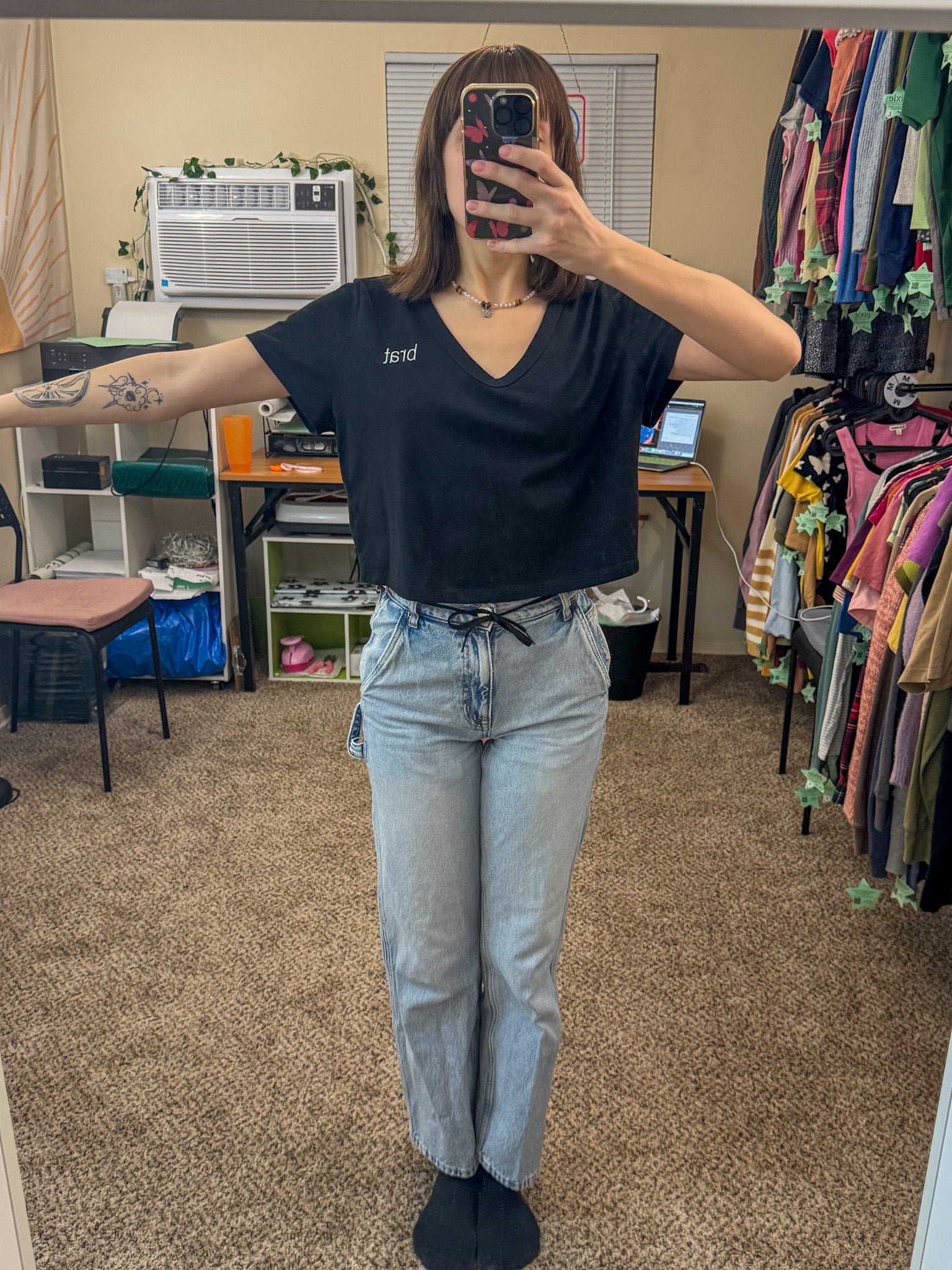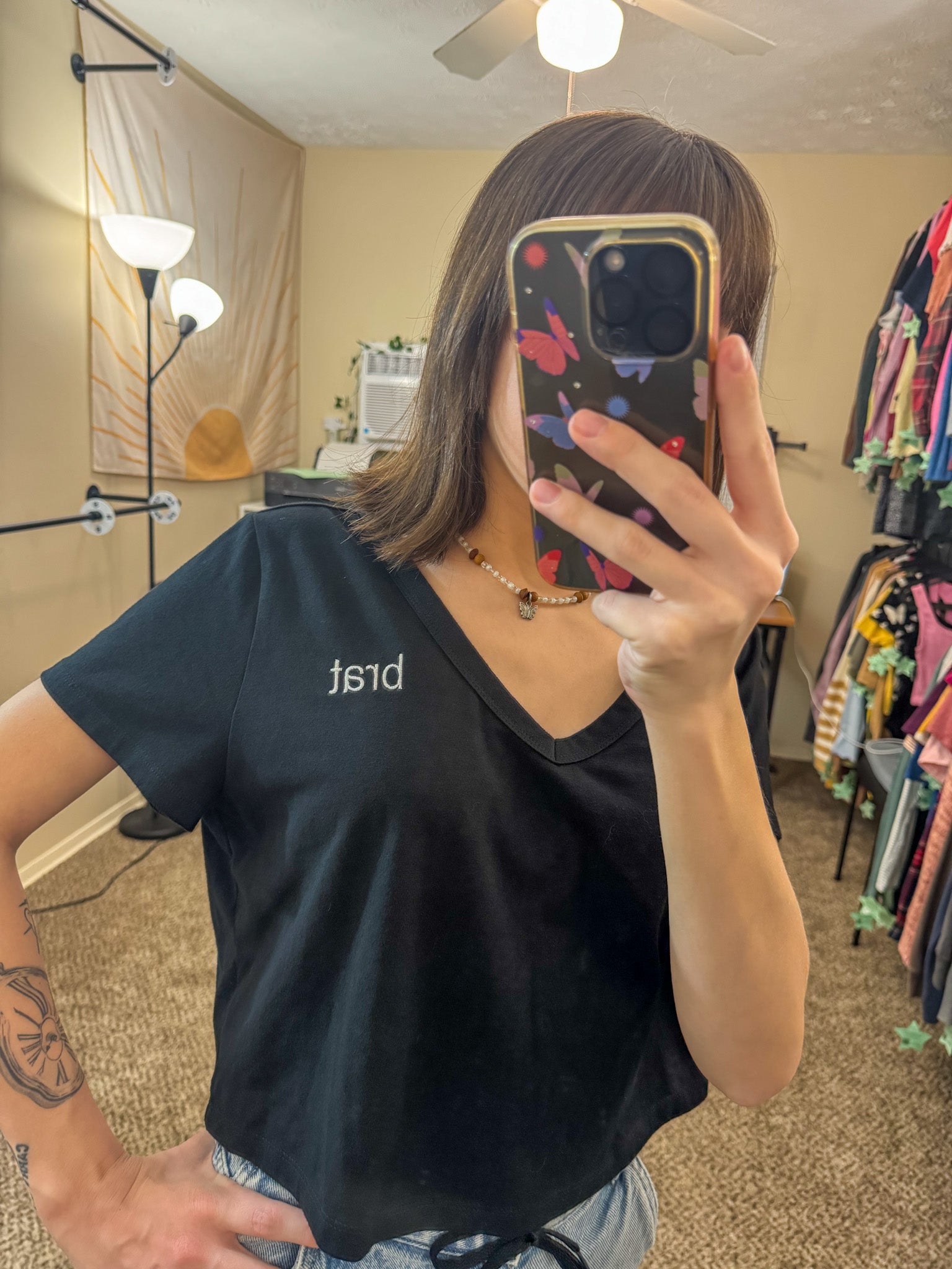 Show your support for sustainable, slow fashion with our Brat V-Neck Baby Tee. Upcycled from a discarded secondhand garment and embroidered by us, this tee not only looks good, but helps support our small biz. It's a win-win (and cute) situation!