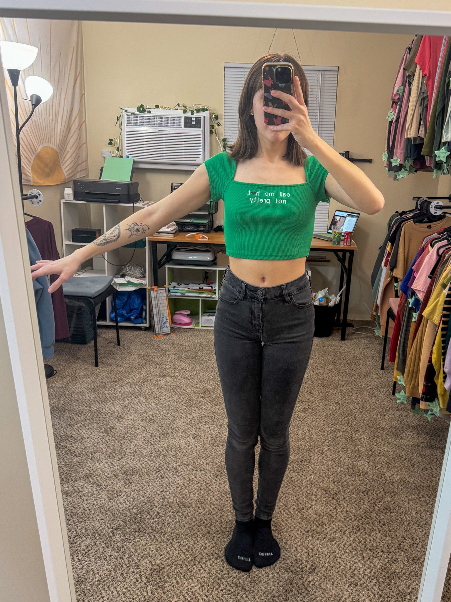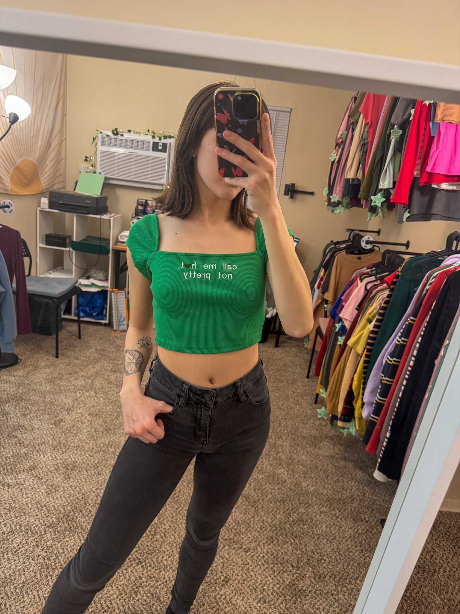 Get ready to turn up the heat in our Call Me Hot Green Crop Top - lovingly embroidered by us. Not only will you look fabulous, but you'll also be supporting our small biz and helping the environment with this upcycled, sustainable, and slow fashion piece. Make a statement while making a difference!