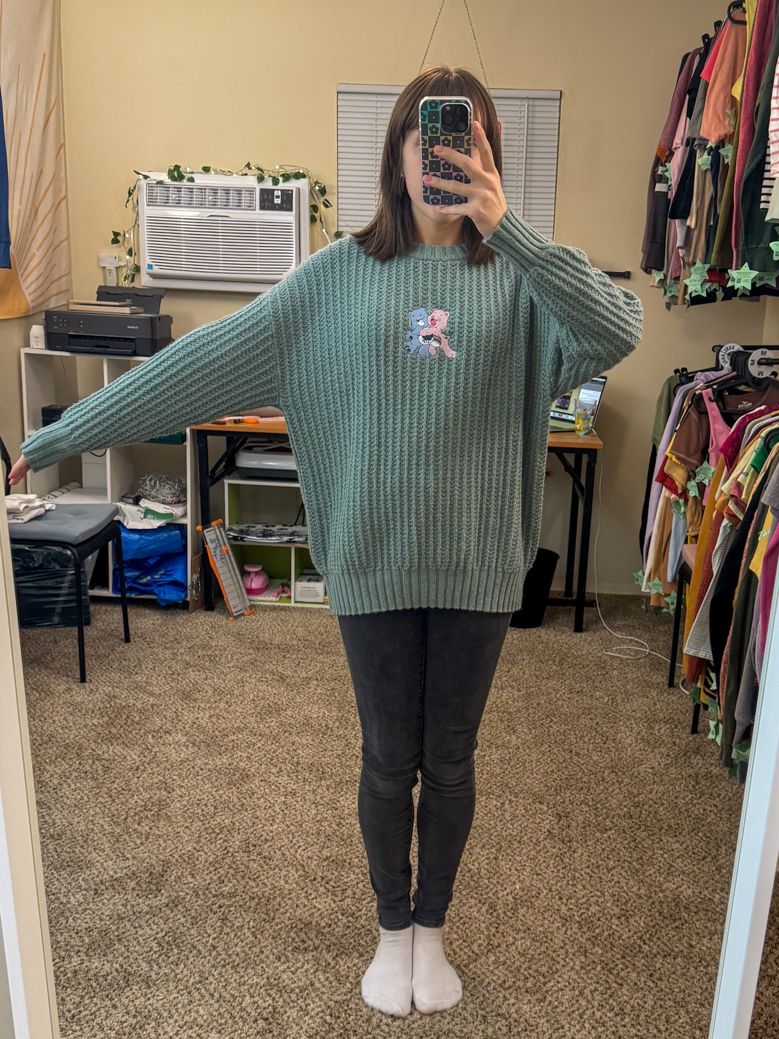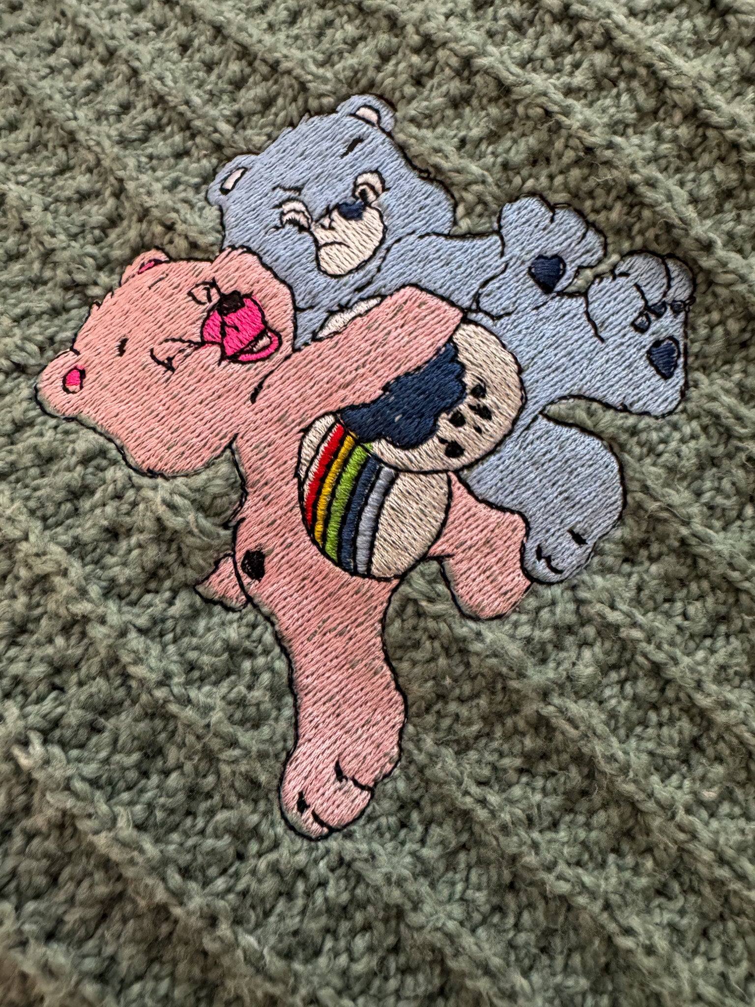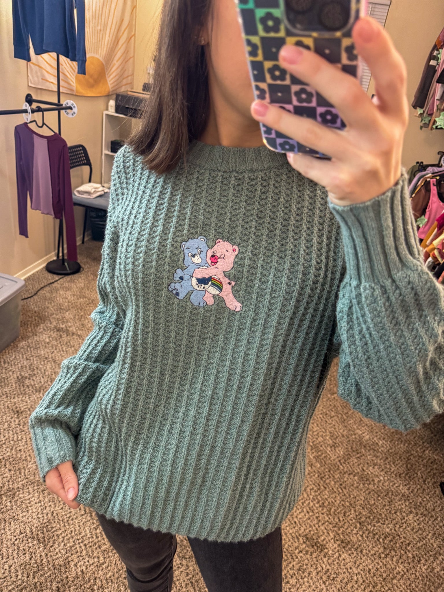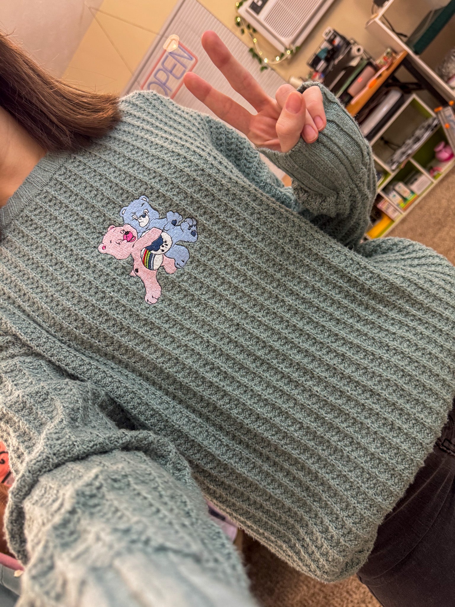 This Care Bear Aqua Sweater is not only adorably embroidered by us, but it also supports our small biz and promotes sustainable slow fashion! Made from upcycled and revitalized secondhand garments, this sweater is both stylish and eco-friendly. Join the Care Bear crew and make a positive impact on the environment!