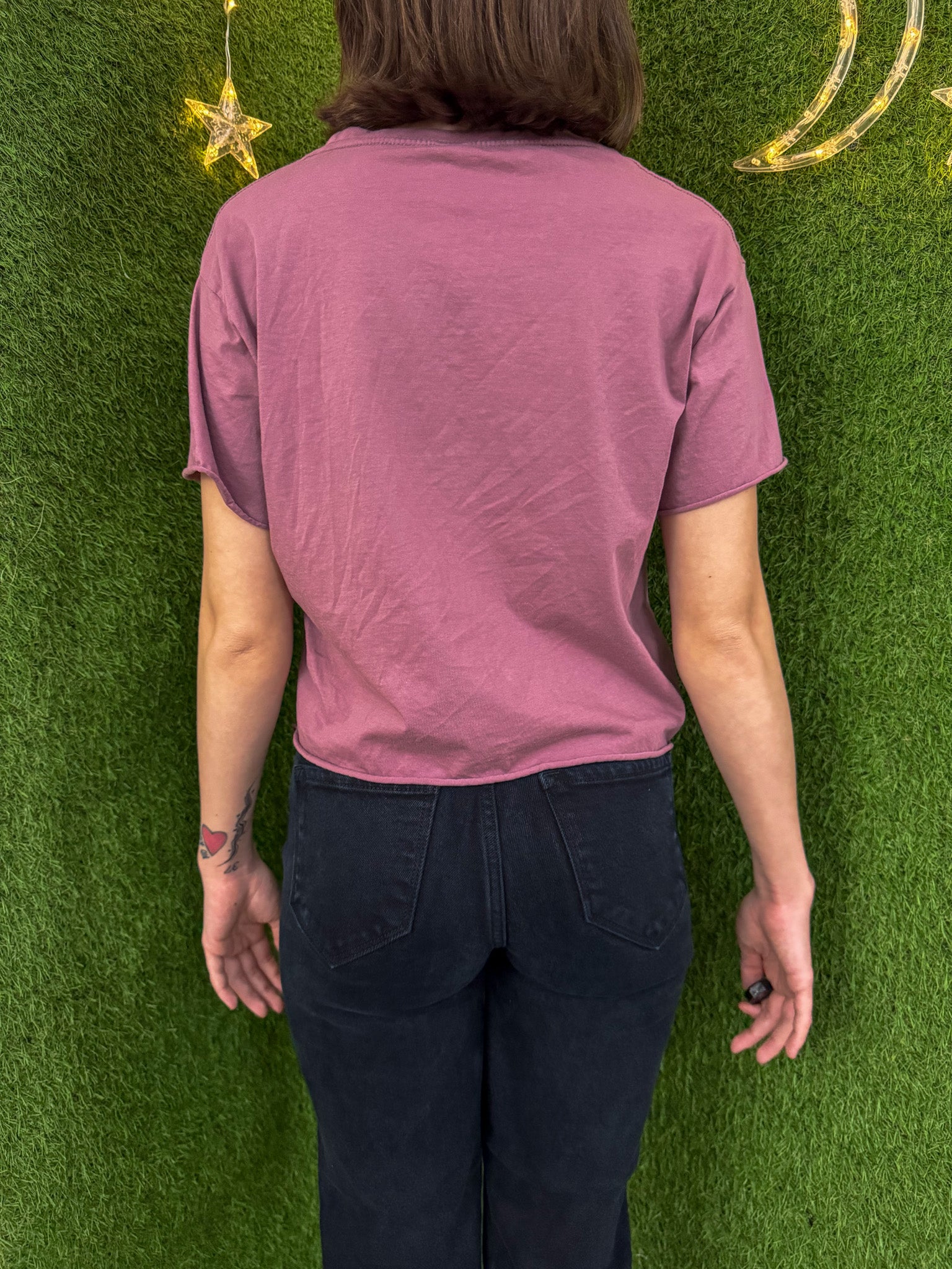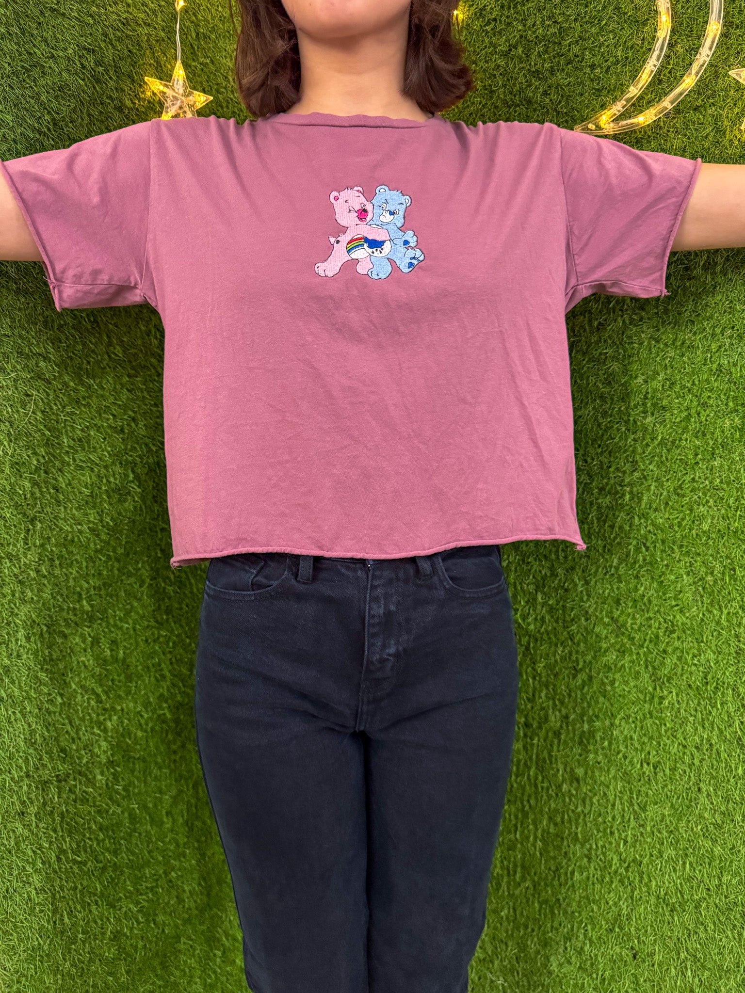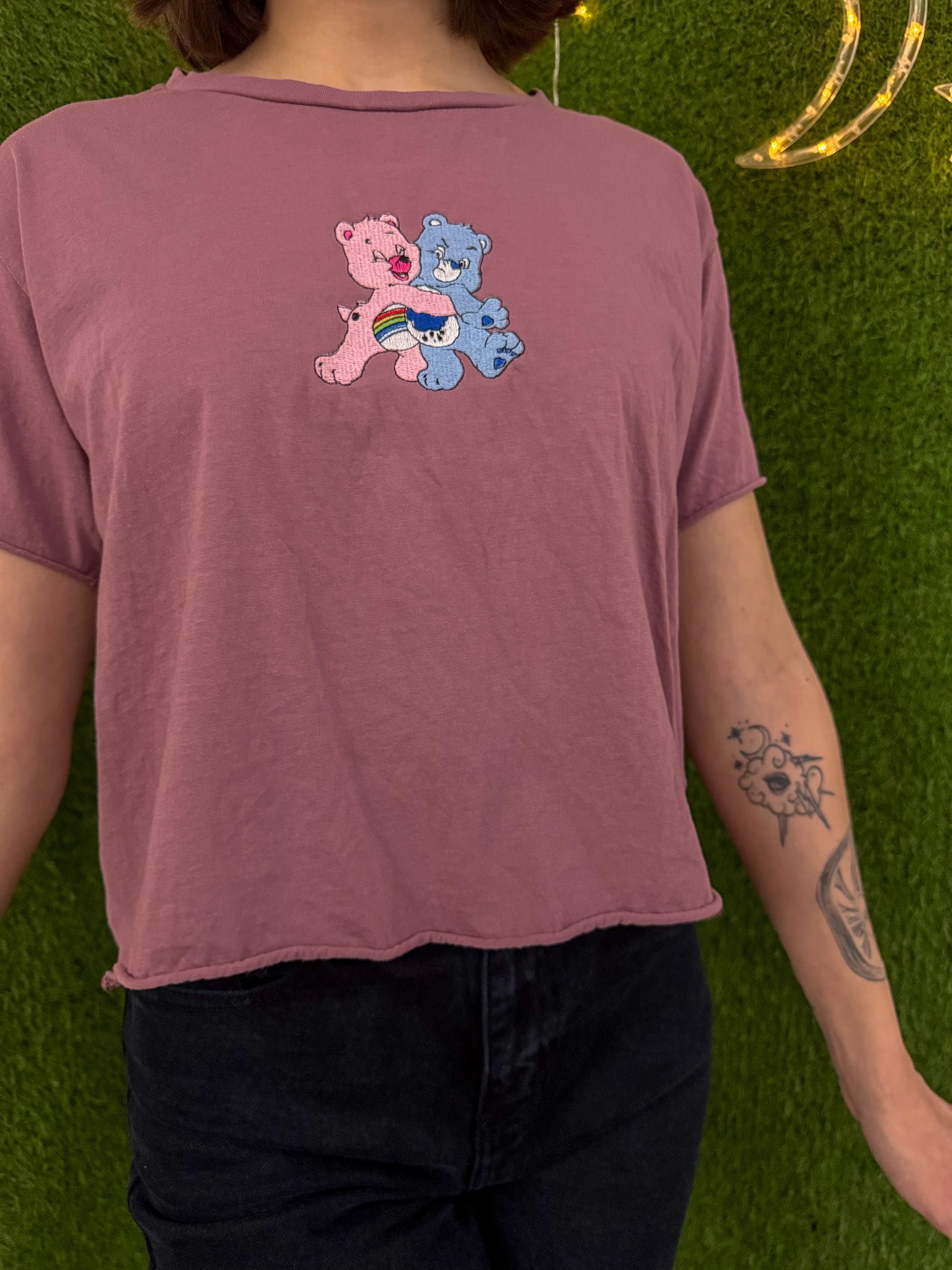 Rock this Care Bear Mauve Cropped T-Shirt, featuring delicate embroidery. Support our small biz and the planet with this upcycled, secondhand garment. Made sustainably and with slow fashion in mind<3