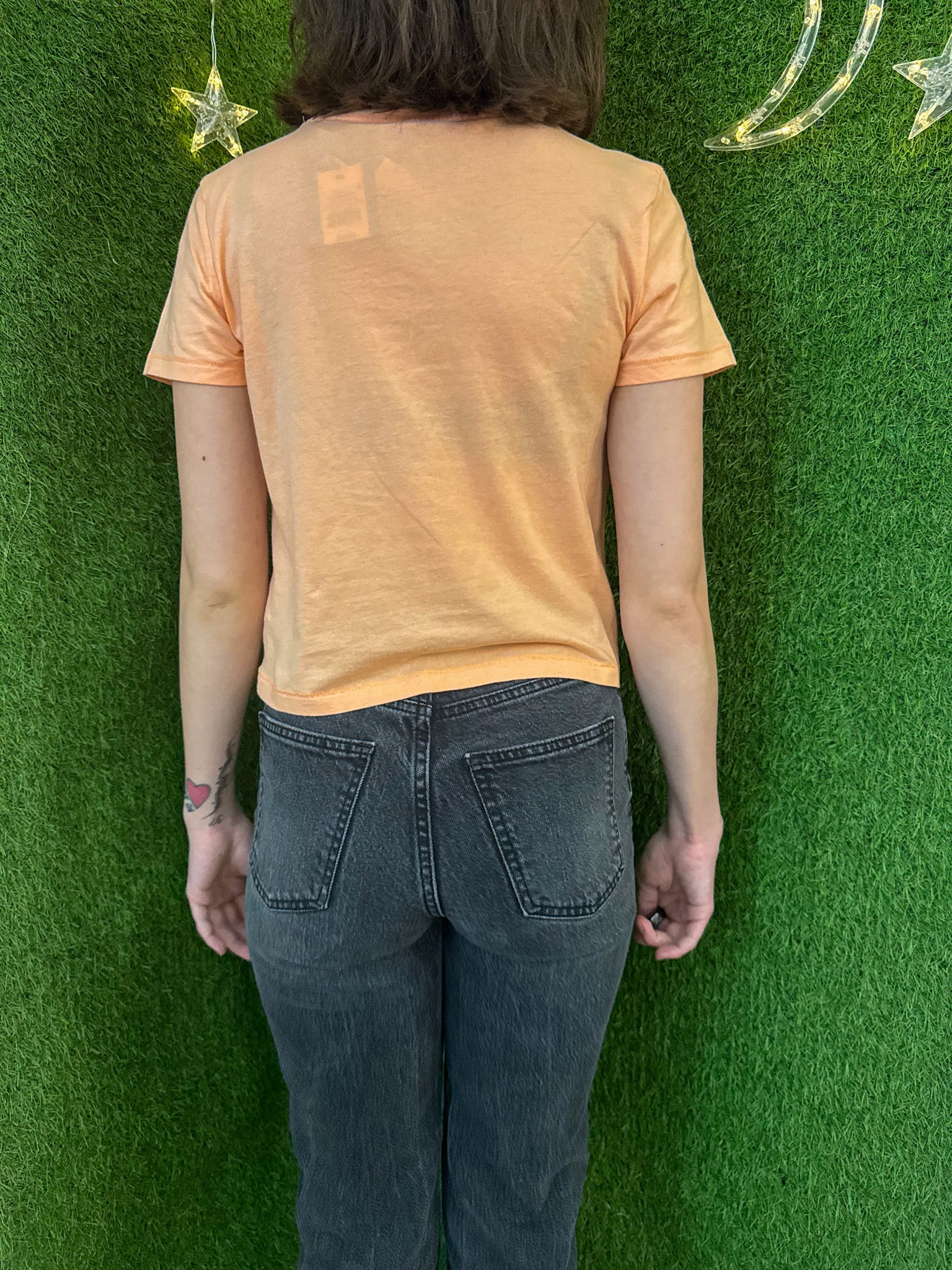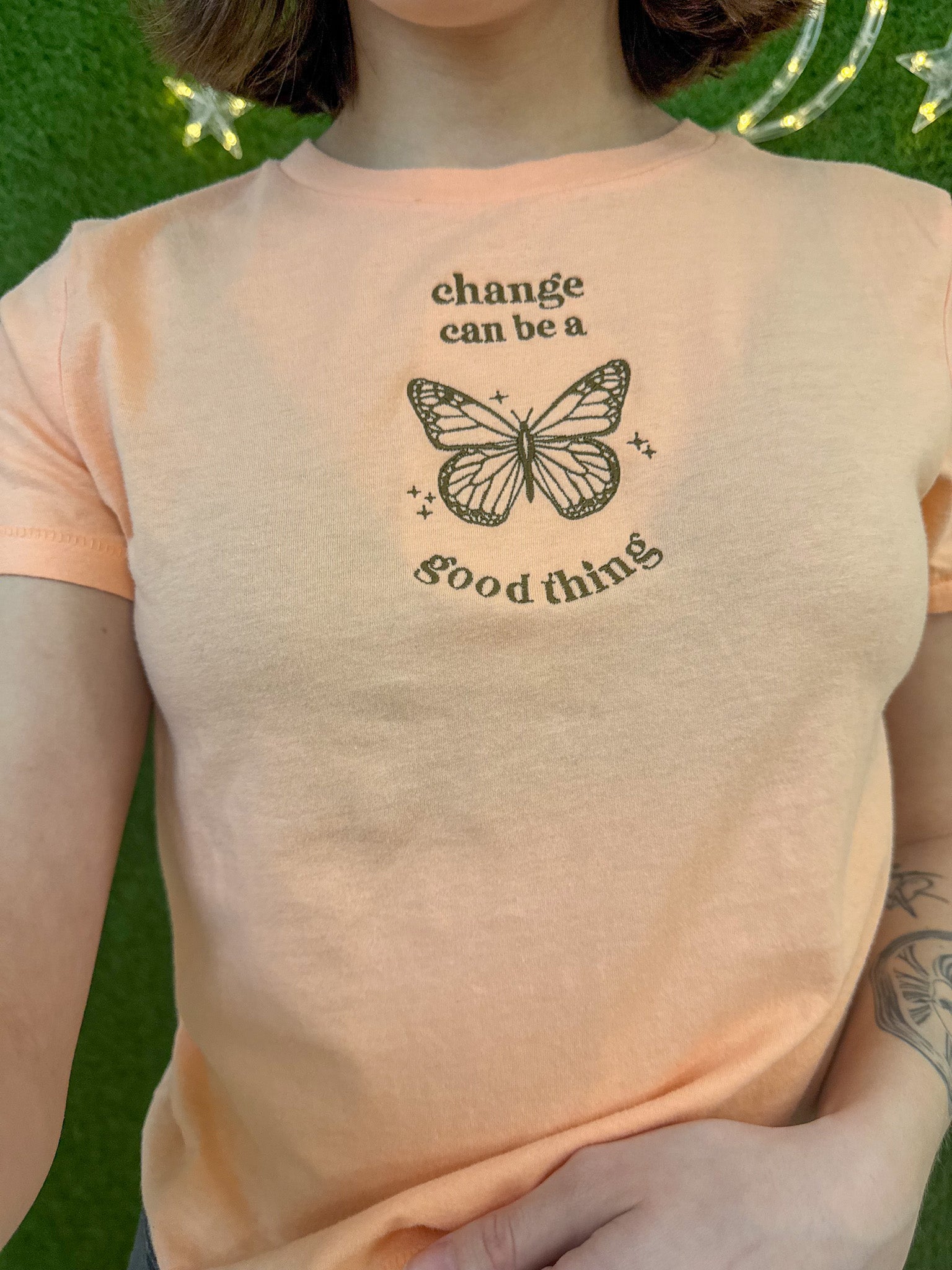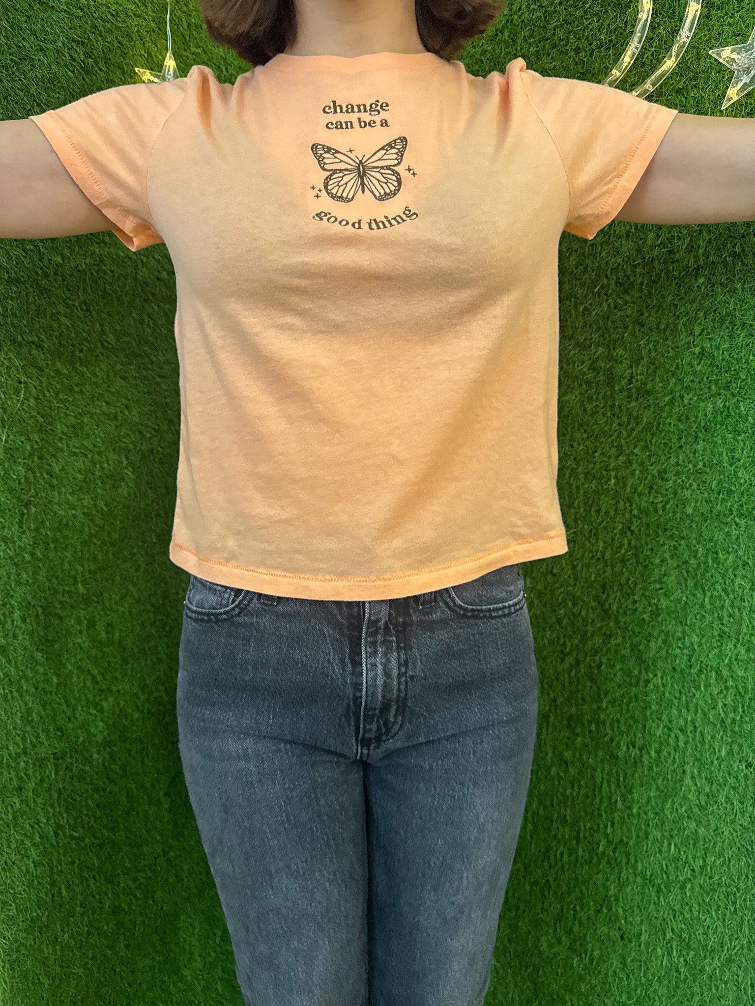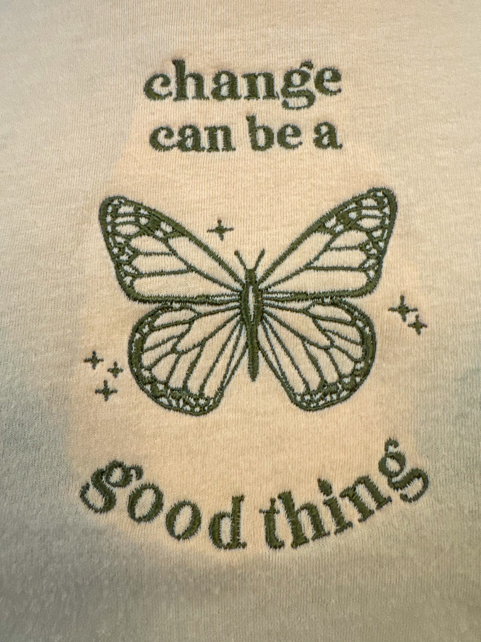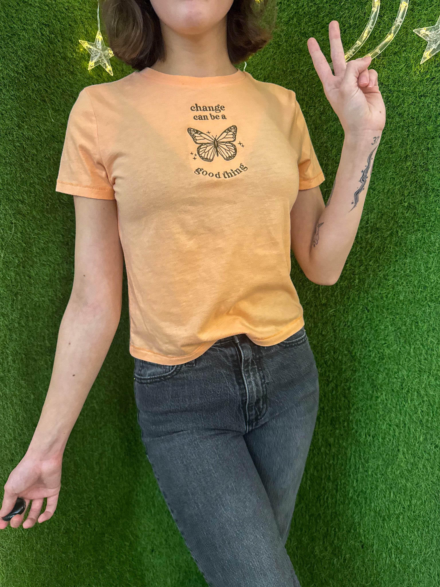 Add a pop of color and support our small biz with this Change Butterfly Orange T-Shirt. Embroidered with a beautiful butterfly & motivational text, this secondhand garment is upcycled, sustainable, and made with slow fashion in mind. A perfect addition to any wardrobe!