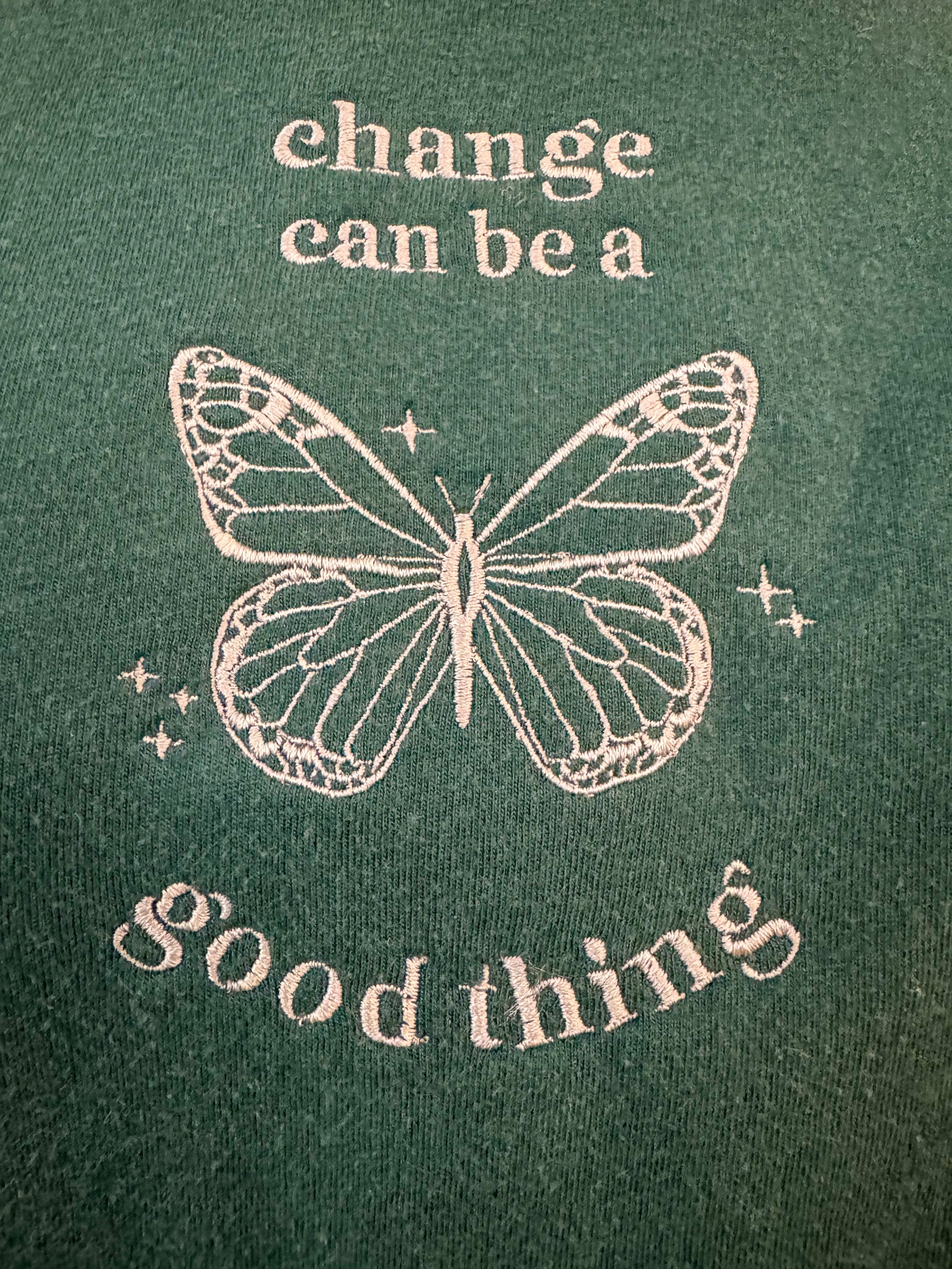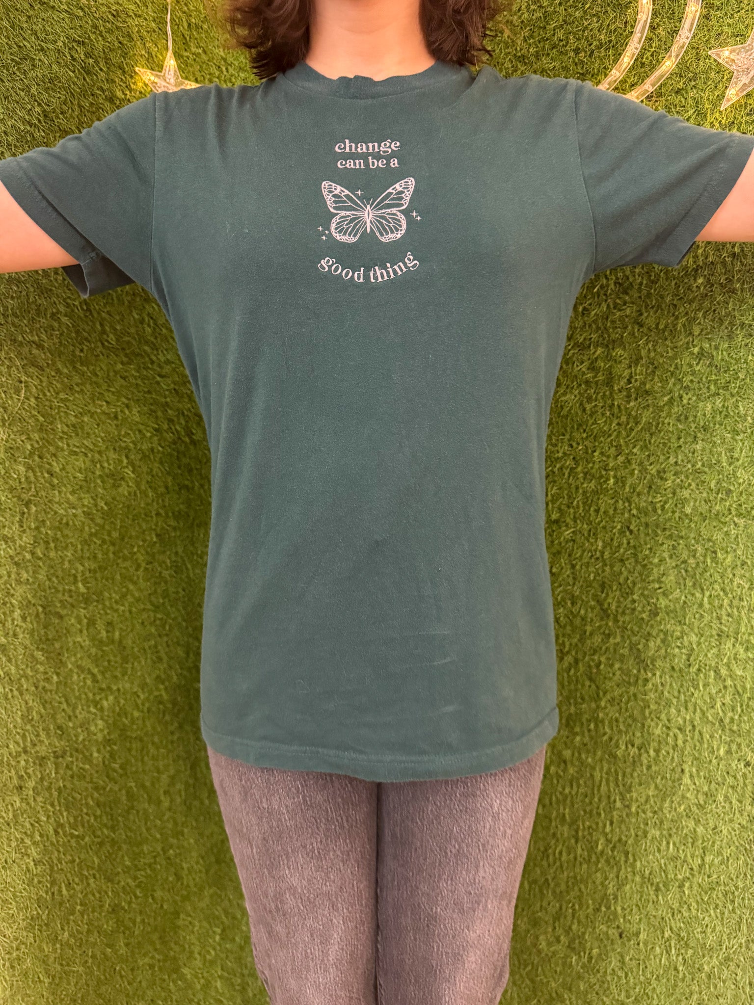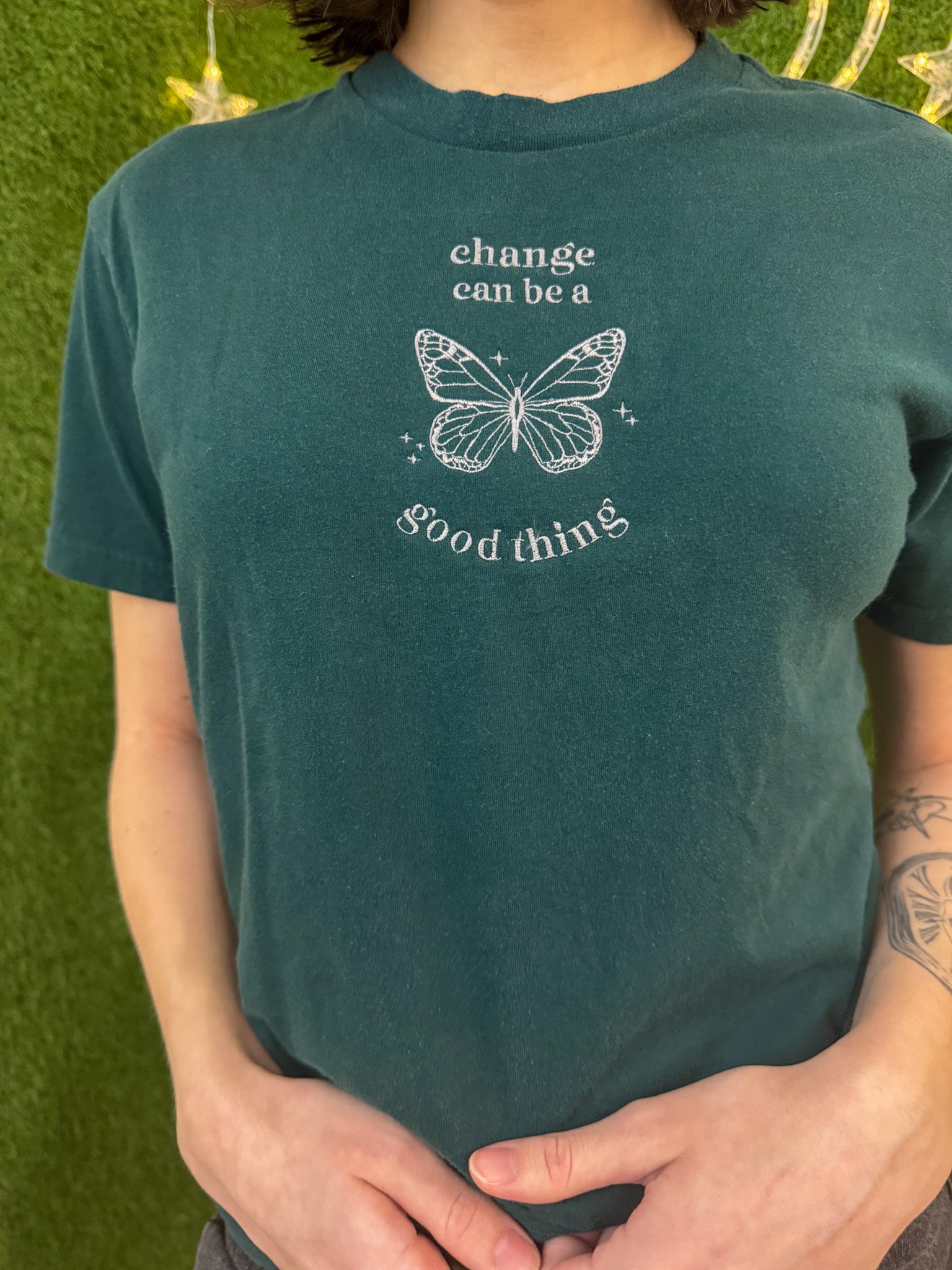 Elevate your wardrobe with our Change Can Be a Good Thing Teal T-Shirt! Featuring our vibrant embroidered design, you'll not only look stylish but also support our small business. This upcycled and sustainable piece adds to the slow fashion movement. Embrace change with this secondhand garment<3