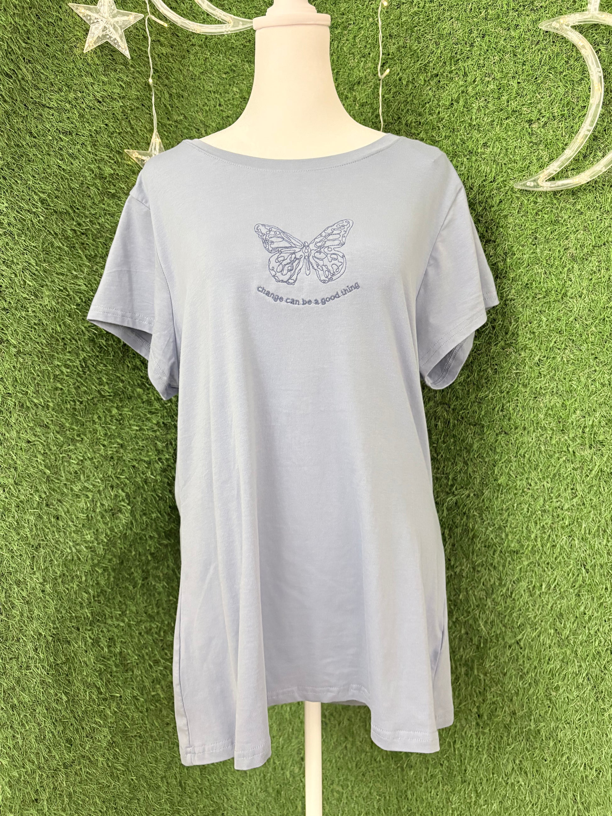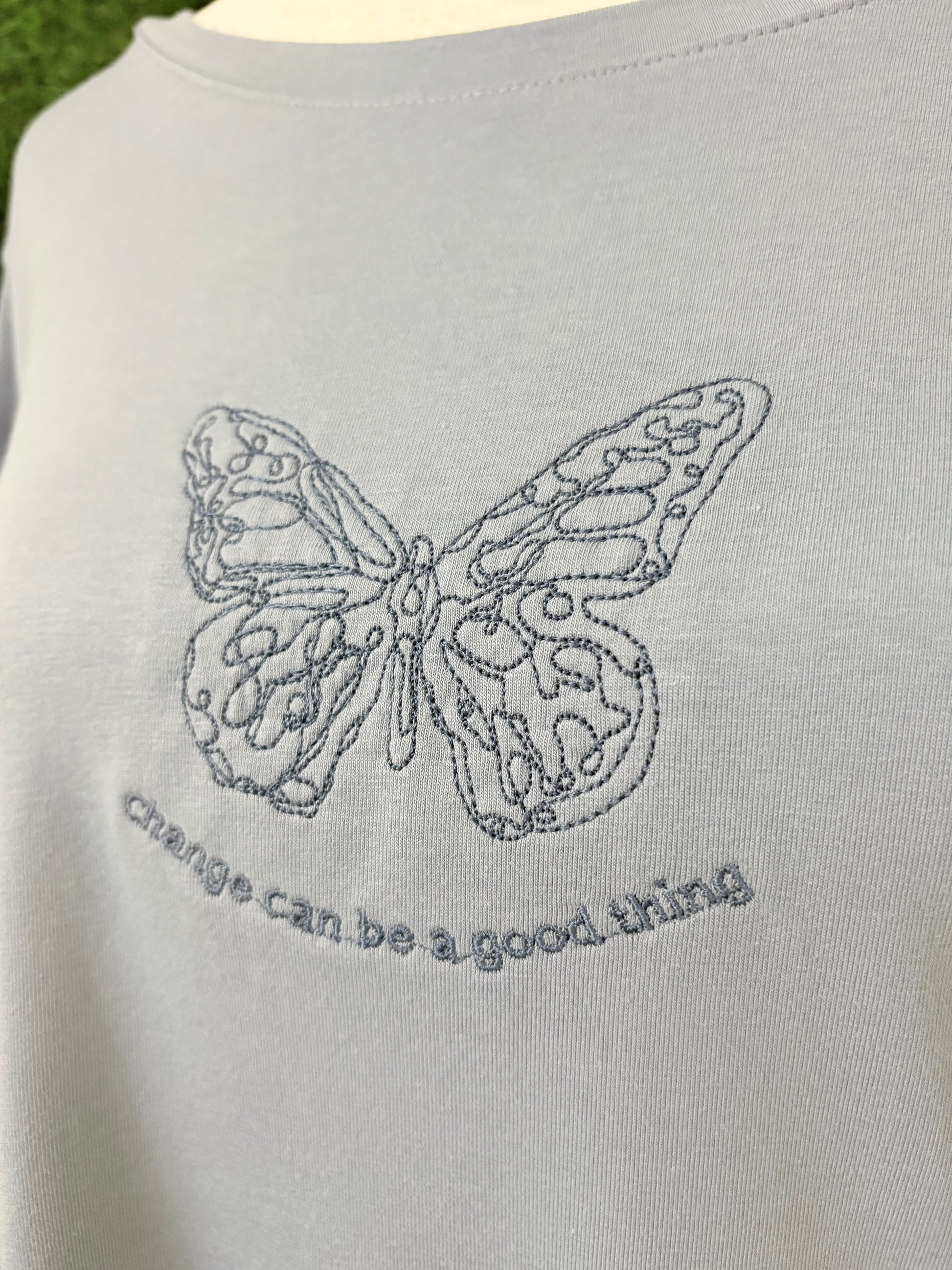 This cozy blue tee celebrates slow fashion with sustainable materials and a relaxed fit<3