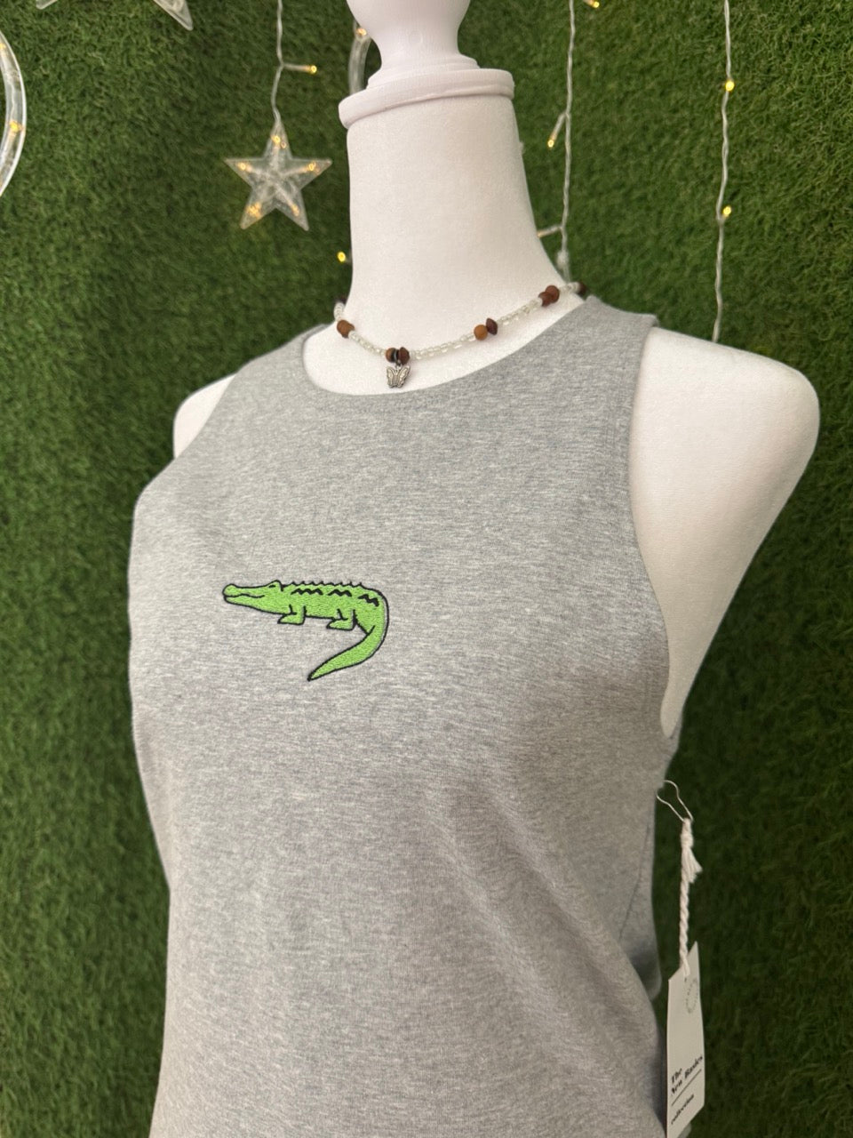 Celebrate style with a playful twist in this Crocodile Grey Tank Bodysuit. Featuring charming embroidered details on a secondhand garment, it’s a fresh take on slow fashion that’s kind to the planet. Perfect for layering or rocking solo, this bodysuit combines comfort and eco-conscious flair for your wardrobe’s new favorite!