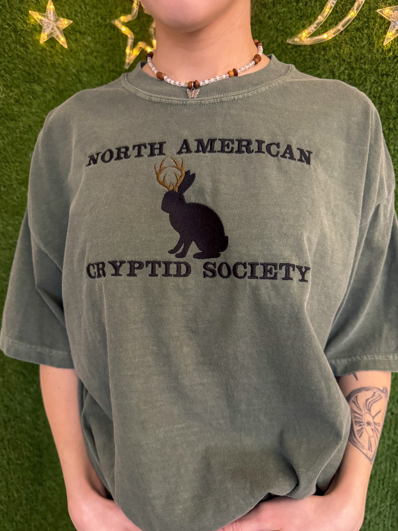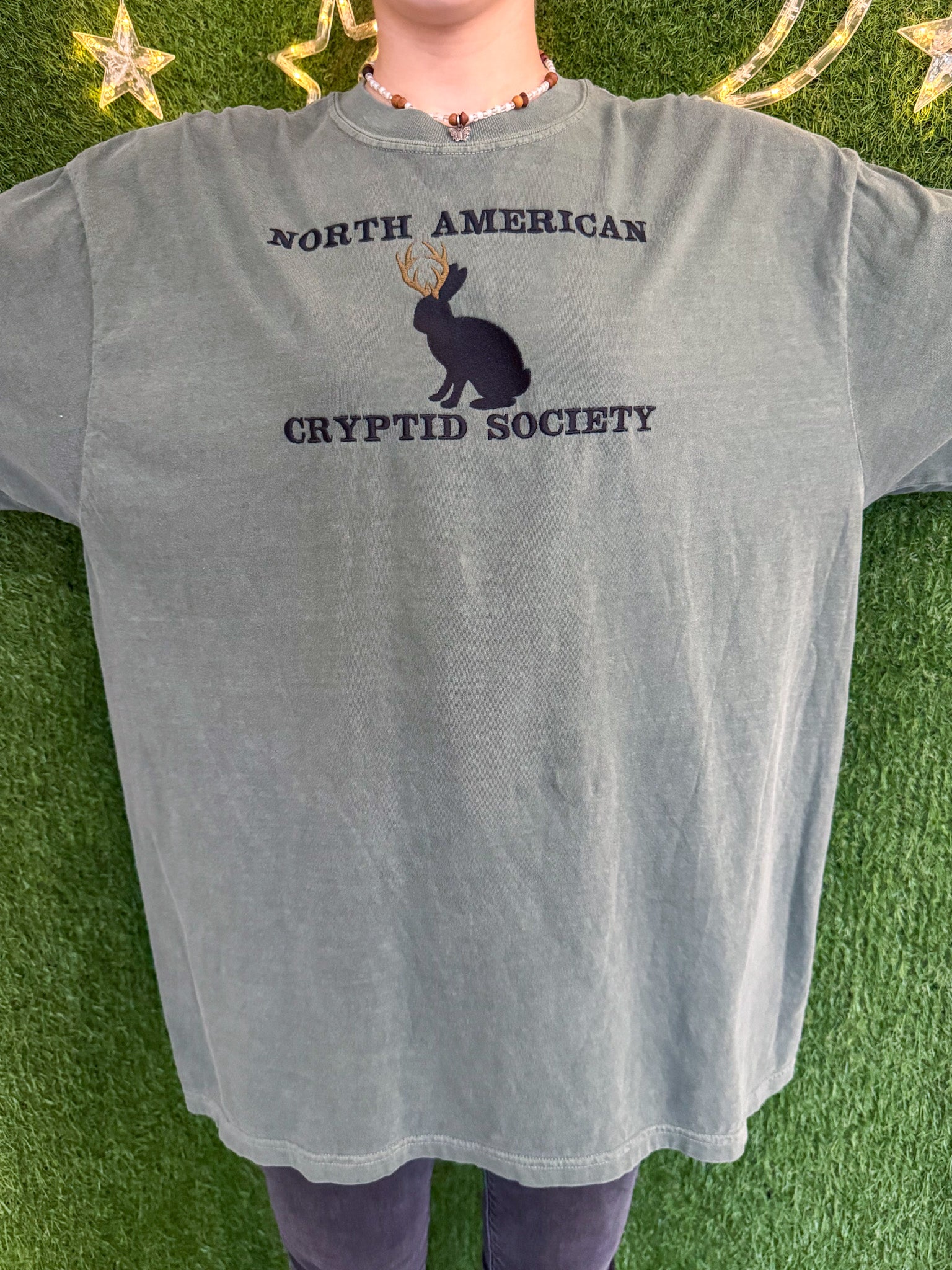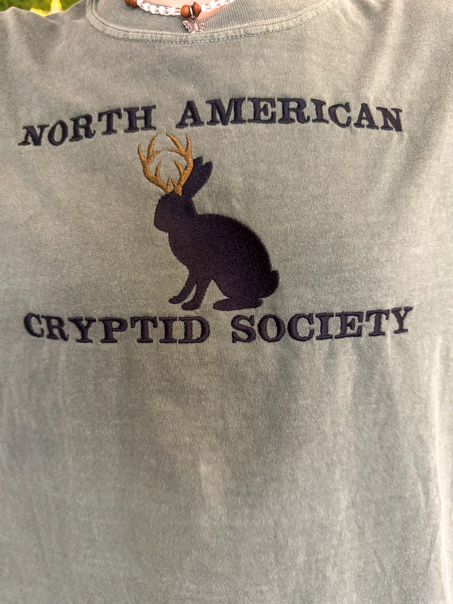 Show off your eco-friendly style in our embroidered Jackalope Green T-Shirt. Made from upcycled, secondhand materials, this sustainable garment supports our small business and promotes slow fashion<3