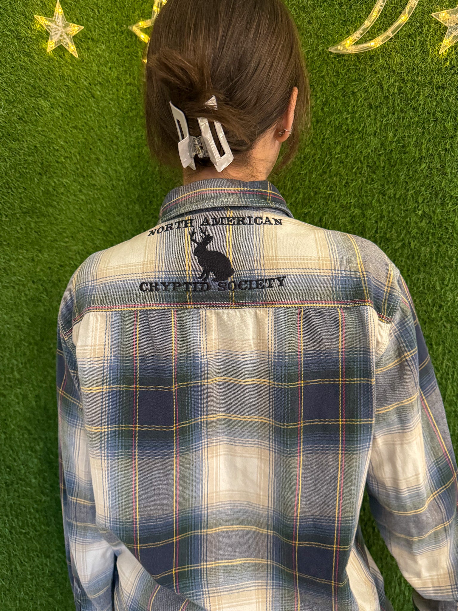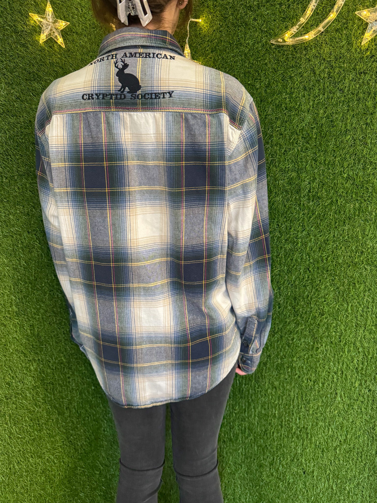 Support slow fashion with our upcycled Jackalope Plaid Flannel. Embroidered with our logo, this secondhand garment is sustainable and eco-friendly. By purchasing, you are supporting our small business and helping to reduce waste in the fashion industry!!