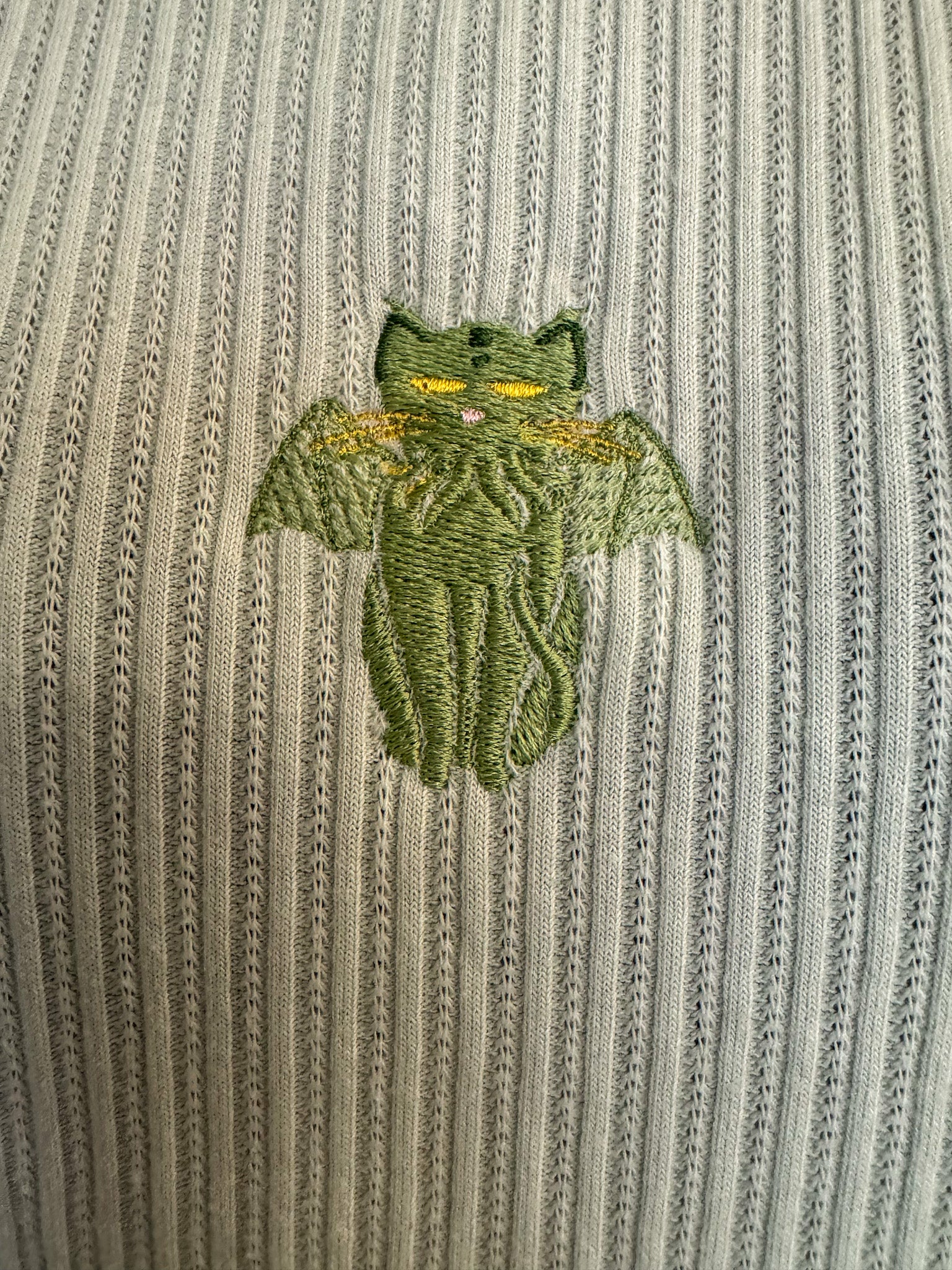 Brighten up your wardrobe with our Cthulhu Cat Light Green Tank Top! This embroidered top not only supports our small biz, but also promotes sustainable fashion with its secondhand and upcycled design. Add some slow fashion to your wardrobe and make a statement!!!
