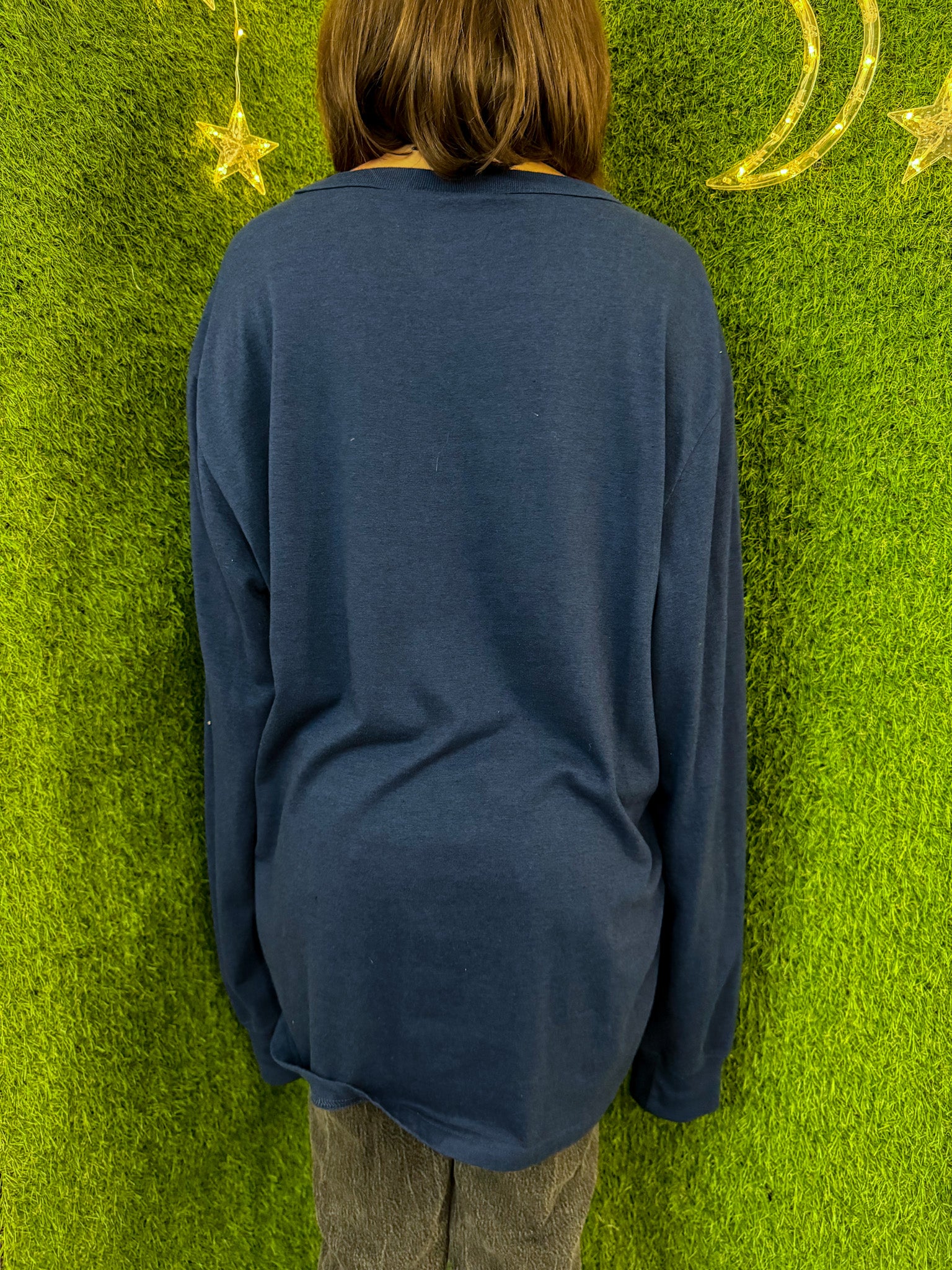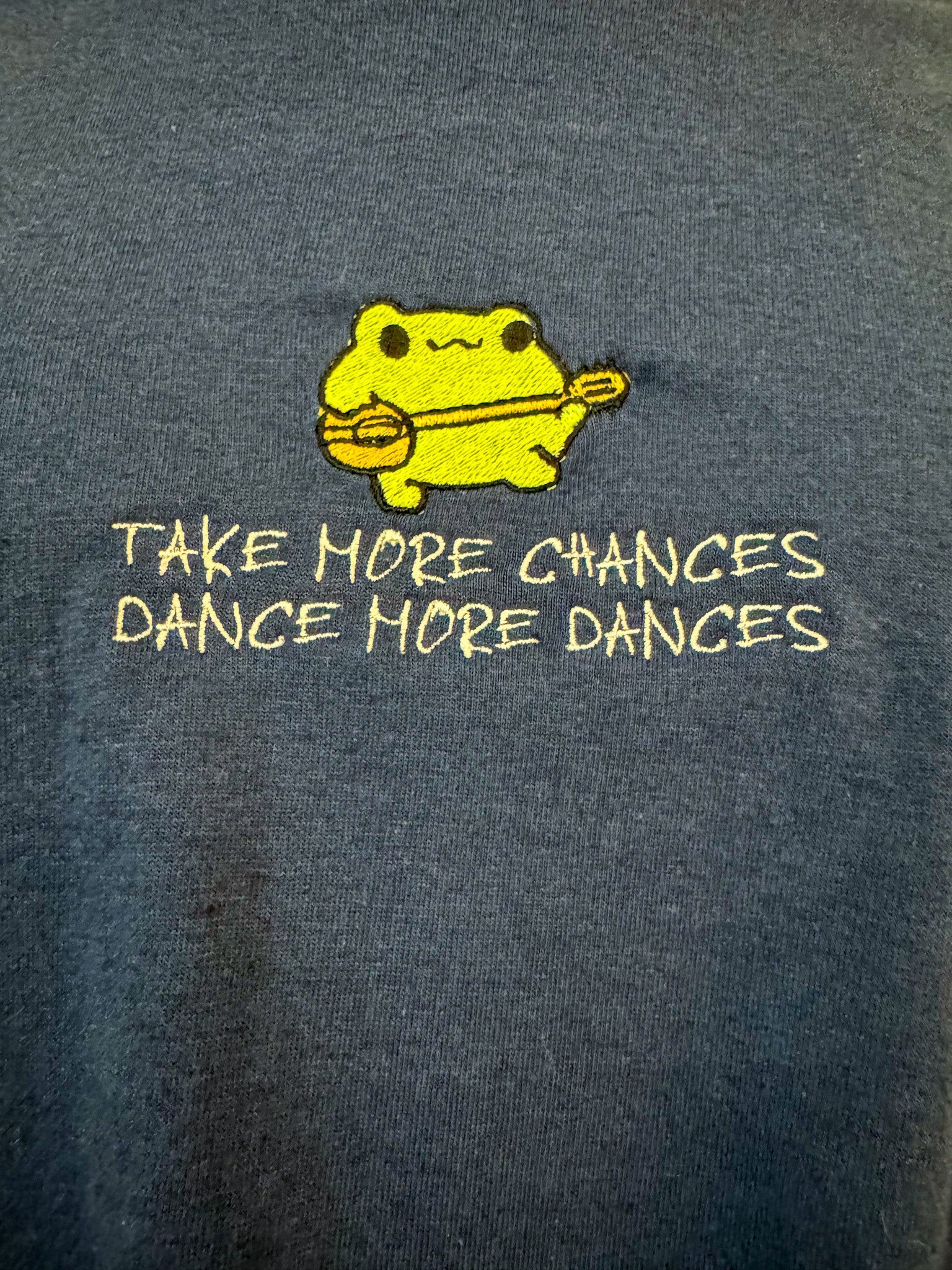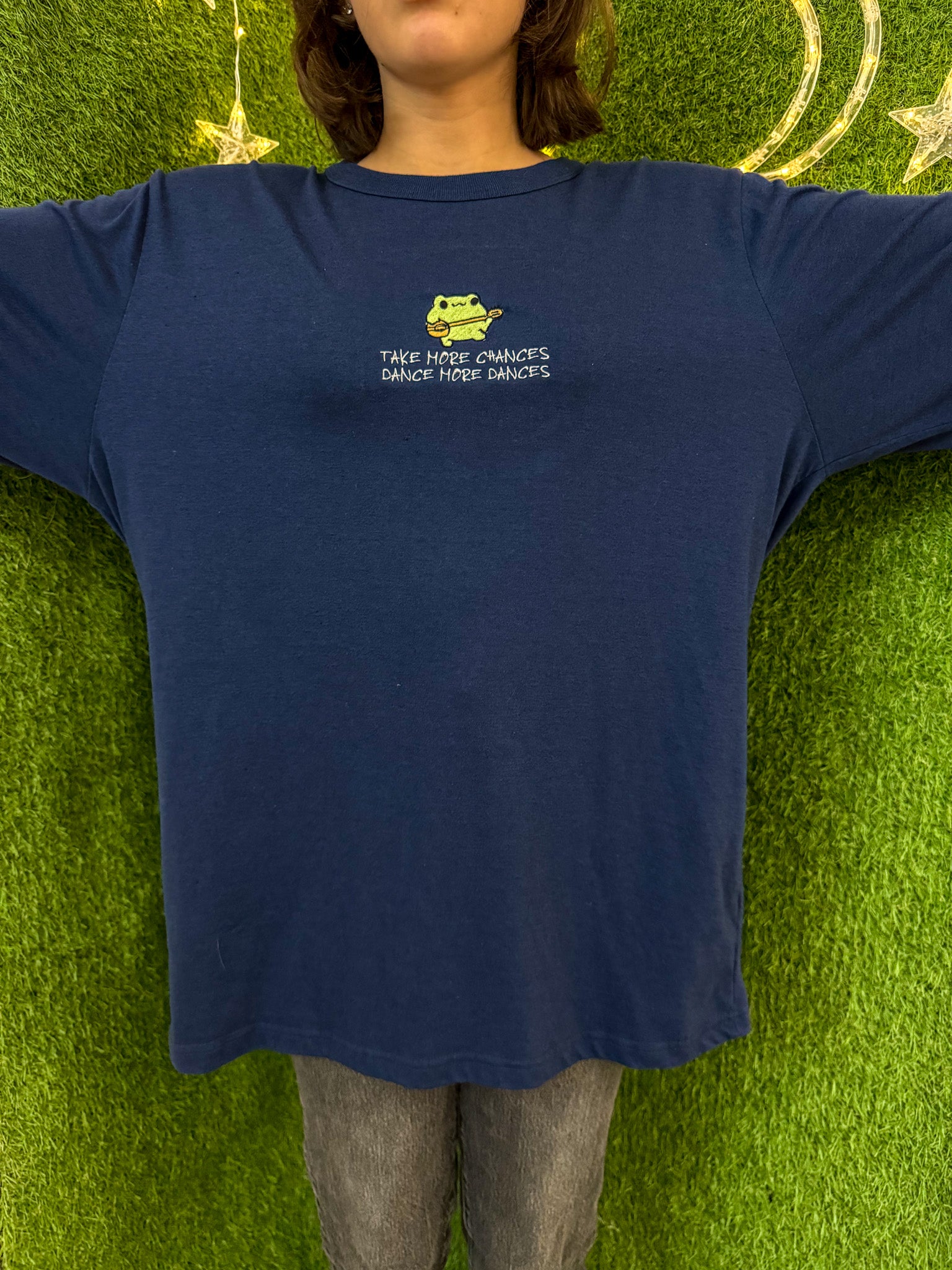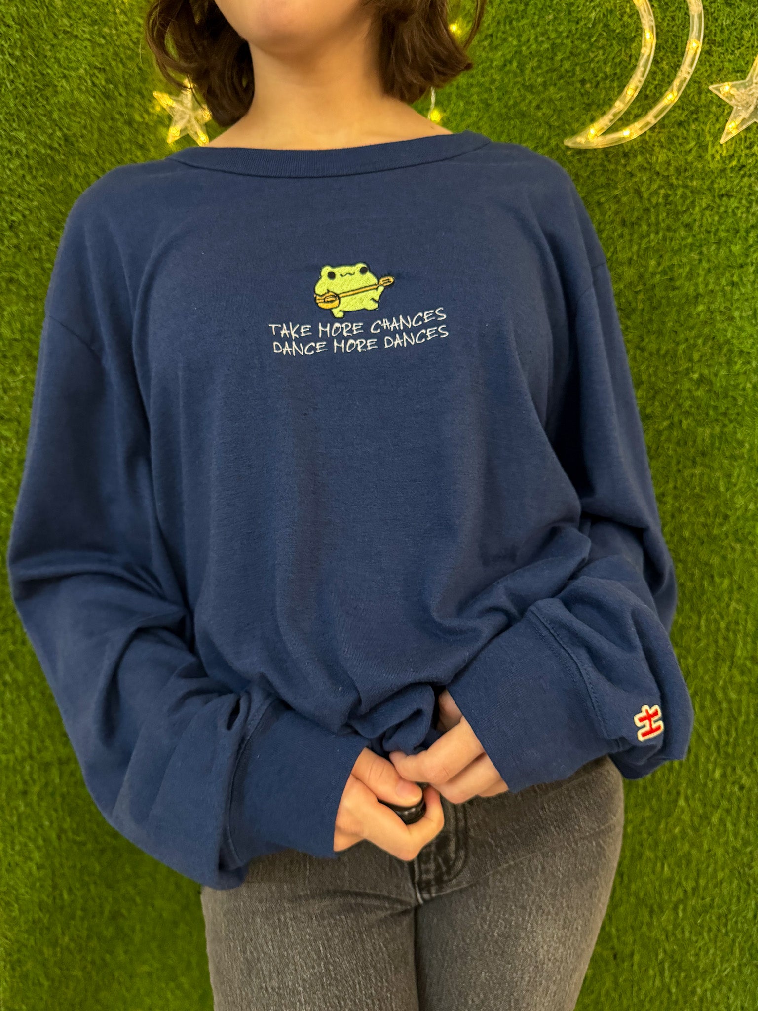Revamp your wardrobe with the Dancing Frog Navy Long Sleeve shirt. This upcycled and sustainable piece features embroidered details and supports our small biz, making it a must-have for slow fashion enthusiasts. Elevate your style while making a positive impact on the environment!