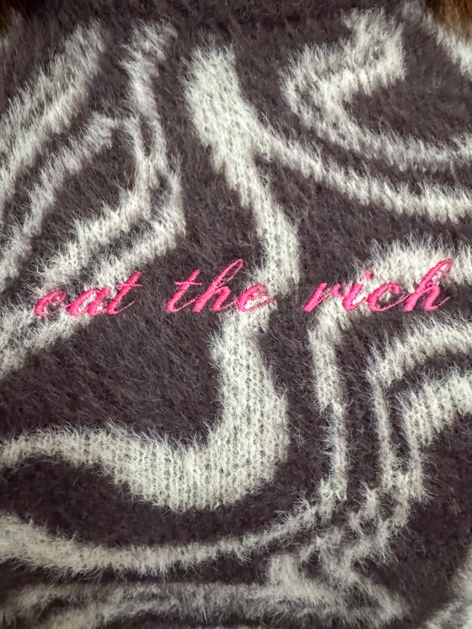Get funky with our Eat the Rich Black and White Cropped Sweater! Embroidered with care, this secondhand garment not only supports our small biz, but also promotes sustainable and slow fashion<3
