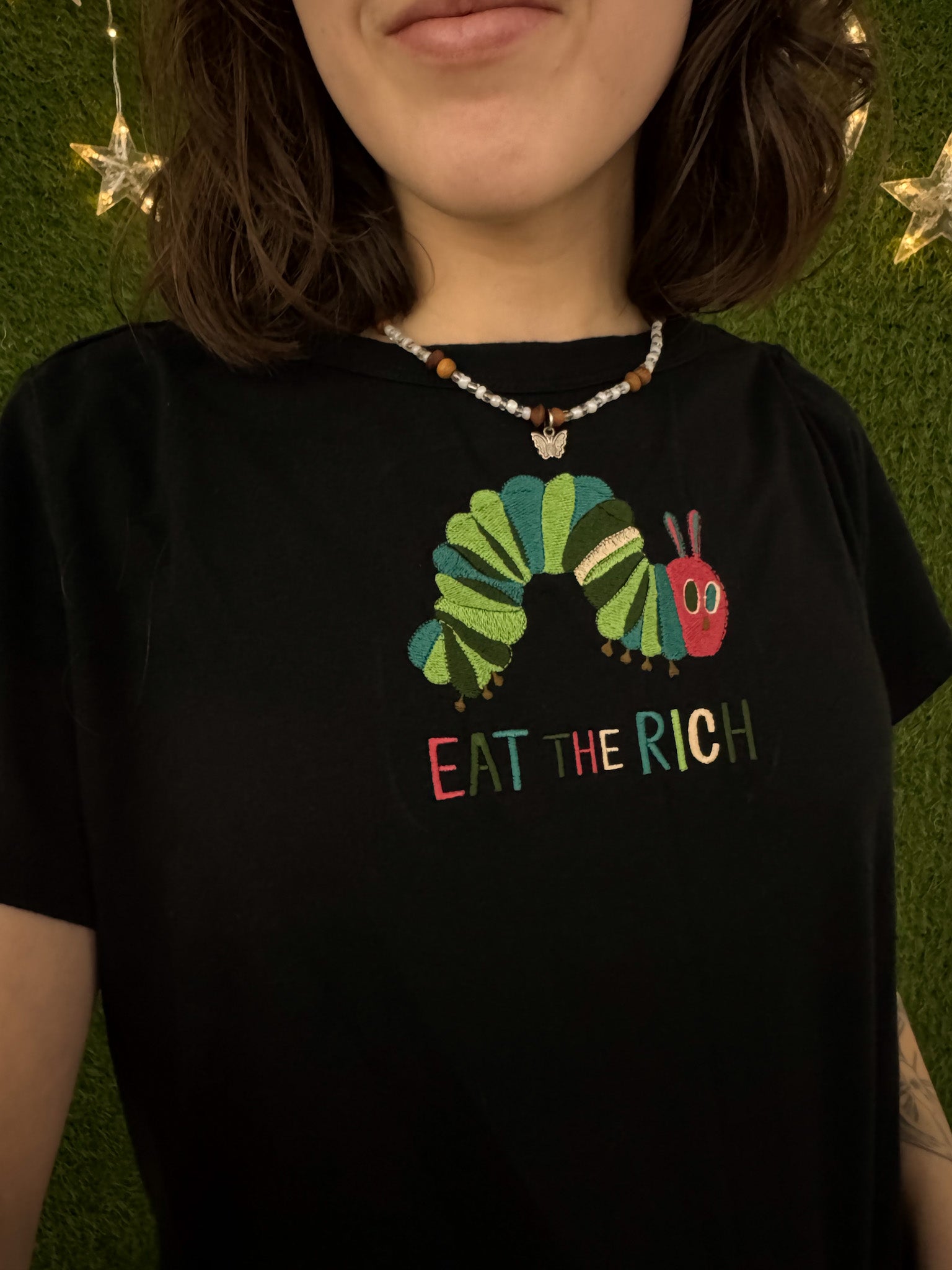 Join the slow fashion movement with our Eat the Rich Black Baby Tee. Made from upcycled materials, this embroidered tee is not only sustainable but also supports small businesses. Be eco-conscious and fashionable at the same time!!