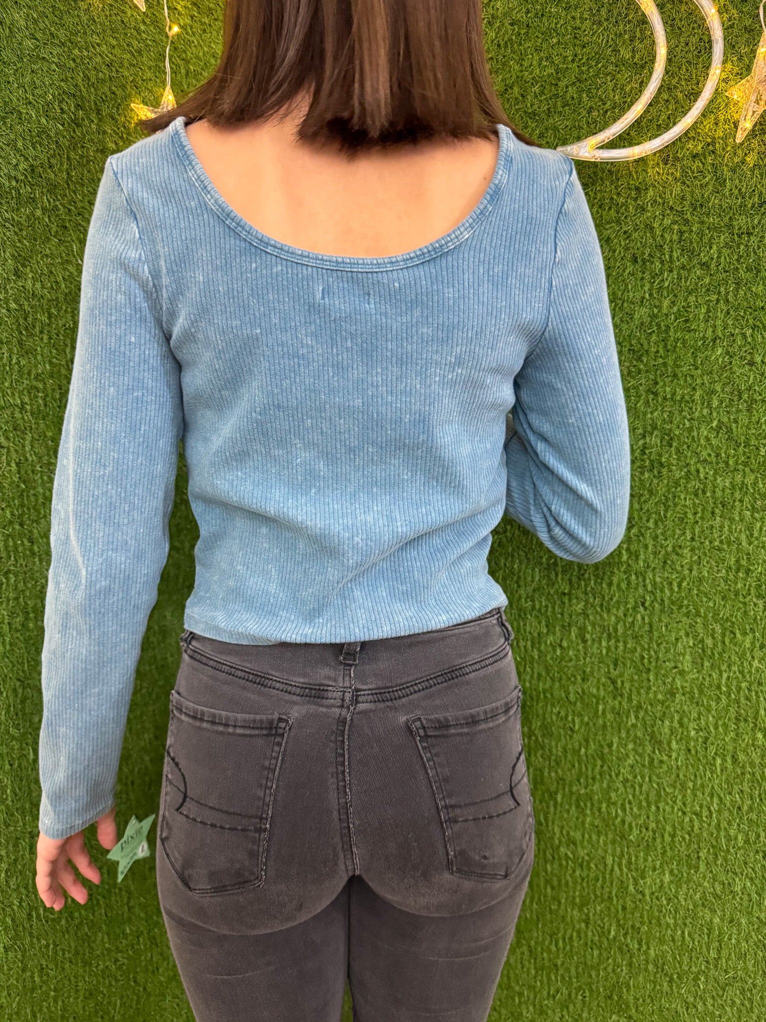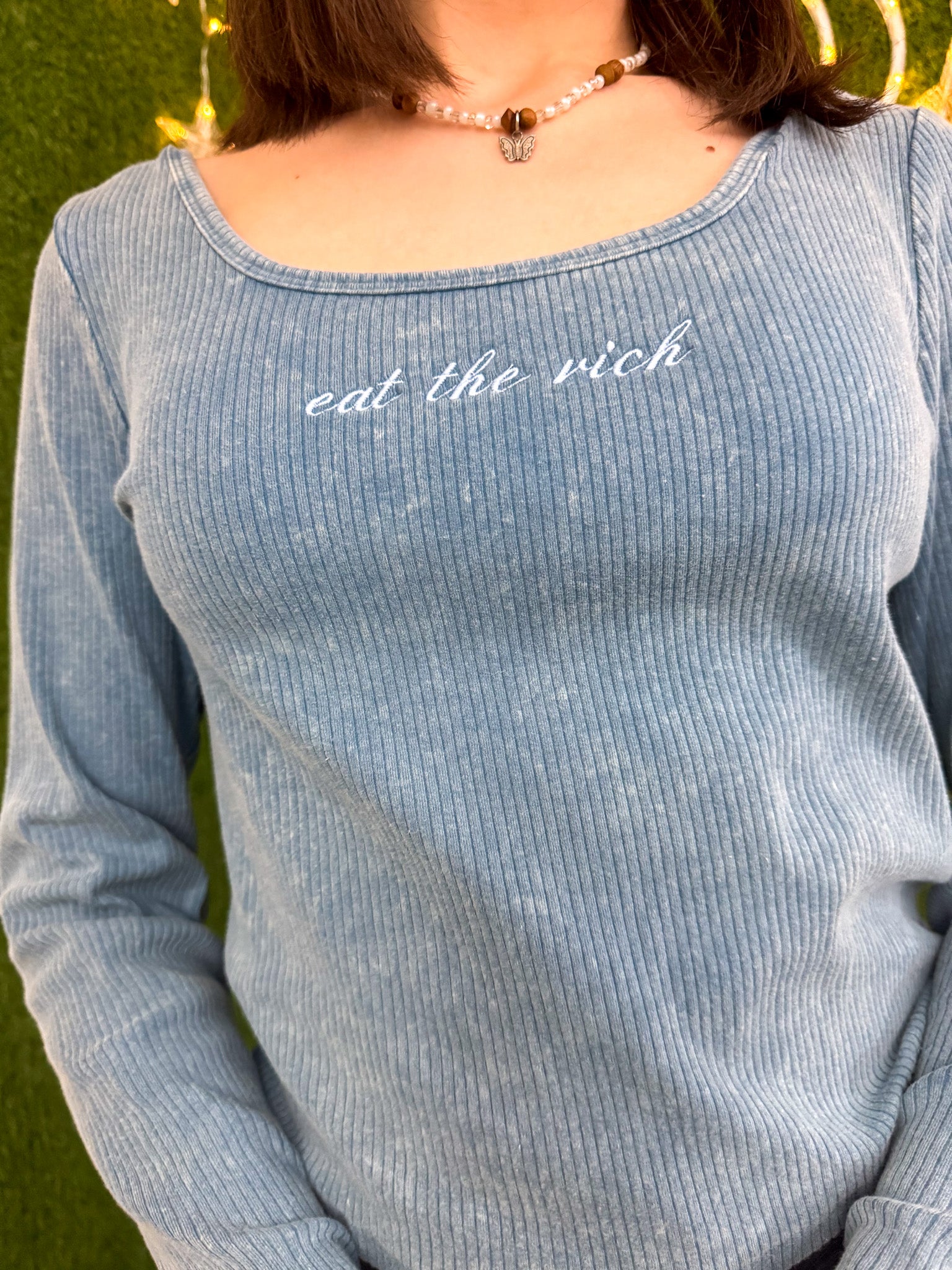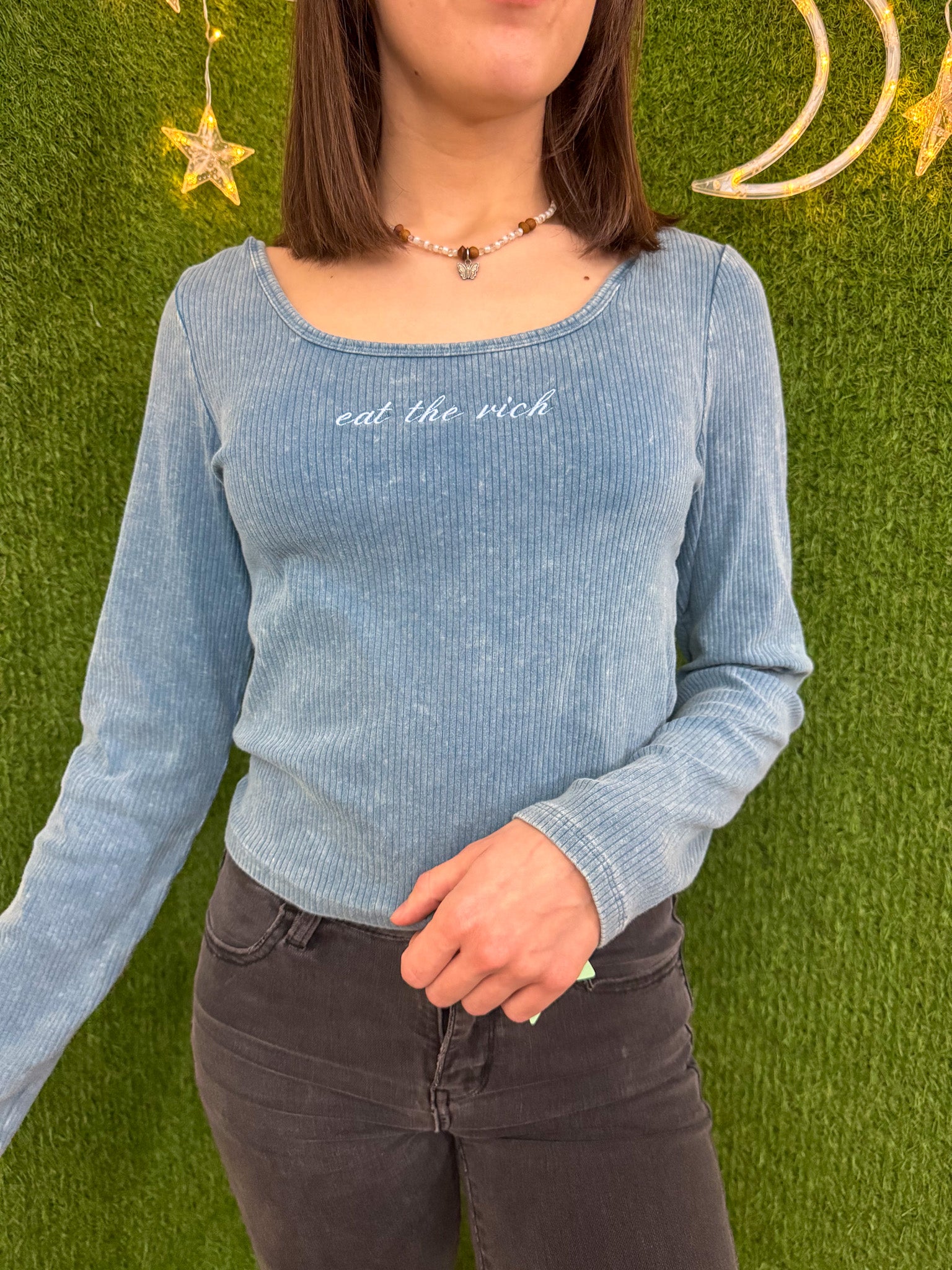 Elevate your style while supporting small businesses with our Eat The Rich Blue Cropped Long Sleeve. This upcycled secondhand garment features playful embroidered details, making it a sustainable choice for your wardrobe. Join the slow fashion movement with this quirky and unique piece!