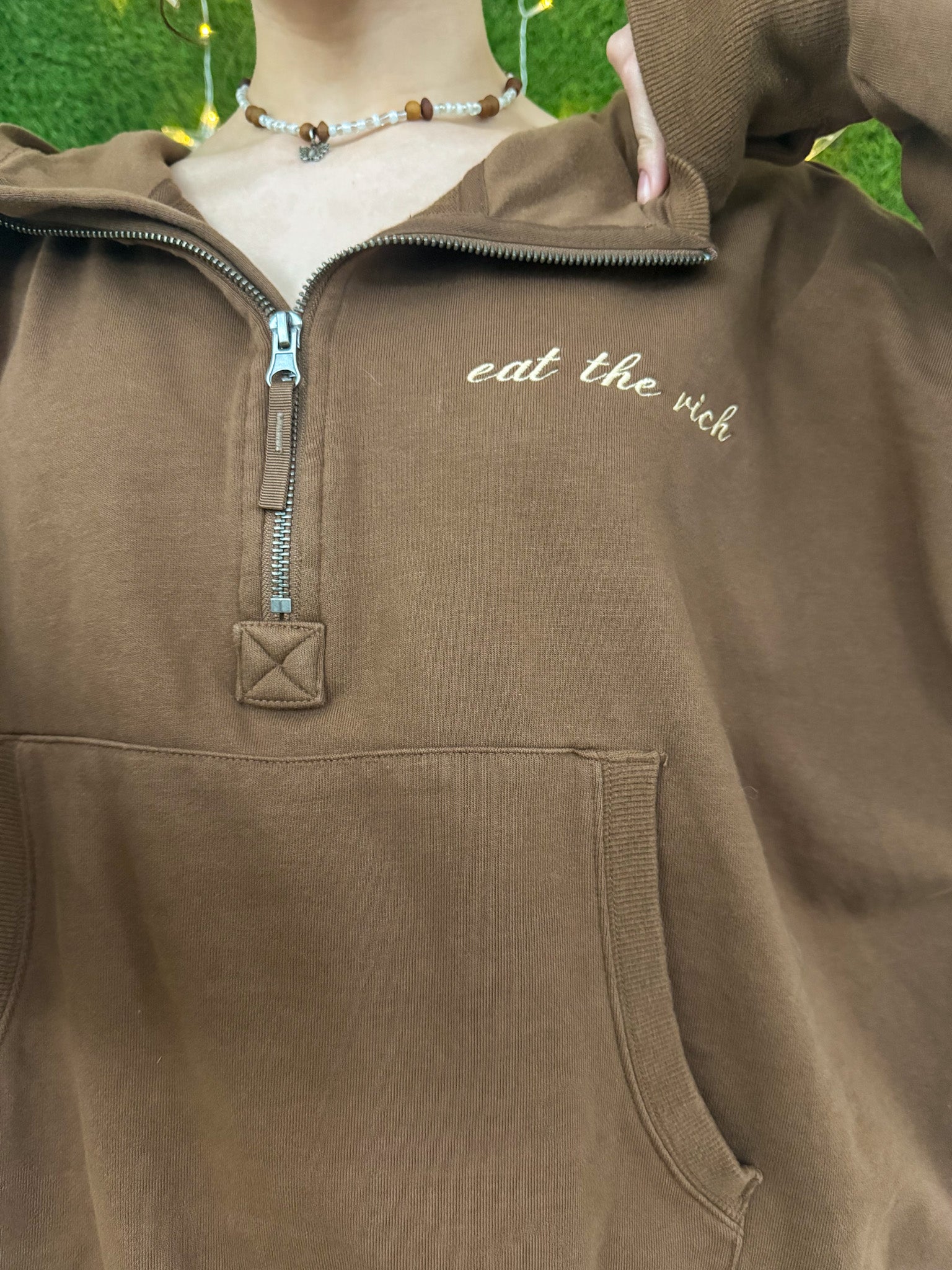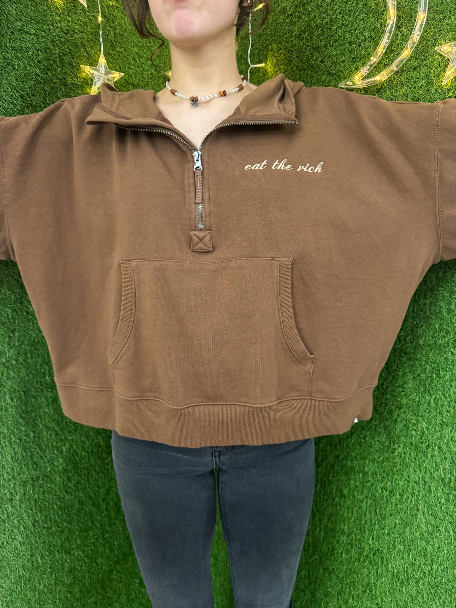 Support sustainable fashion with our embroidered Eat the Rich Brown Cropped Quarter Zip Hoodie. Made from upcycled, secondhand materials, this slow fashion piece not only supports small businesses but also helps reduce waste in the fashion industry. Stay stylish and eco-friendly with this unique hoodie!