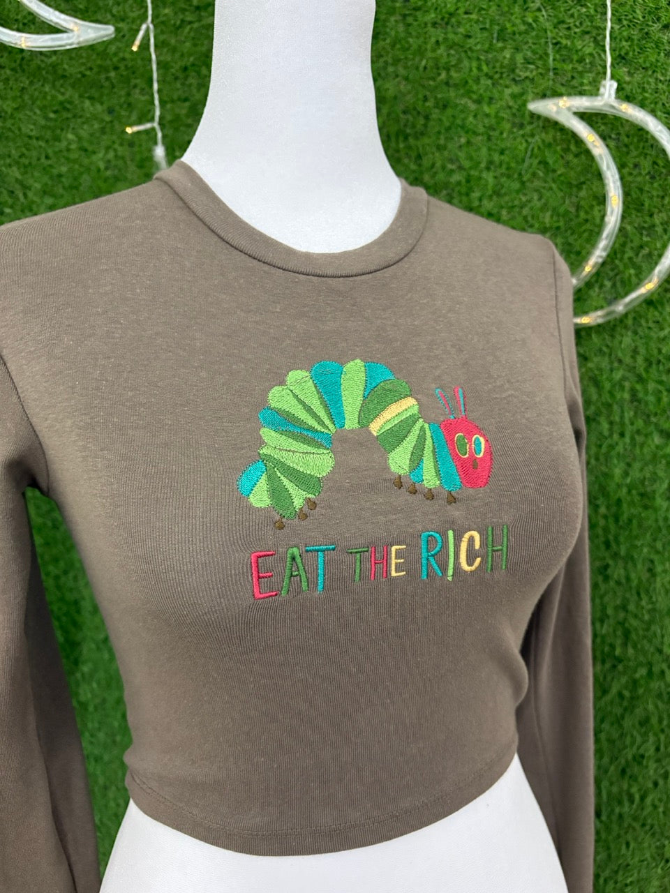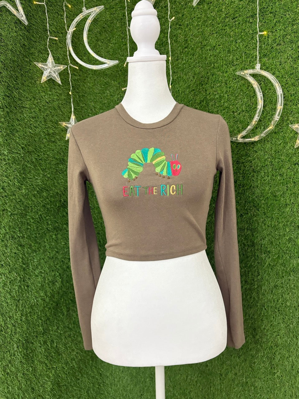 Eat the Rich Caterpillar Brown Cropped Long Sleeve M