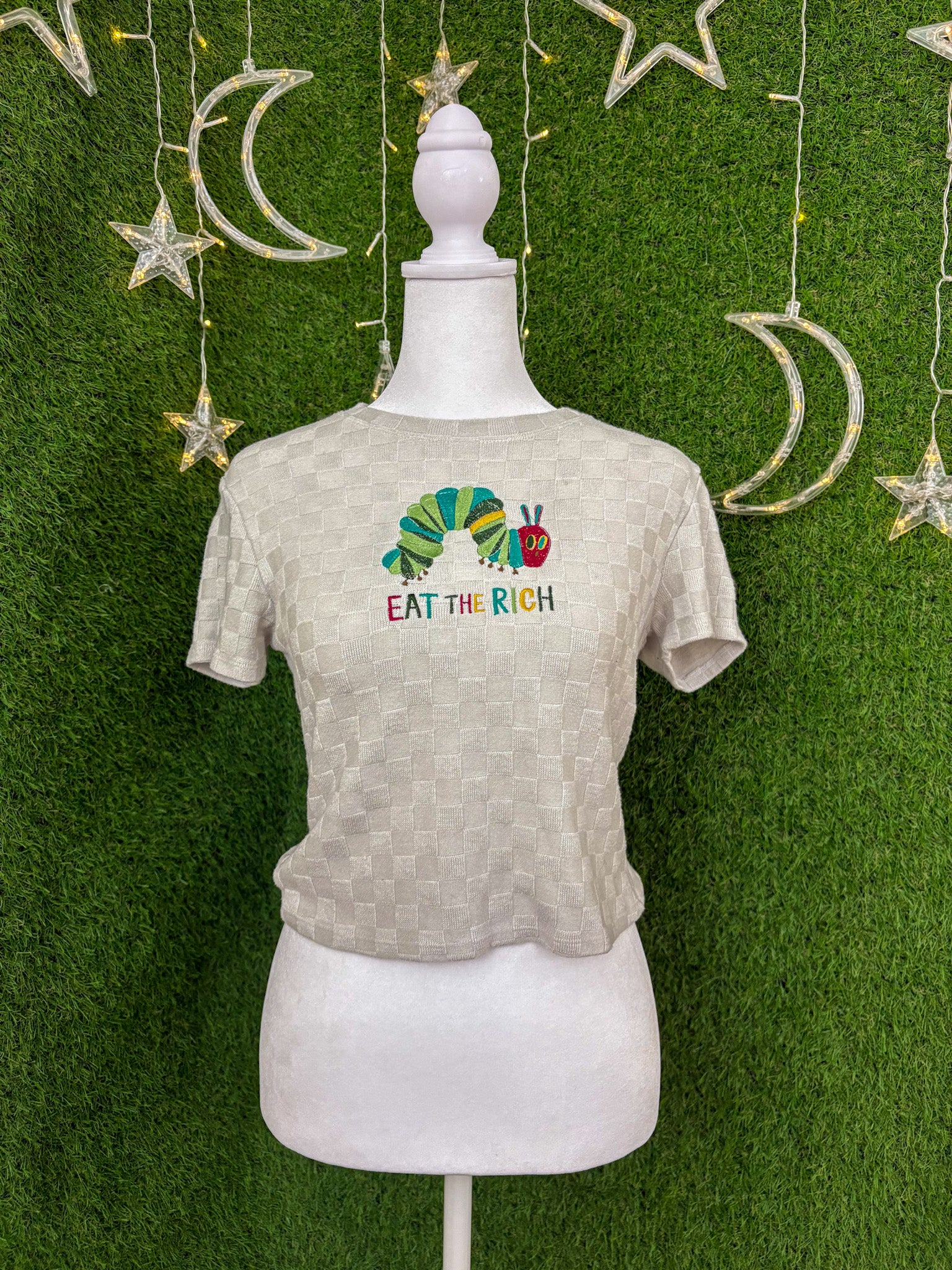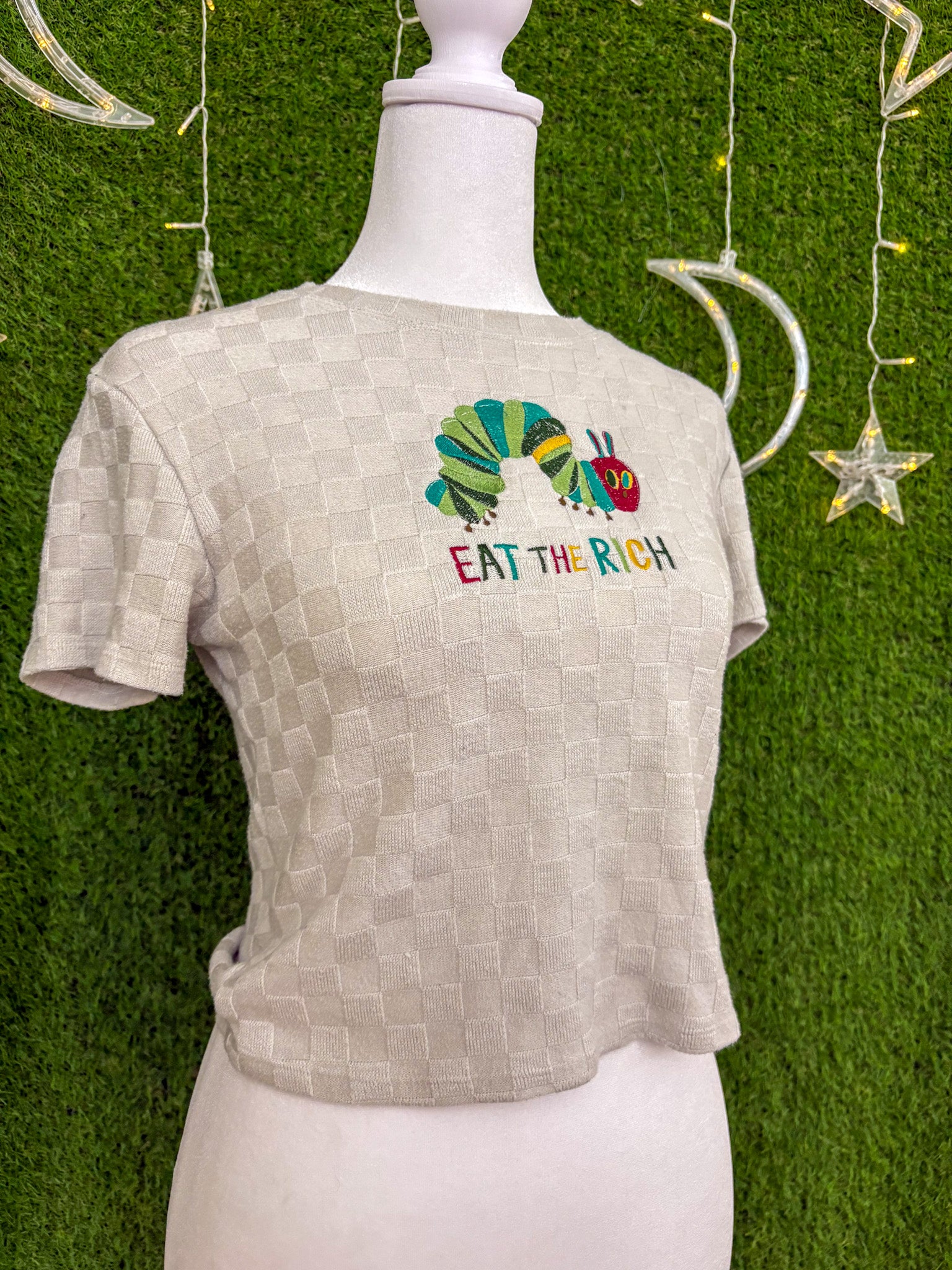Eat the Rich Caterpillar Patterned Cropped Baby Tee L