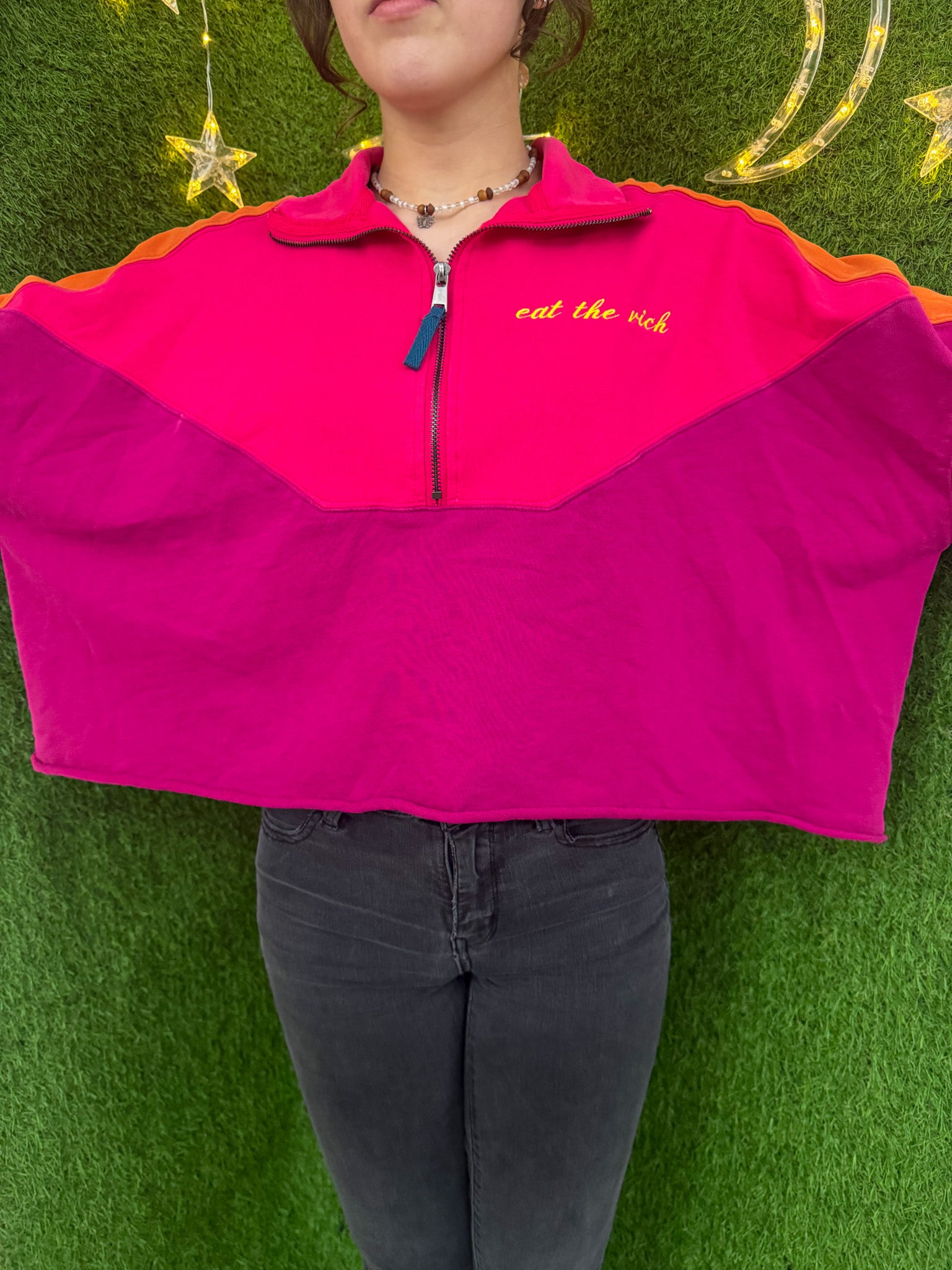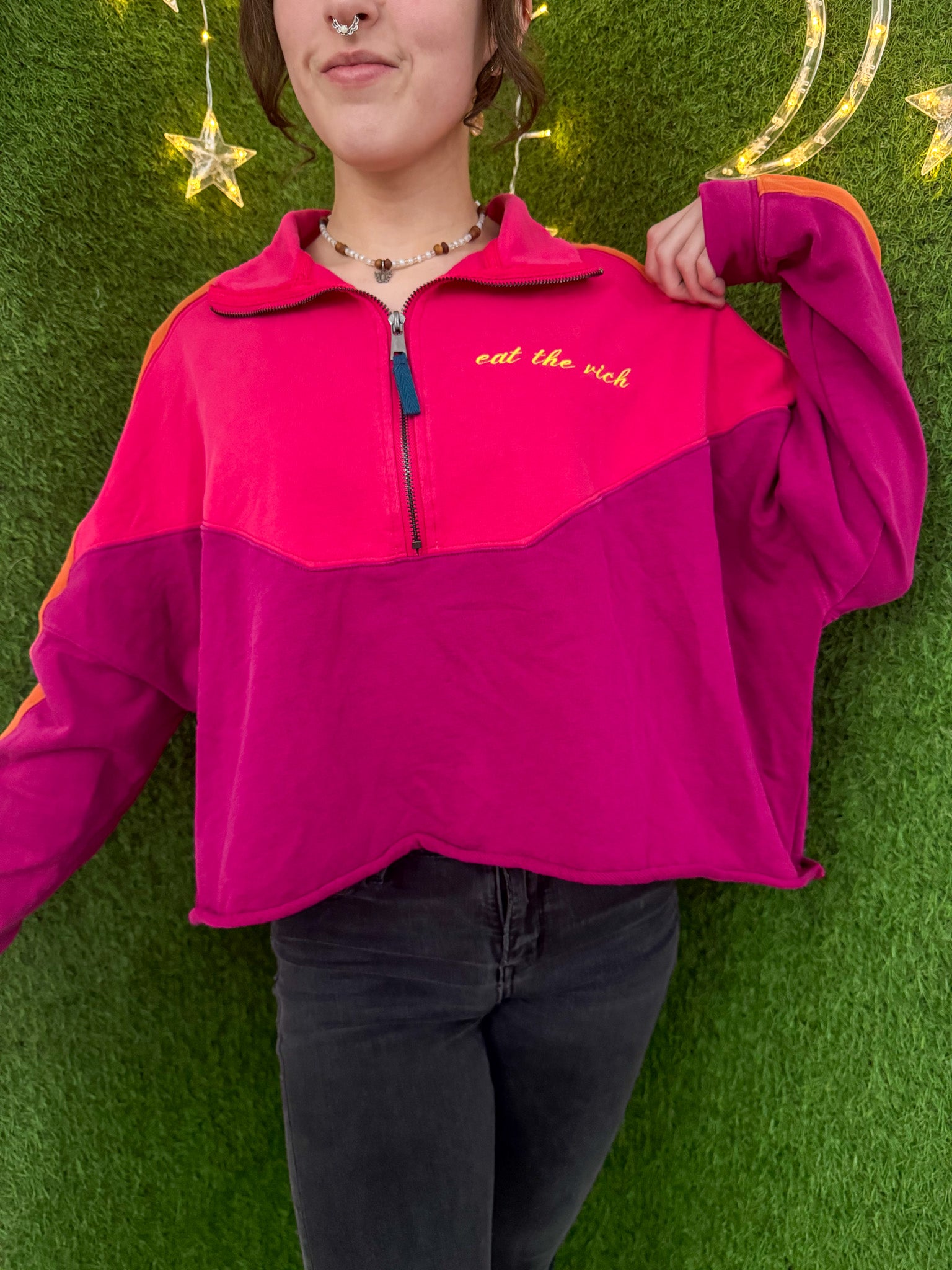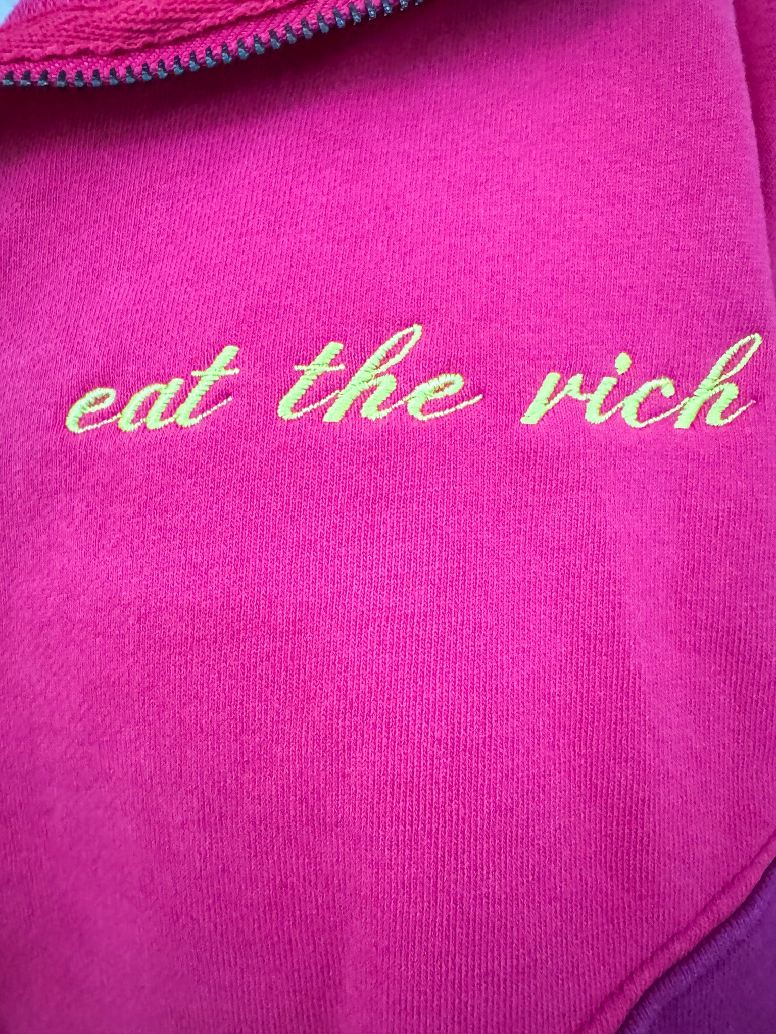 Join the slow fashion movement with our Eat the Rich Funky Cropped Quarter Zip Crewneck. This top is embroidered, upcycled, and made sustainably from a secondhand garment. Support our small biz while making a statement with this unique, eco-friendly piece!