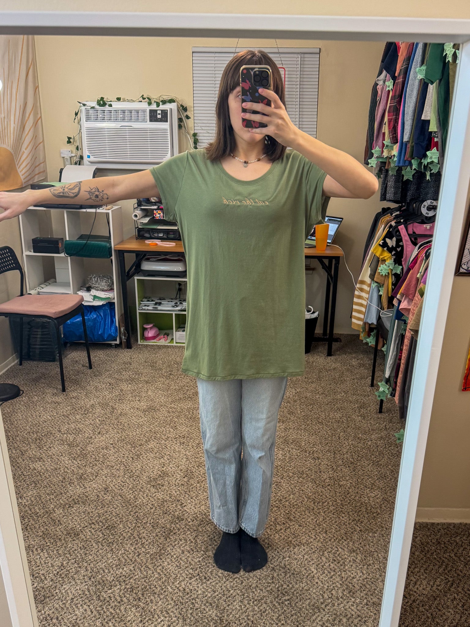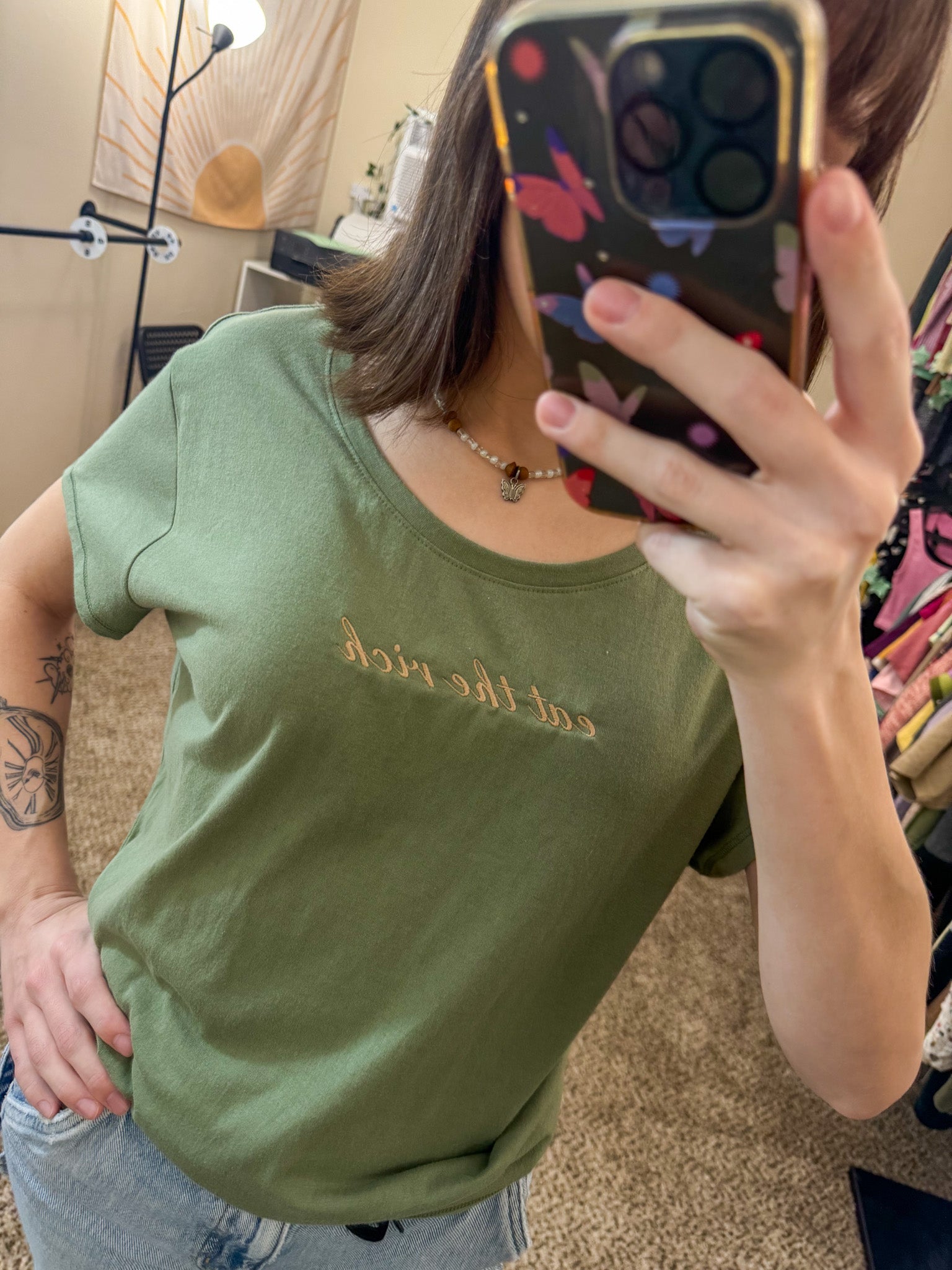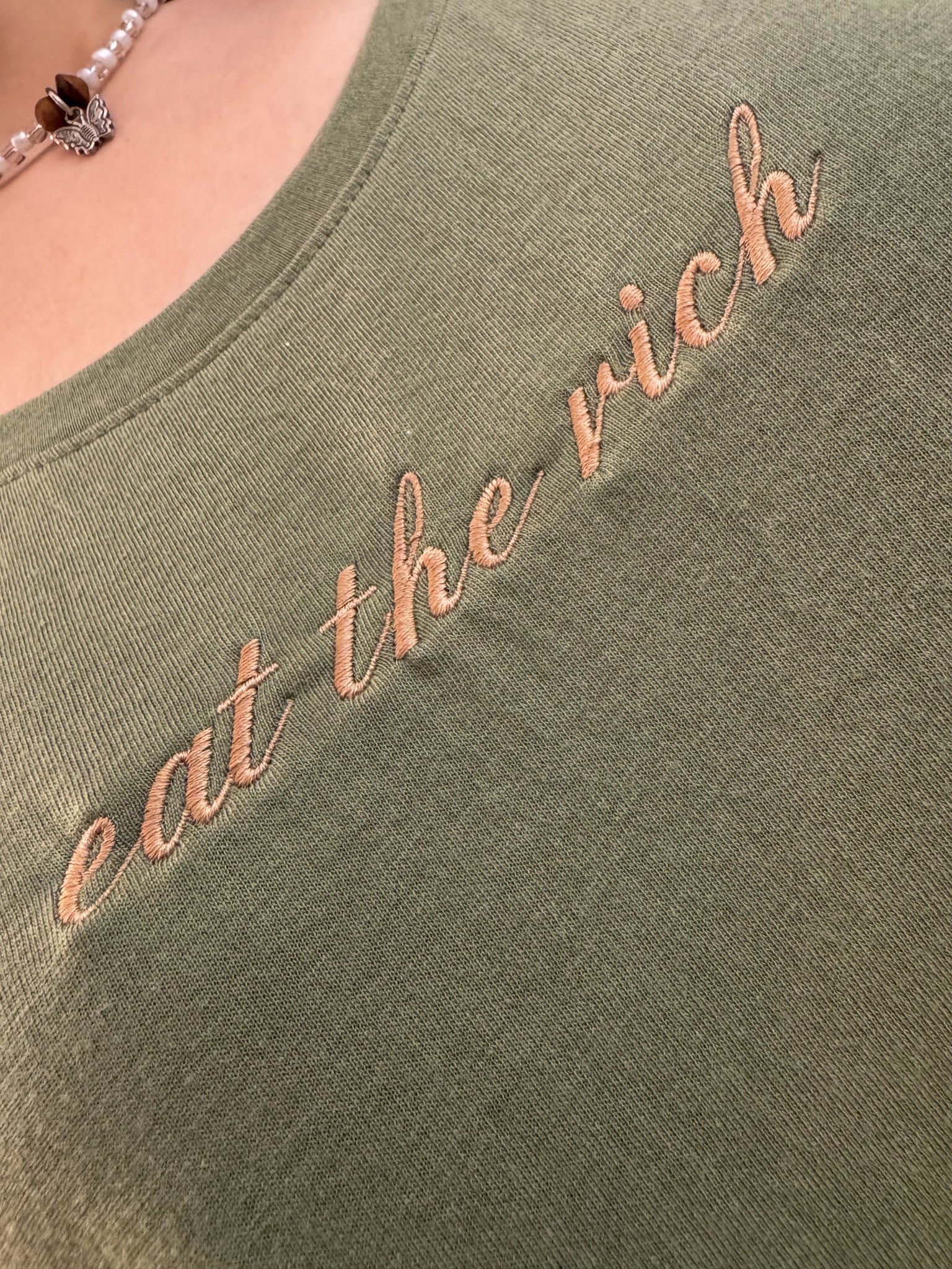 Indulge in the Eat The Rich Green T-Shirt, lovingly embroidered by our small biz. This upcycled and sustainable piece is made from a discarded secondhand garment, embodying slow fashion. Support ethical fashion with this one of a kind addition to your wardrobe!