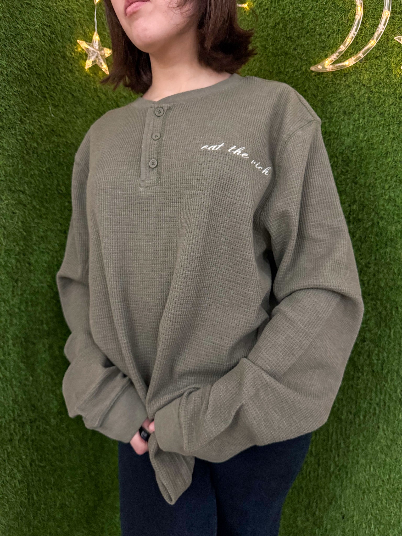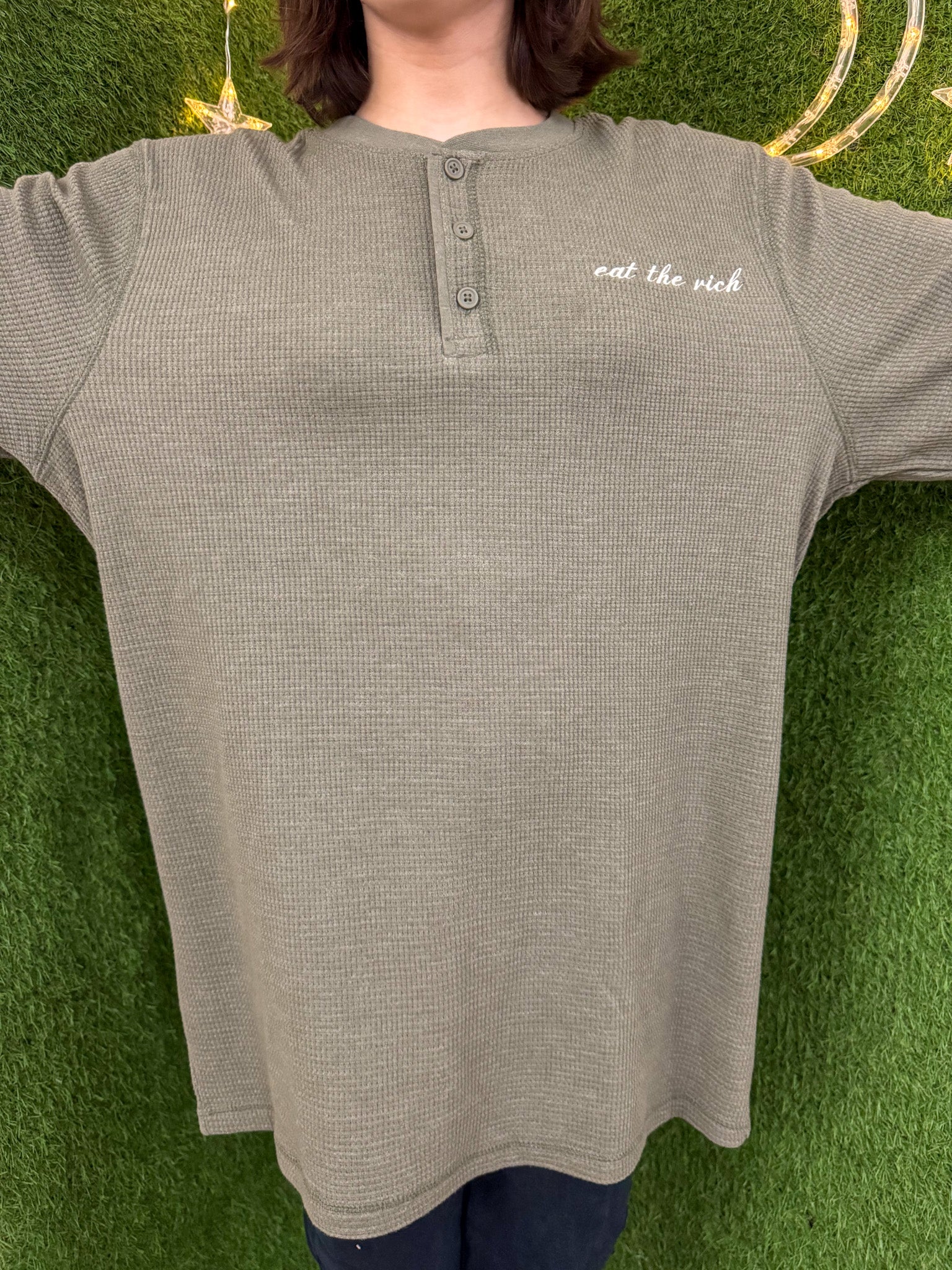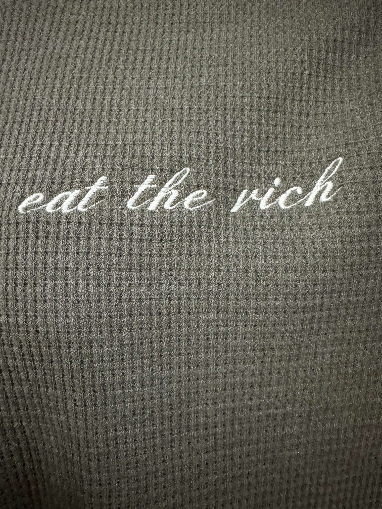 Introducing the Eat the Rich Green Thermal Button Up Long Sleeve. Embroidered to perfection, this upcycled and sustainably made garment supports our small biz and promotes slow fashion. A secondhand treasure that elevates your wardrobe with style and ethics. Join the movement!!