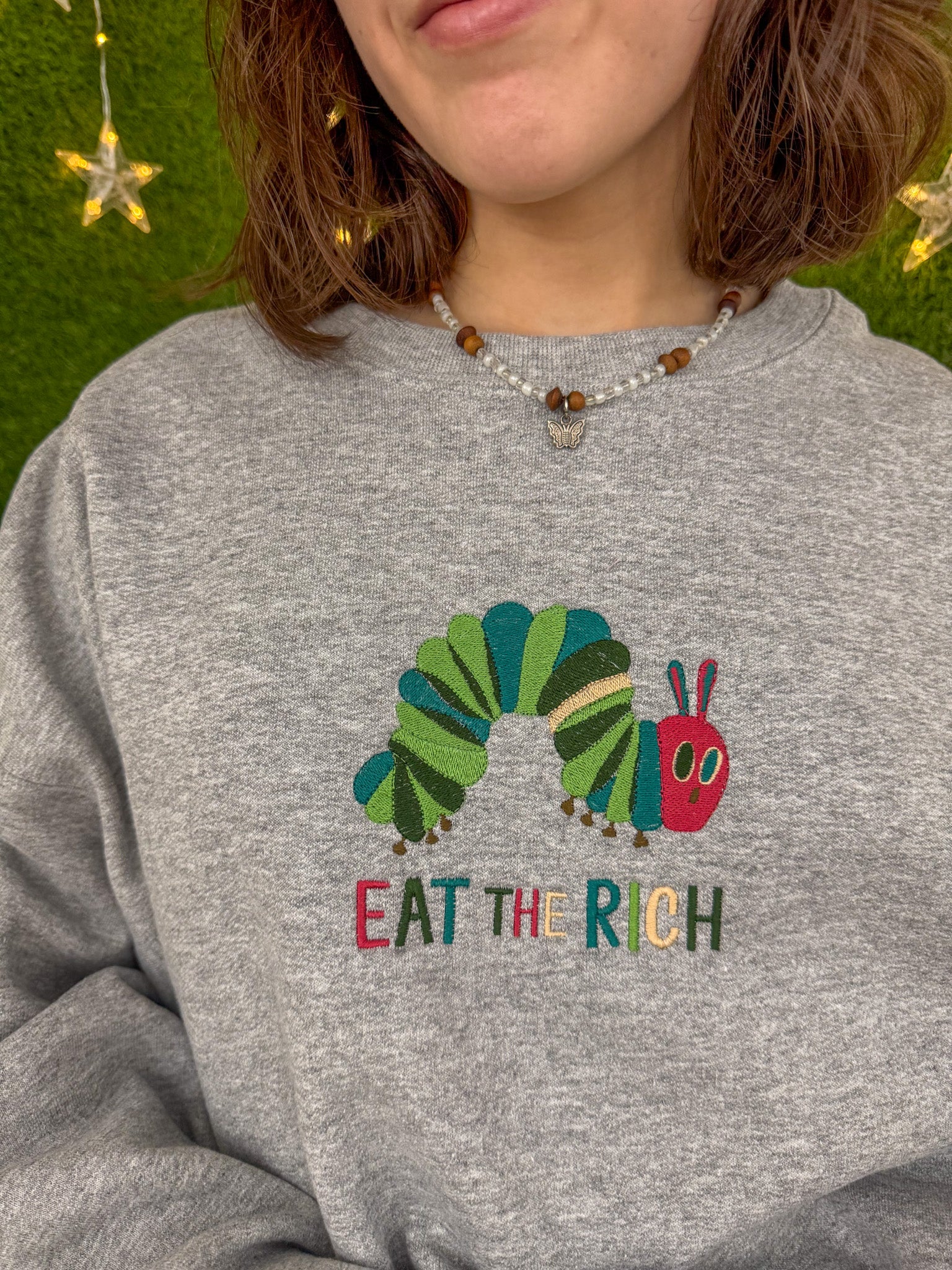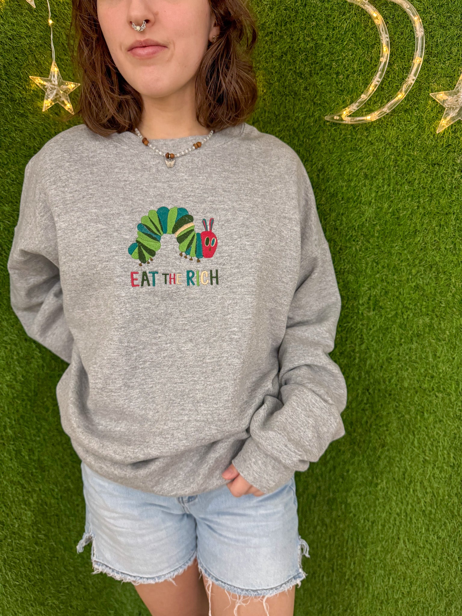 Upgrade your wardrobe with our Eat the Rich Grey Crewneck Sweatshirt. Made from an upcycled, secondhand garment, this sustainable piece supports small businesses and promotes slow fashion. With intricate embroidery, it's a statement of style and eco-consciousness<3