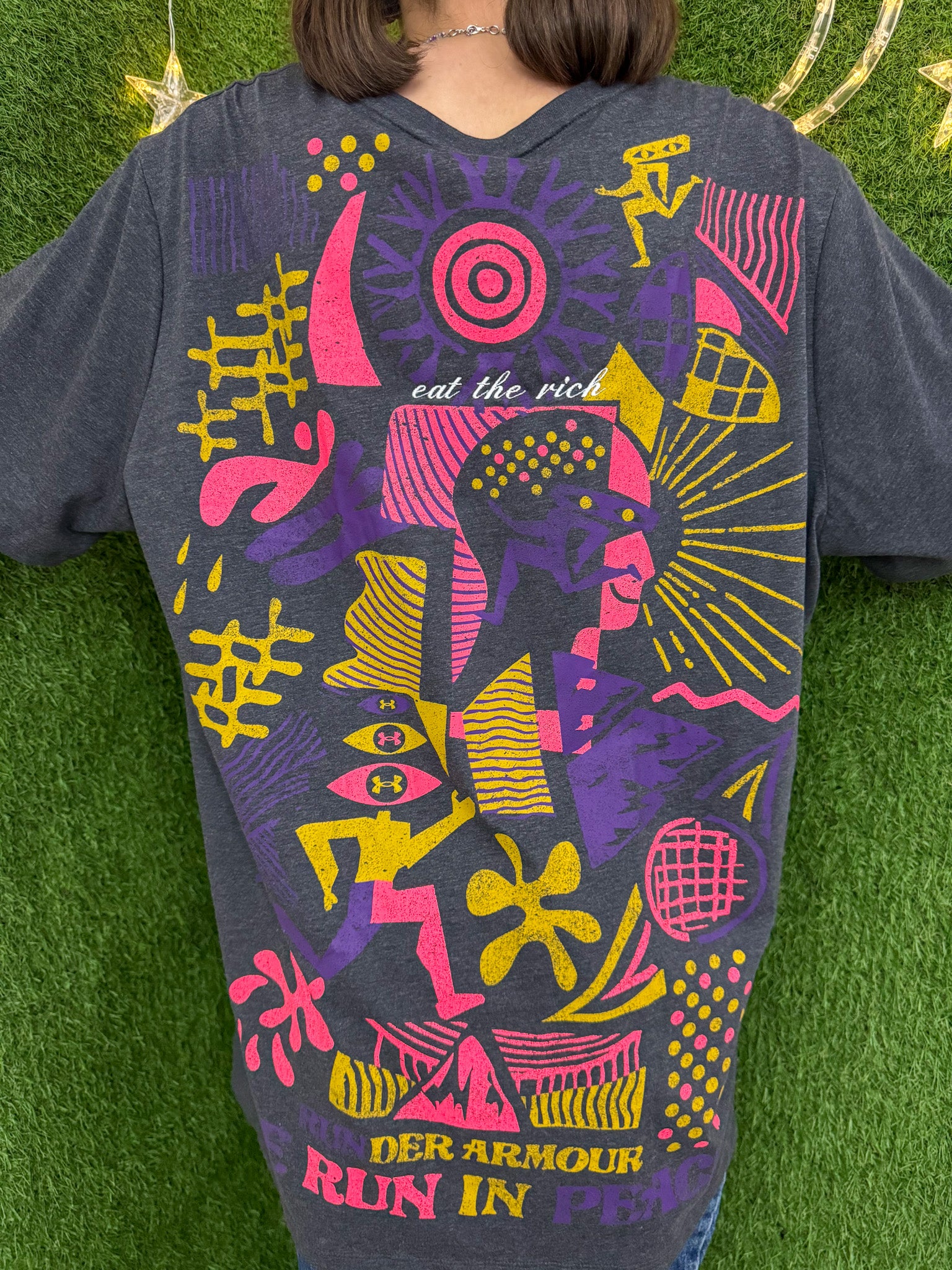 Ditch wasteful fast fashion for sustainable slow fashion with our Eat the Rich Under Armor Tee. Made from upcycled secondhand garments, each shirt is embroidered with a unique design to support small businesses. Look good, feel good, and make a positive impact on the environment<3