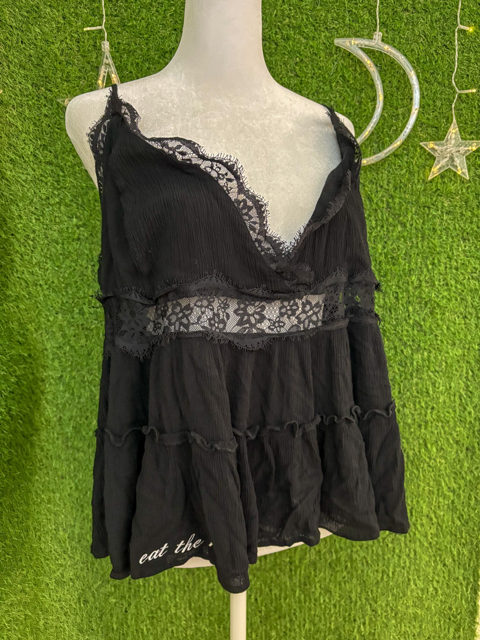 This Eat the Rich Lacey Tank is a unique, embroidered piece upcycled from a secondhand garment. Embracing sustainable and slow fashion principles, it offers an eco-friendly choice that combines style with conscious living!