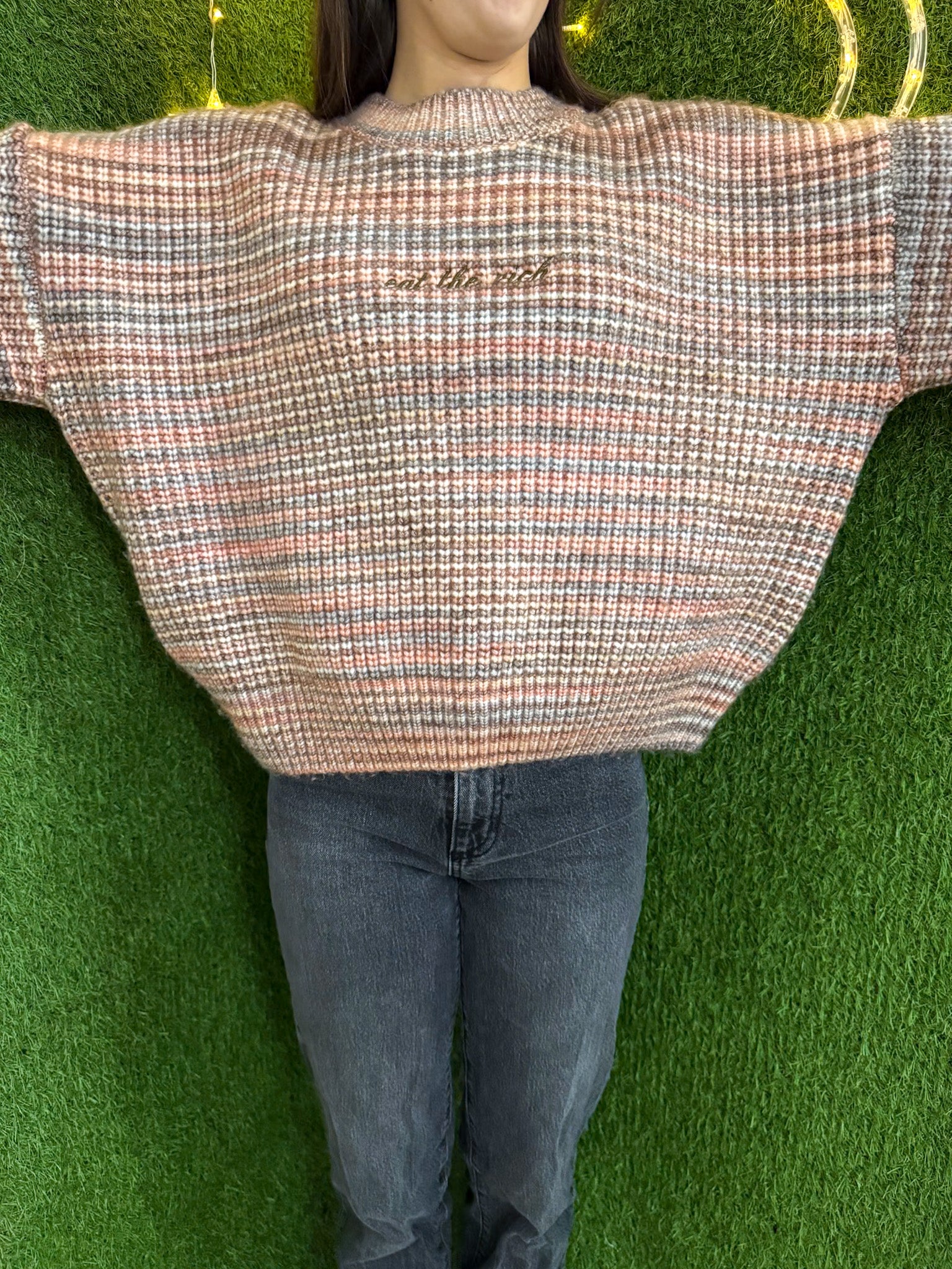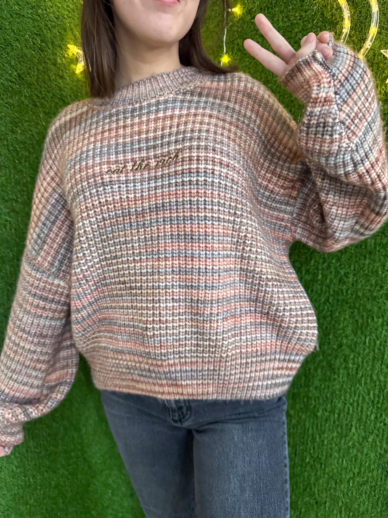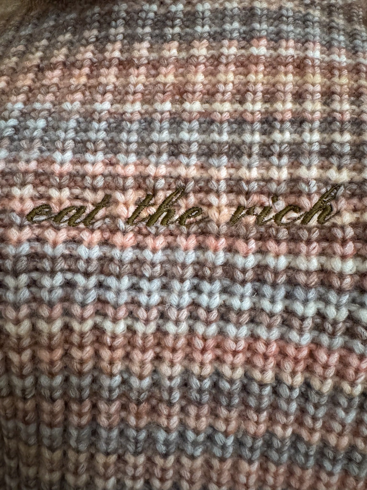 Introducing the Eat the Rich Pink Striped Sweater, an embroidered, upcycled, and sustainable secondhand garment. Support our small biz and embrace slow fashion<3