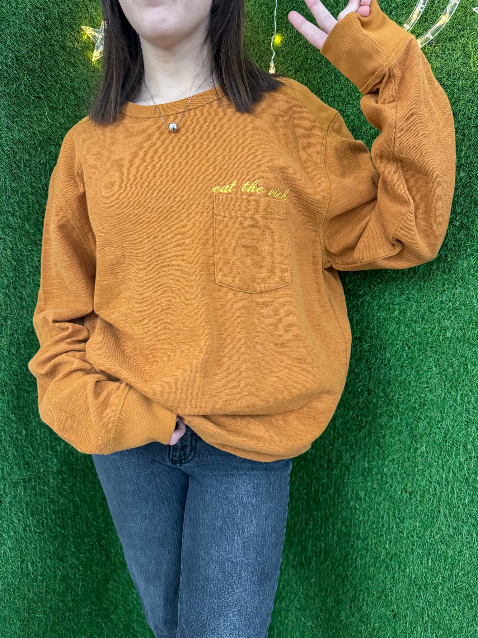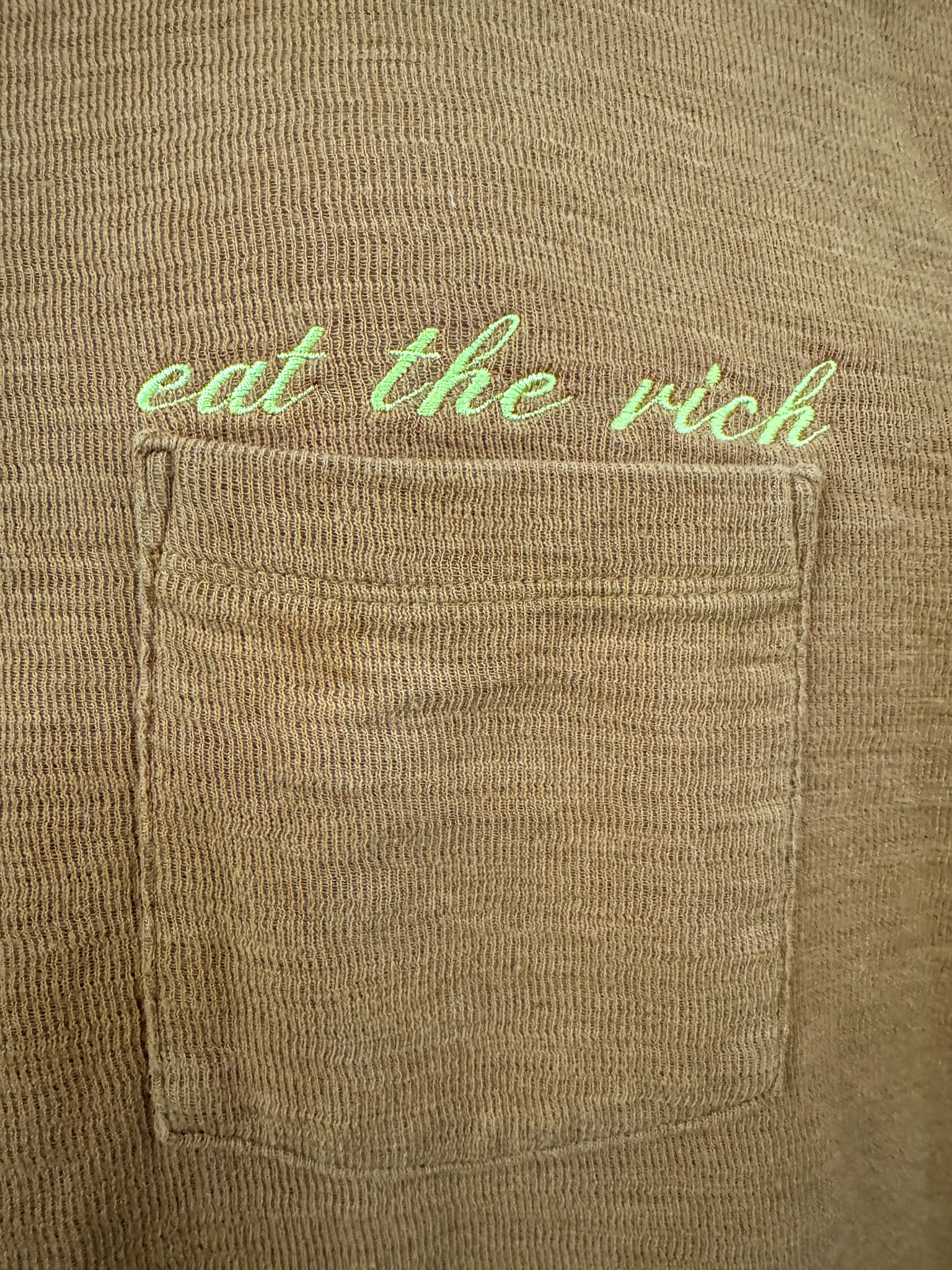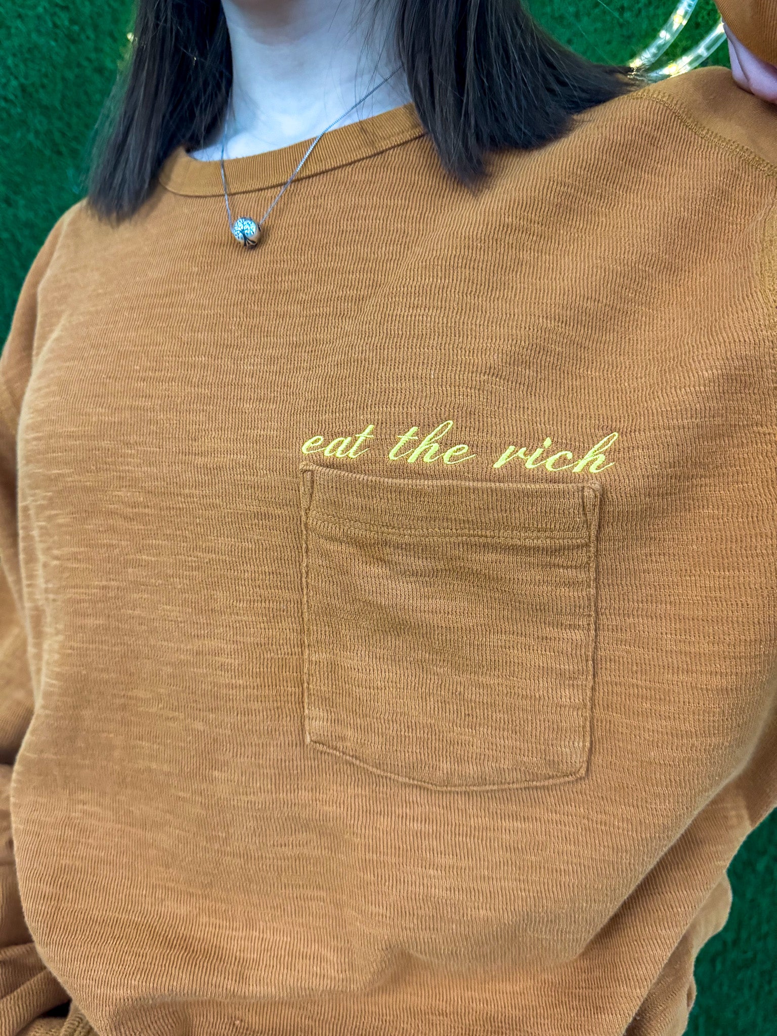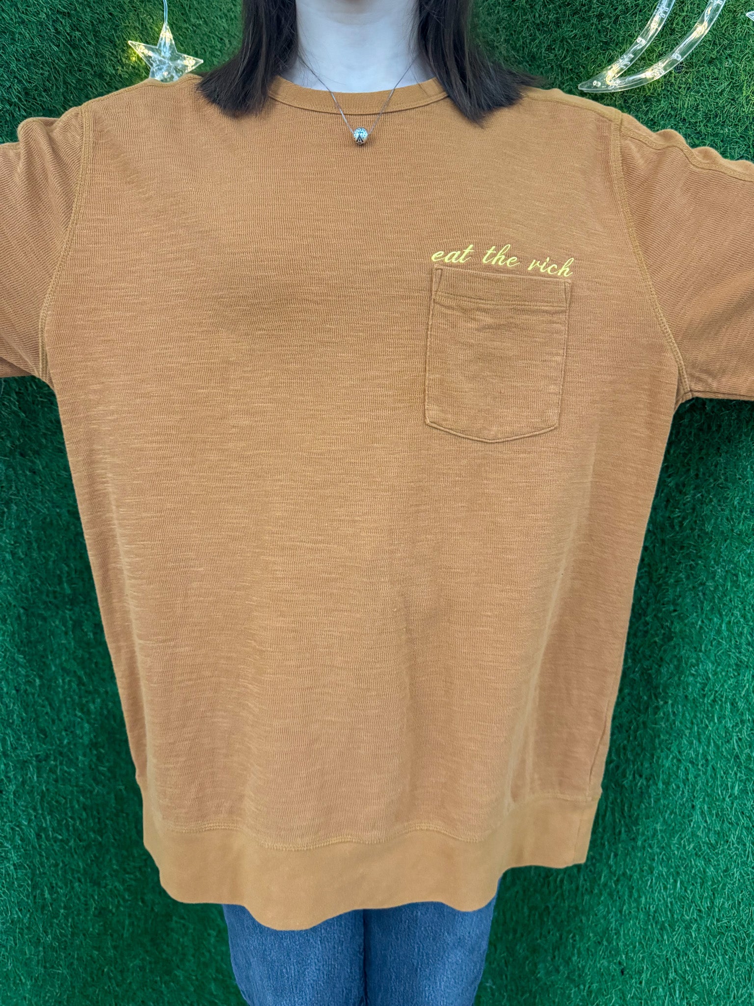 Upgrade your wardrobe with the Eat The Rich Pocket Long Sleeve -the perfect blend of fashion and sustainability. Made from upcycled, secondhand garments, this embroidered top supports small businesses and promotes slow fashion. Stay stylish and eco-friendly with this must-have piece!
