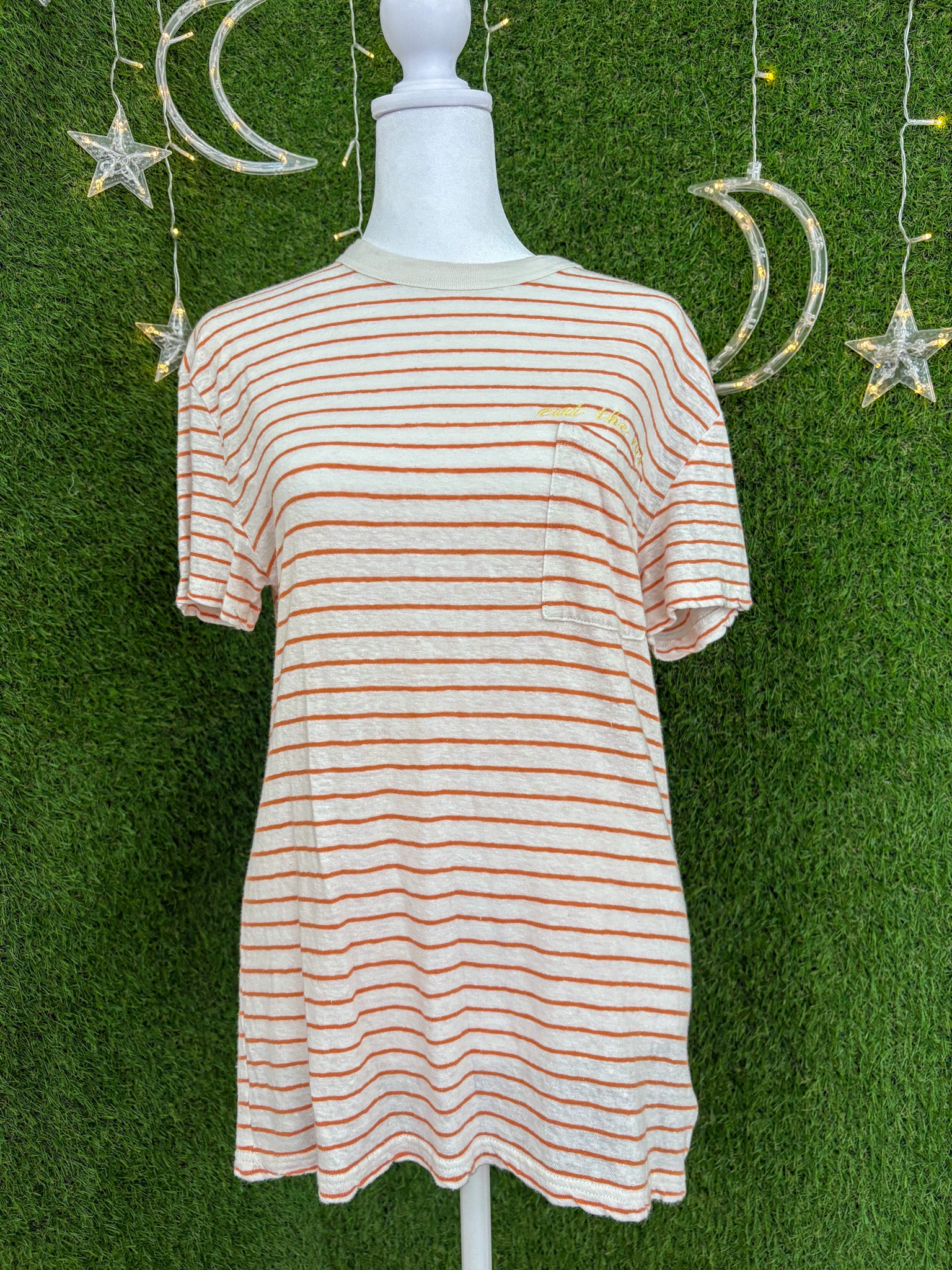 The Eat the Rich Striped Pocket Tee is an embroidered, upcycled piece made from secondhand fabric. Supporting small businesses and slow fashion, it offers a sustainable style choice<3