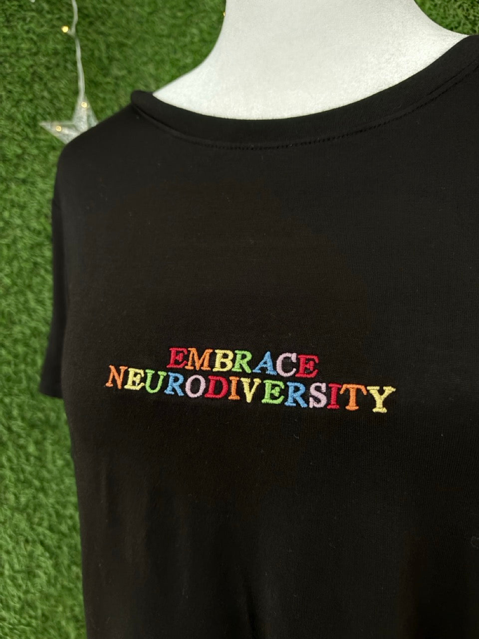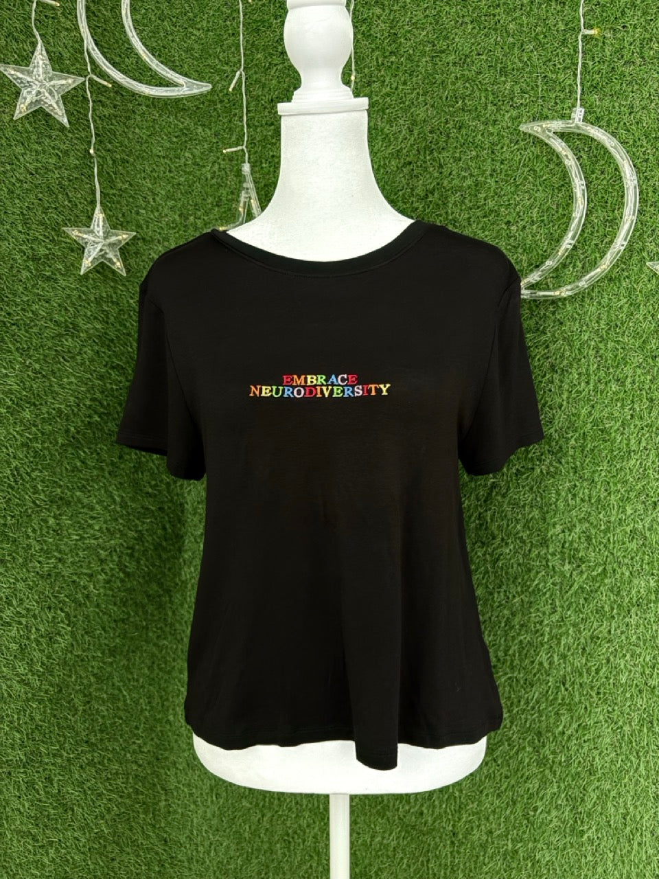 This black tee blends playful style with slow fashion values, crafted sustainably to celebrate neurodiversity while keeping your wardrobe conscious and cool.