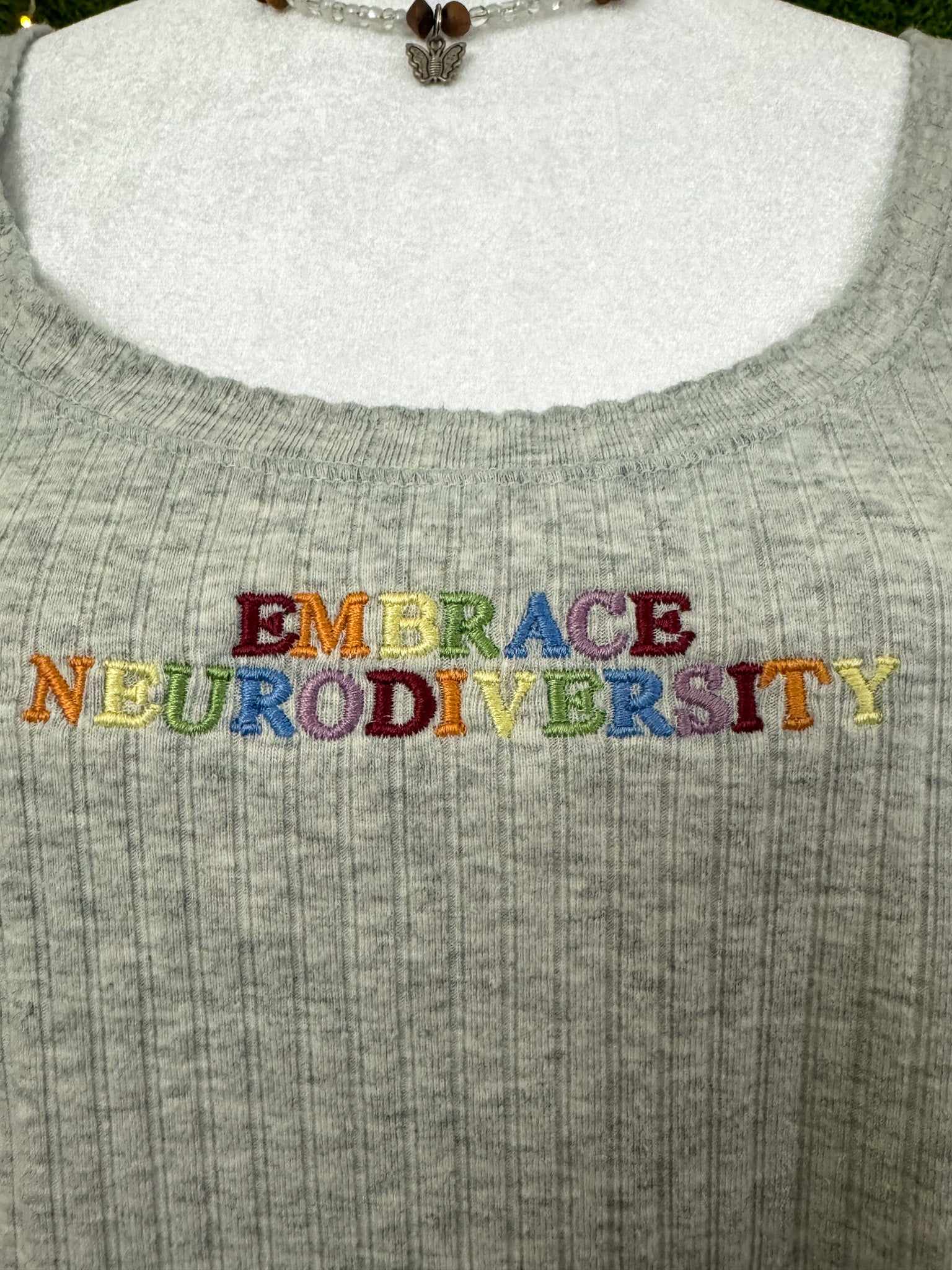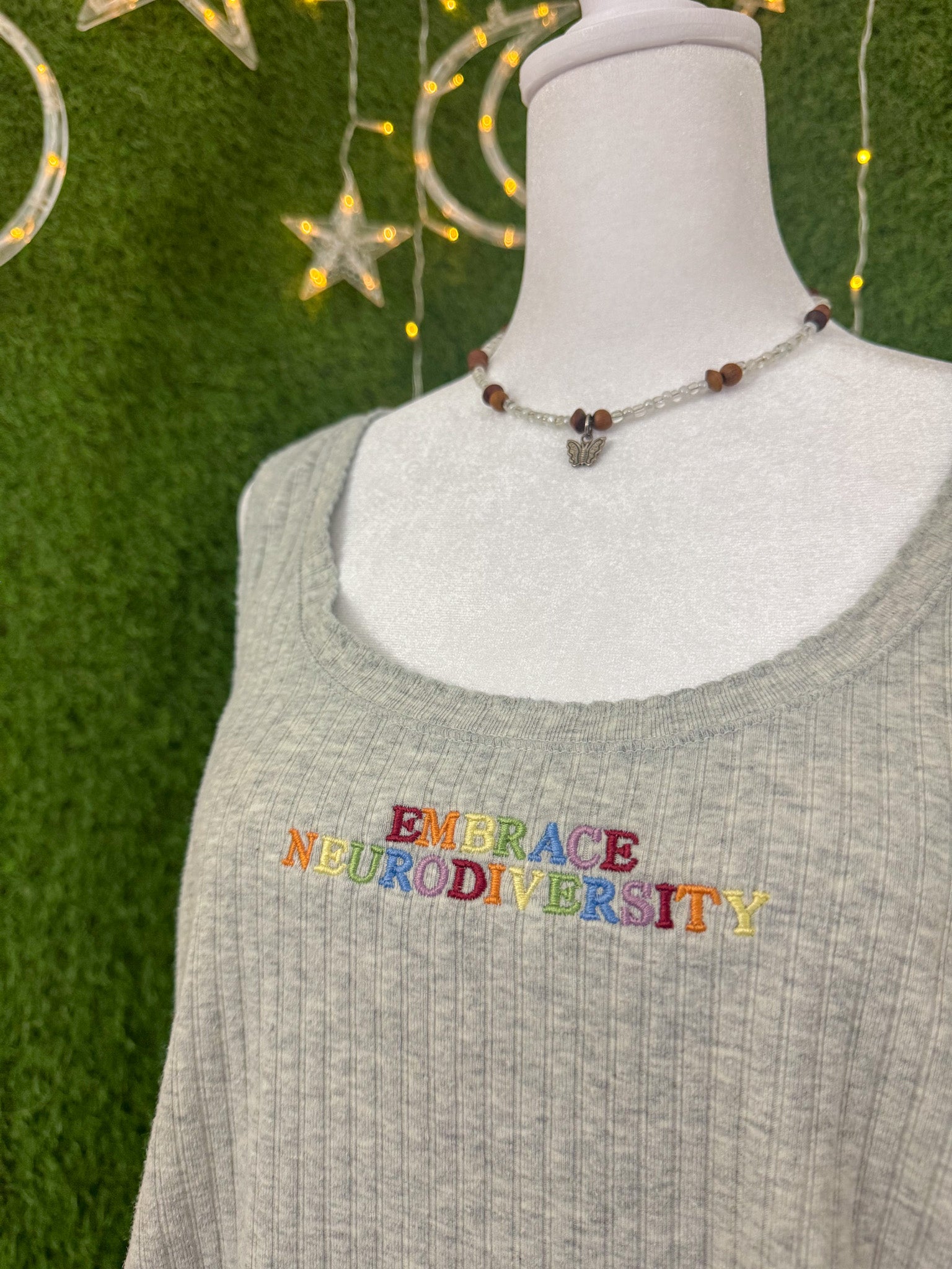 This grey cropped tank celebrates neurodiversity with delicate embroidery on an upcycled, secondhand garment. Crafted with care to support small businesses, it embodies sustainable, slow fashion values for a mindful wardrobe!