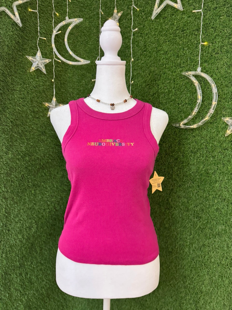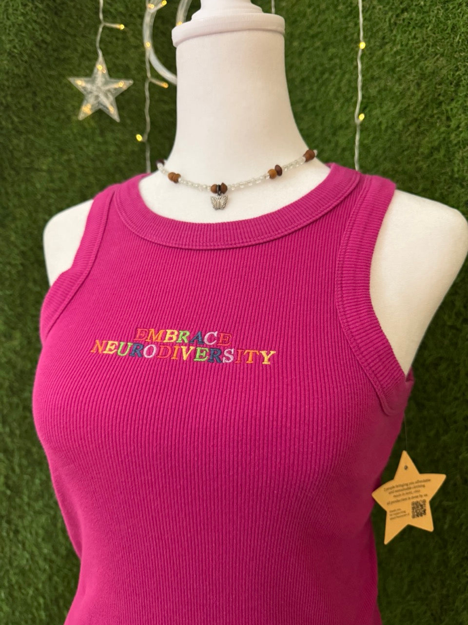 Celebrate uniqueness with the Embrace Neurodiversity Magenta Tank! This playful piece features vibrant embroidery on a lovingly upcycled secondhand garment, blending style with sustainability. Perfect for those who champion slow fashion, it’s a bold way to show pride and care for the planet—one stitch at a time!