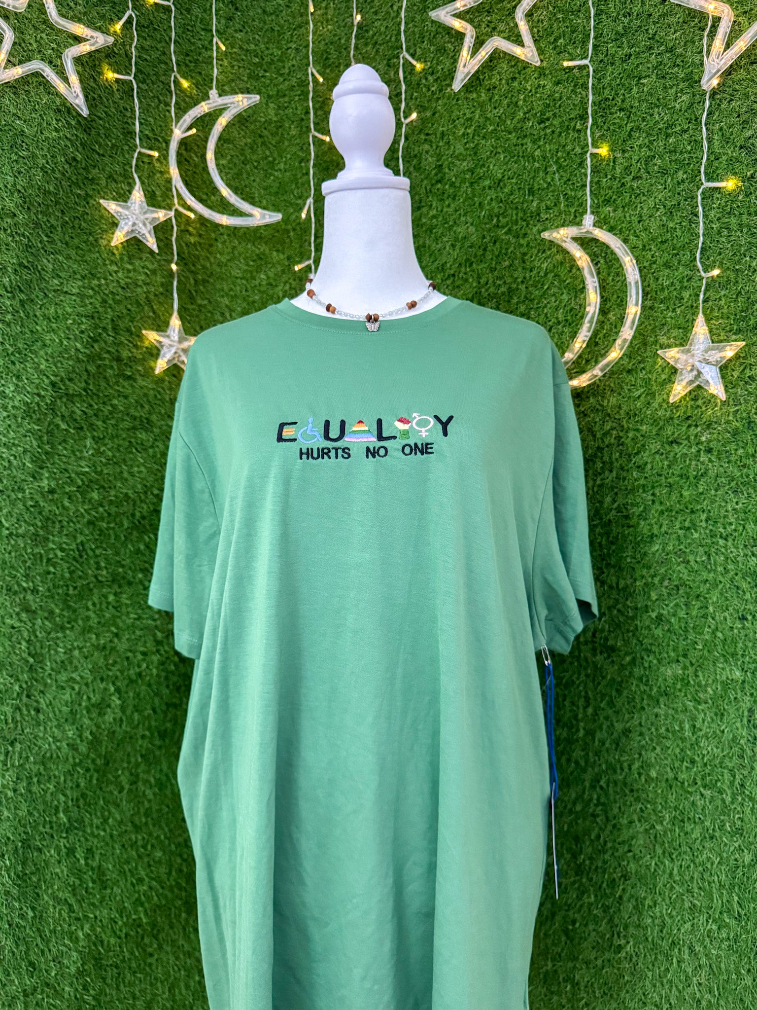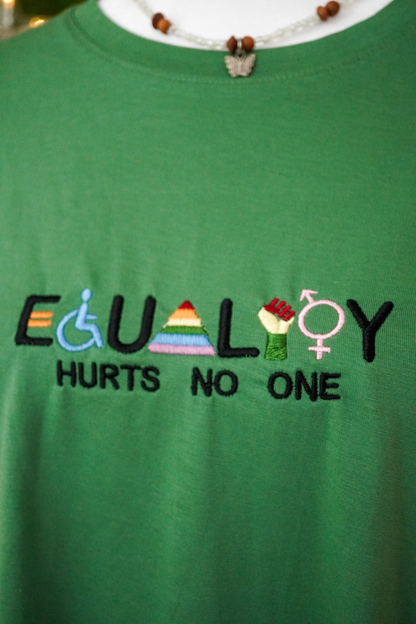This green t-shirt features delicate embroidery, thoughtfully upcycled on a secondhand garment. Embrace sustainable, slow fashion while supporting a small business committed to eco-friendly practices! Equality Hurts No One—wear your values with pride!