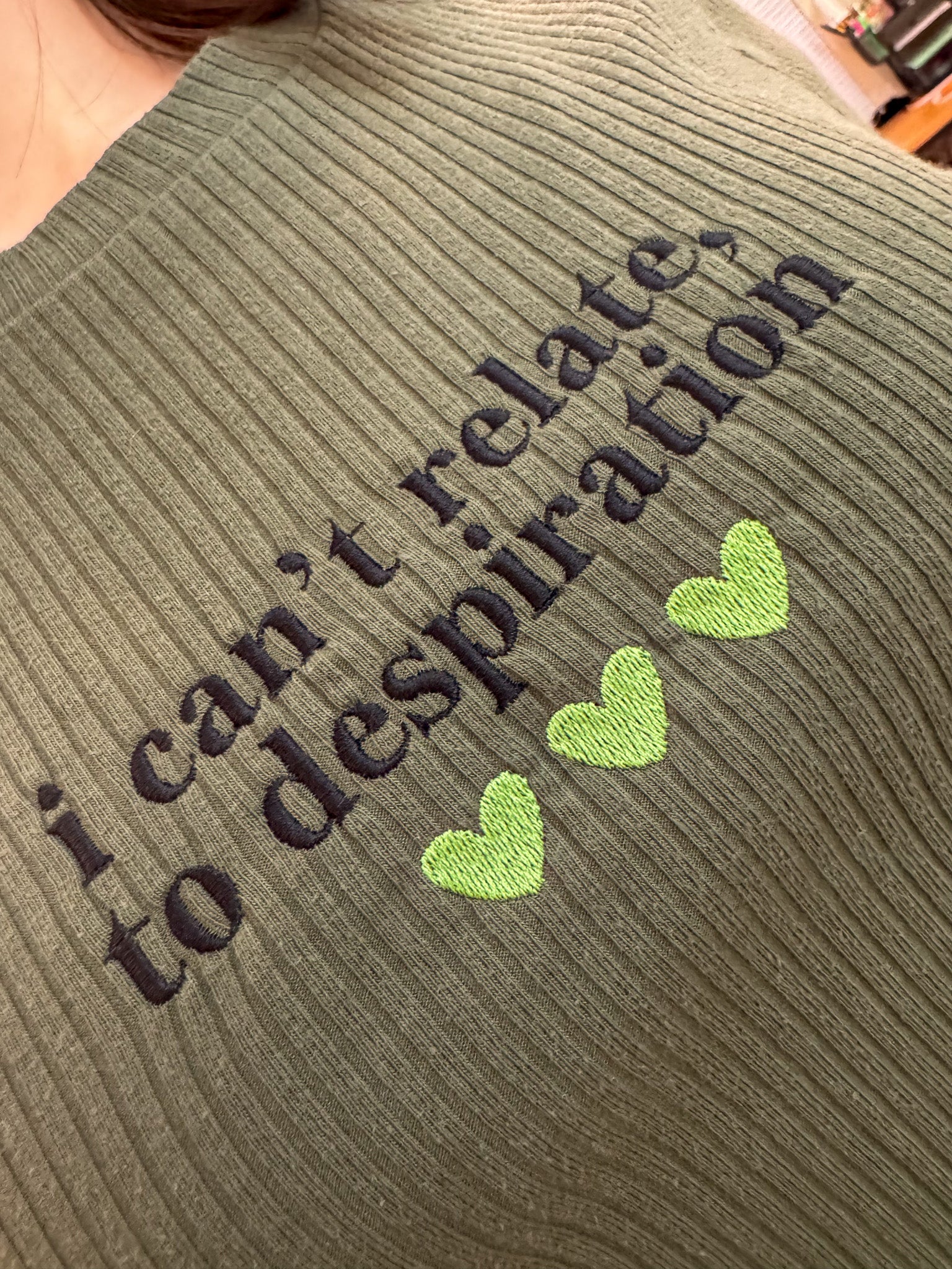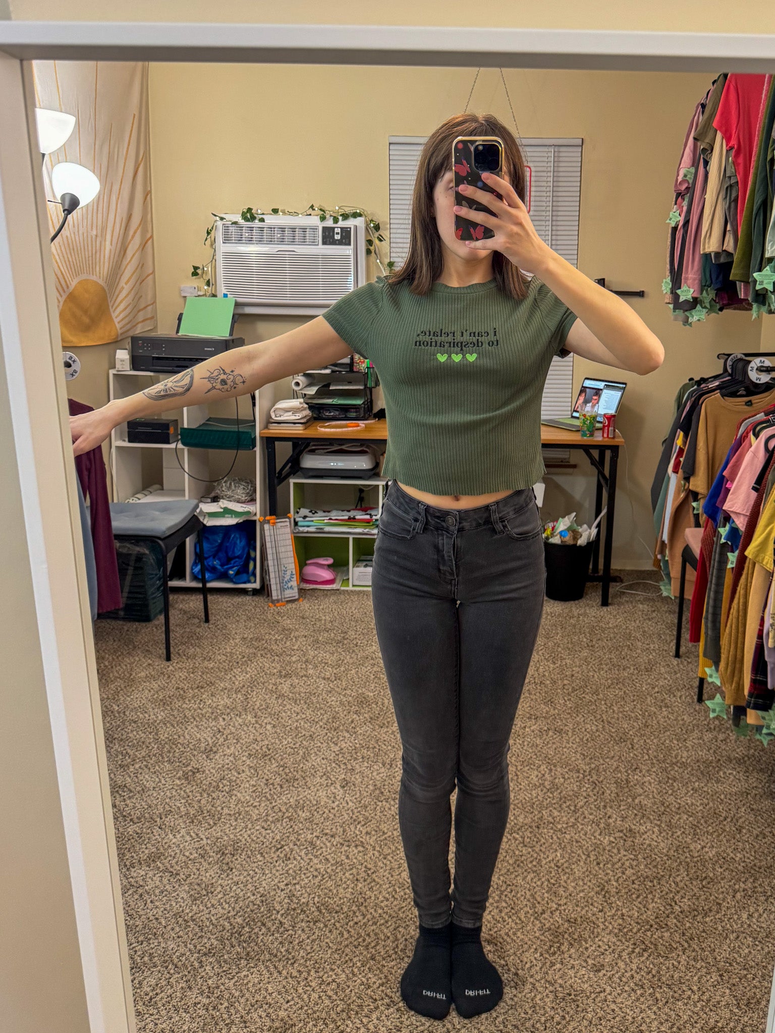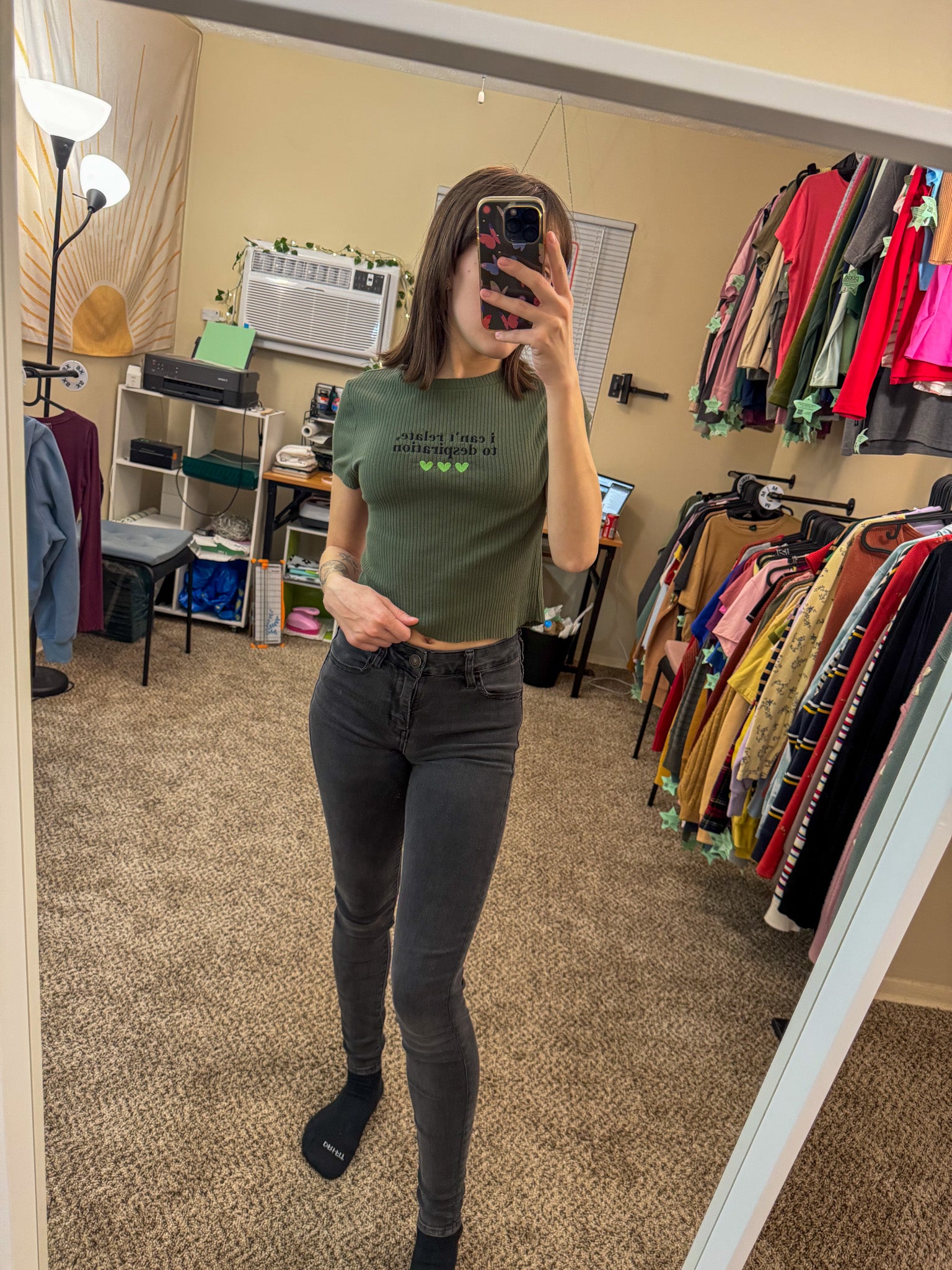 Rock this one-of-a-kind Espresso Green Ribbed Baby Tee, embroidered by us and upcycled from a discarded secondhand garment. Support our small biz and sustainable slow fashion with every wear!