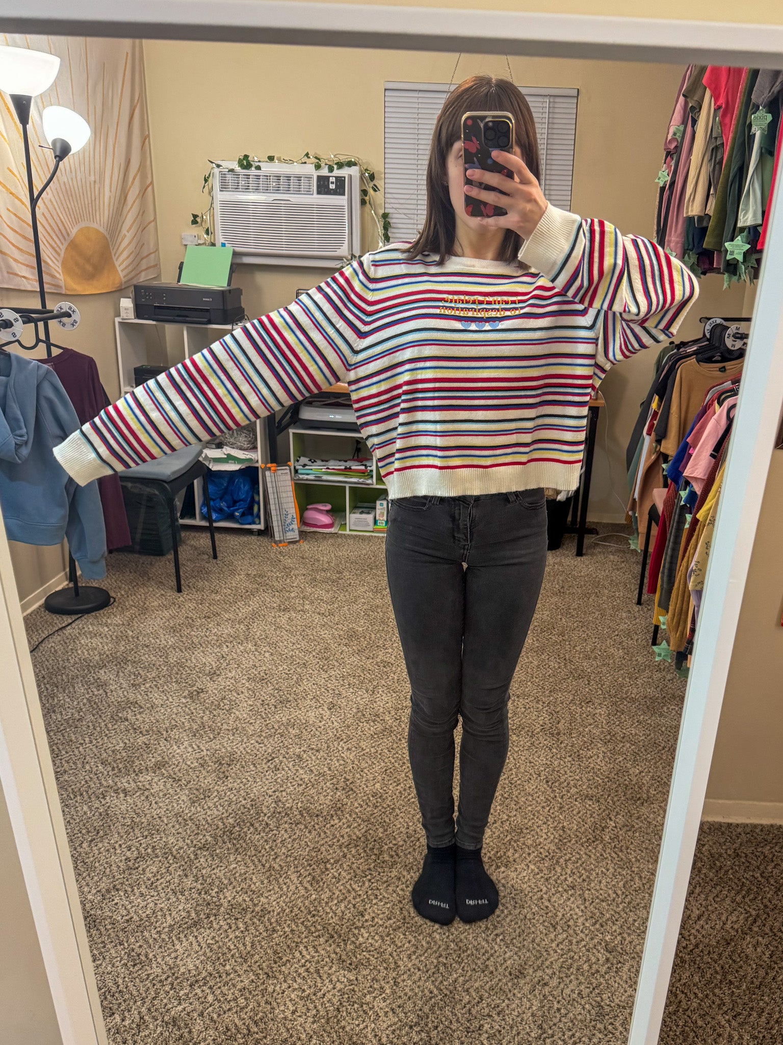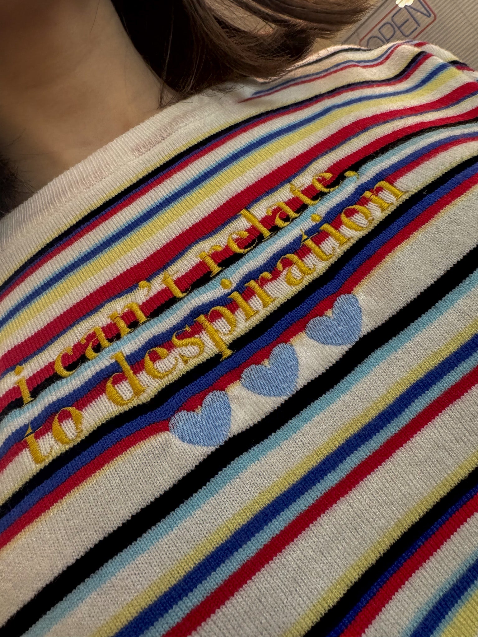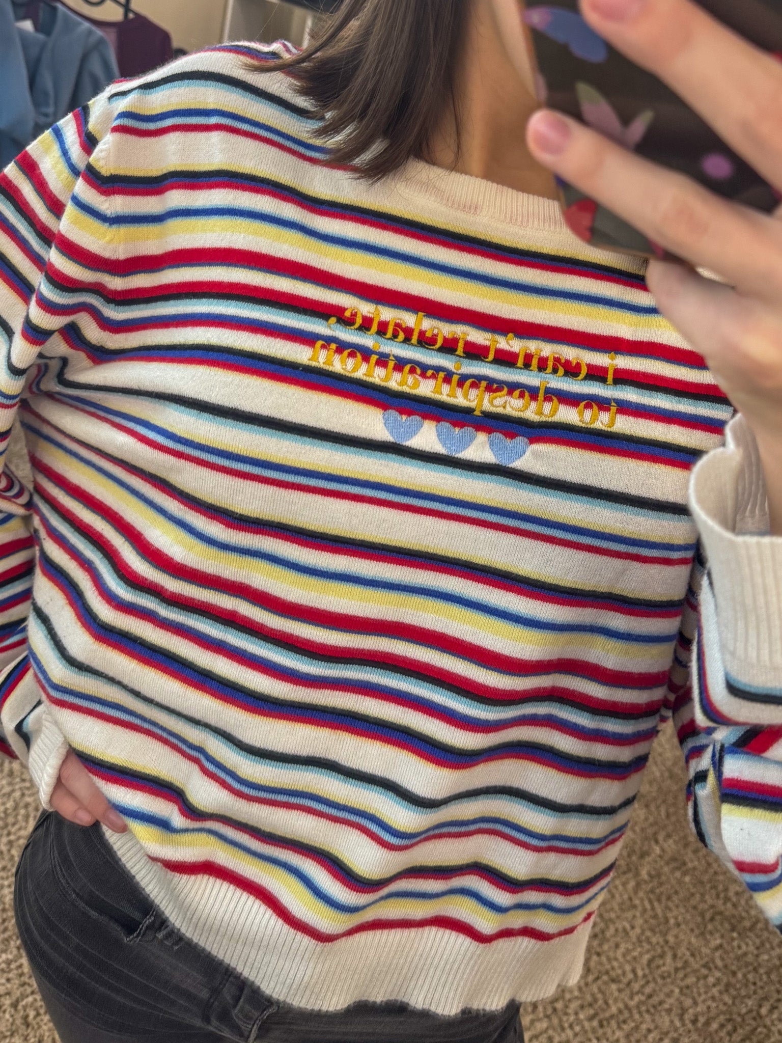 This unique Espresso Striped Sweater is more than meets the eye. Embroidered by us, it not only looks great but also supports our small biz! Upcycling a discarded secondhand garment, it's a sustainable and slow fashion choice. Join our quirky, fun-loving community and make a statement with this one-of-a-kind sweater!