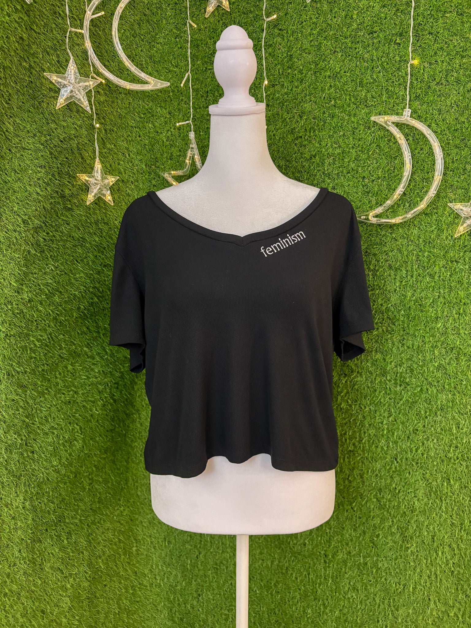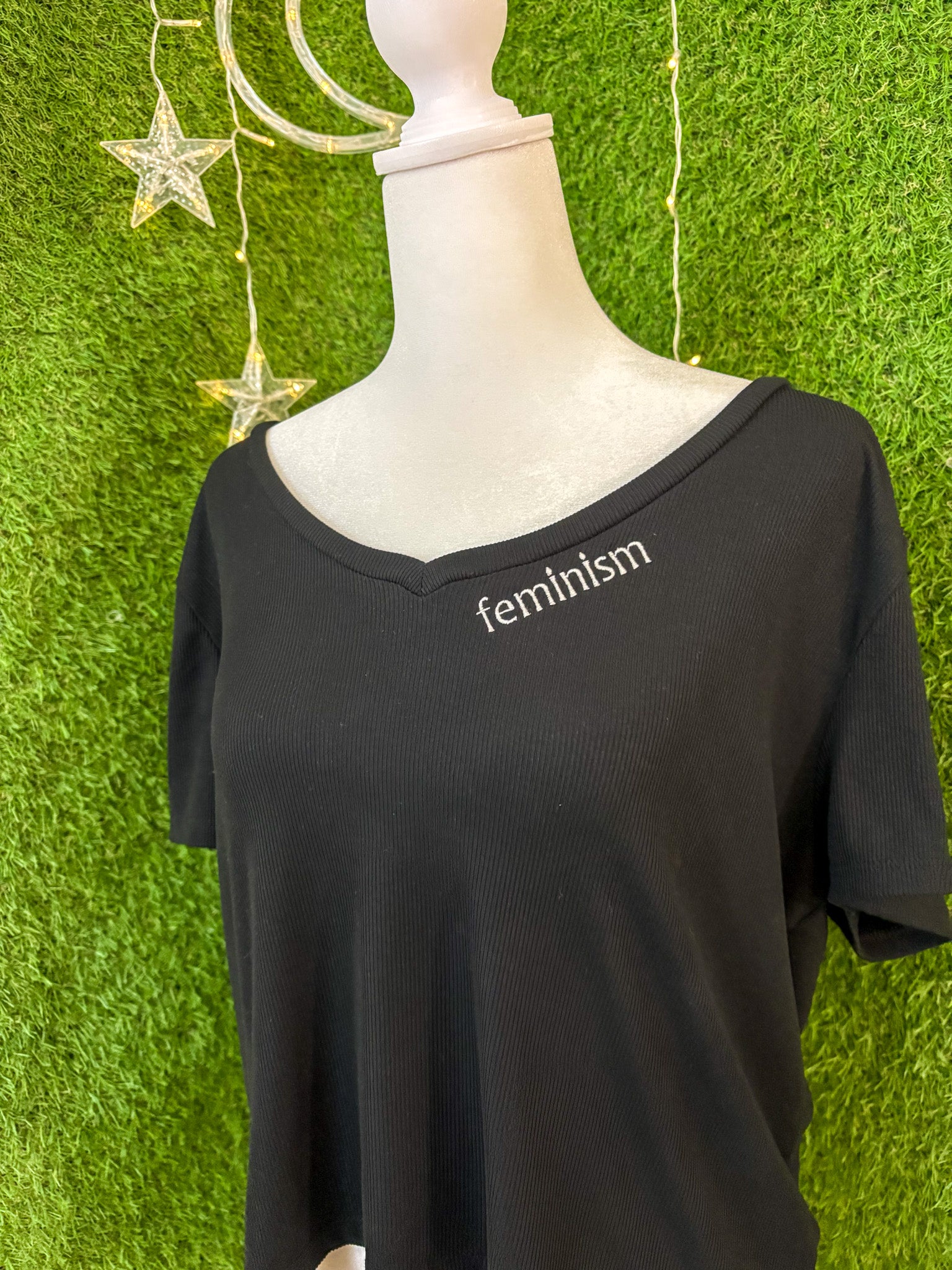 This Feminism V-Neck Cropped Tee is a sustainable choice upcycled from a secondhand top. Featuring delicate embroidery, it embraces slow fashion values while making a bold statement. Perfect for eco-conscious wardrobes seeking style with purpose!