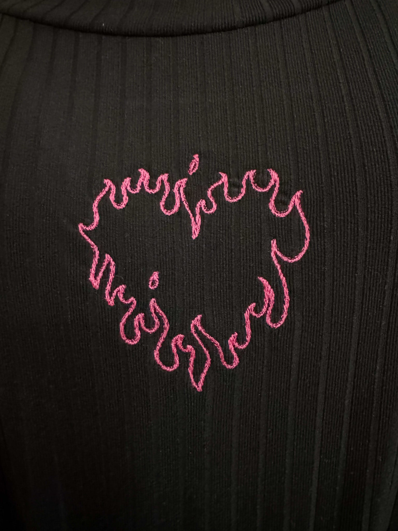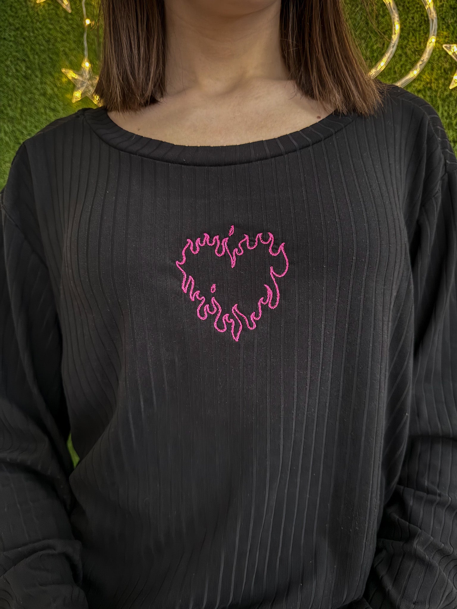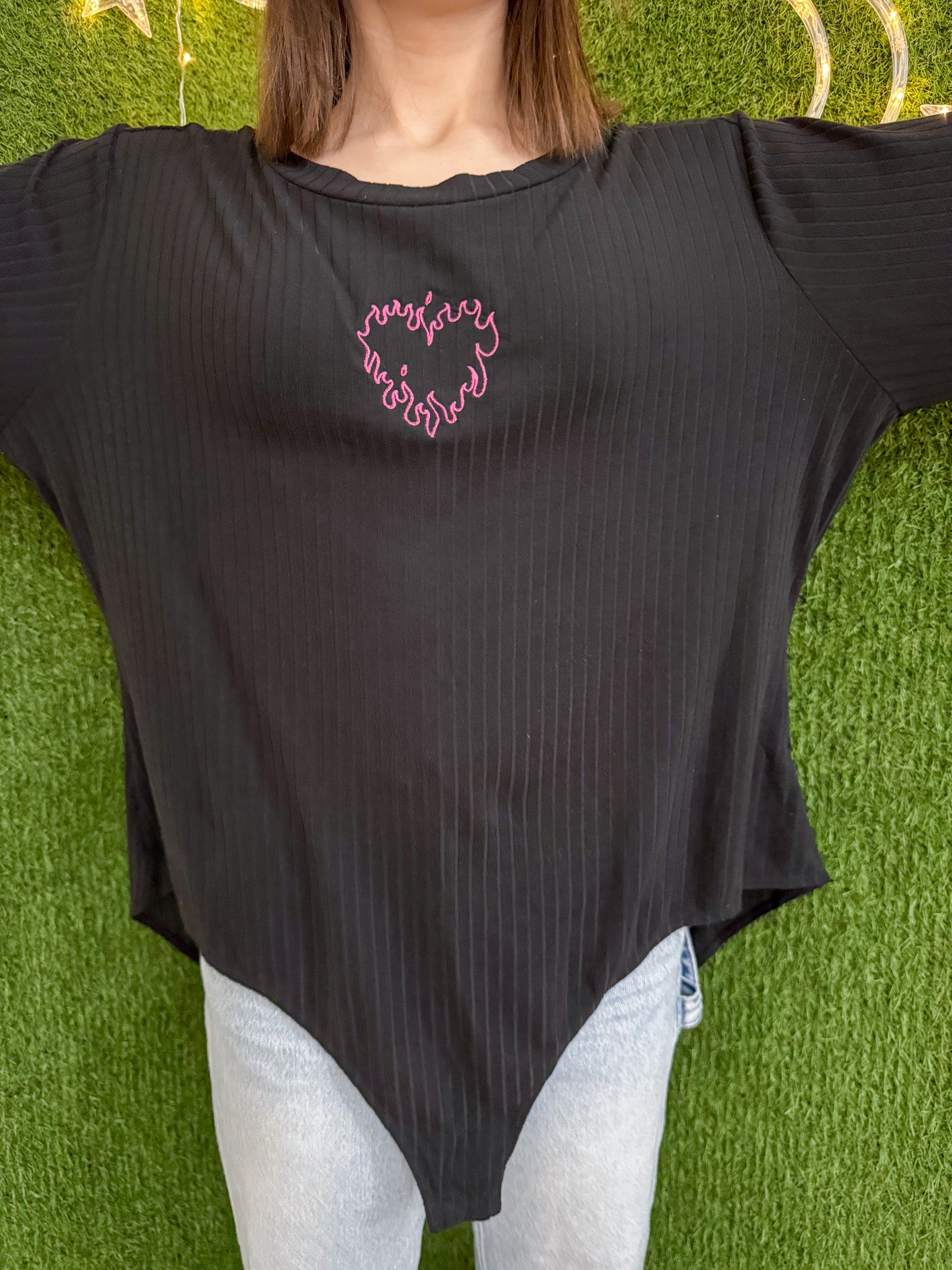 Stay trendy and eco-friendly with our Flame Heart Long Sleeve Bodysuit! This embroidered secondhand garment supports small businesses and promotes sustainable slow fashion. Help reduce waste and look good doing it!