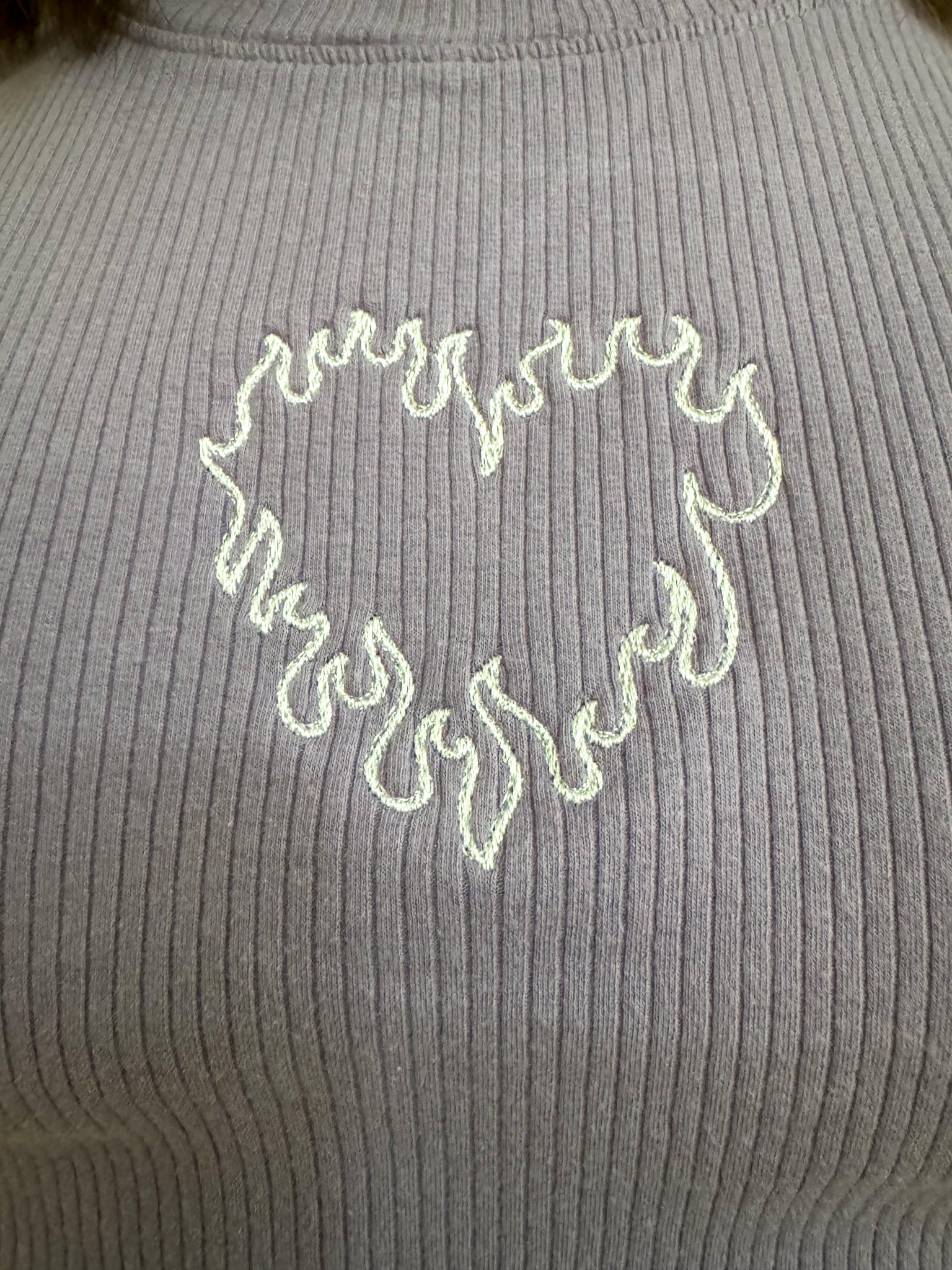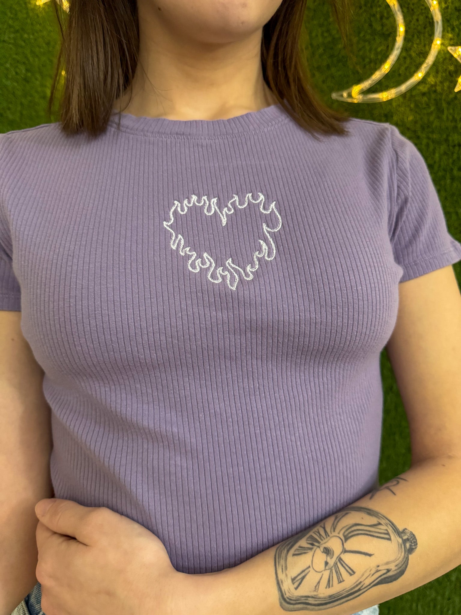 Flaunt your fiery fashion with our Flame Heart Purple Baby Tee. This embroidered tee is not only stylish, but it also supports our small biz. Plus, it's upcycled, sustainable, and part of the slow fashion movement. Look good, feel good, do good!