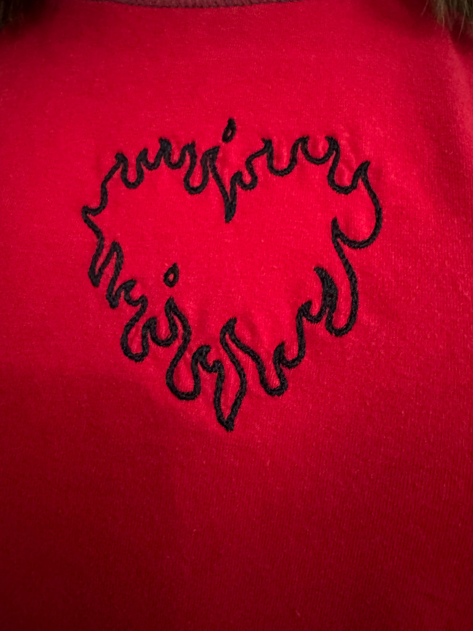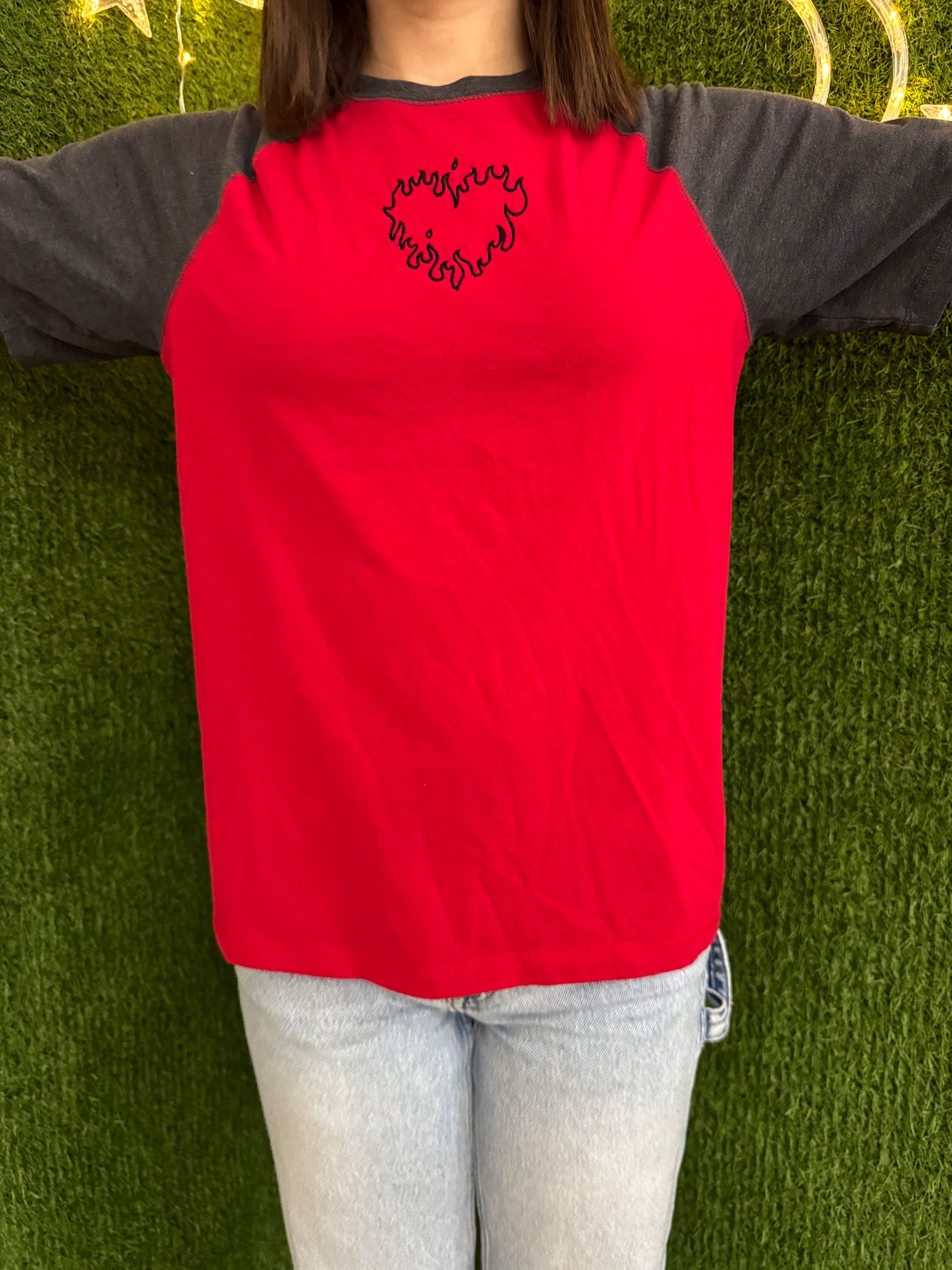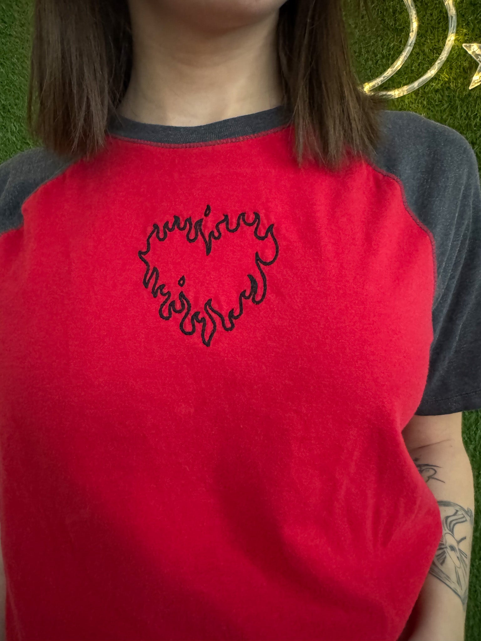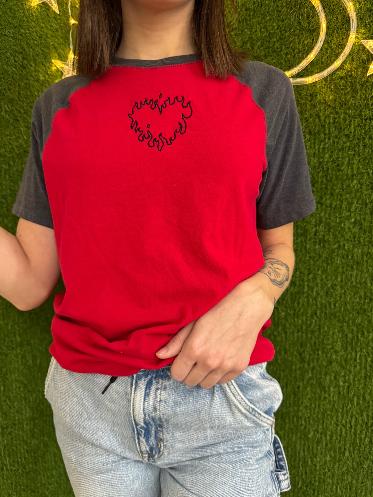 Join the movement with our Flame Heart T-Shirt! This red and grey shirt is not only eye-catching with its embroidered design, but also supports small businesses and sustainable fashion through its upcycled and secondhand materials. Join us in slow fashion and make a statement!